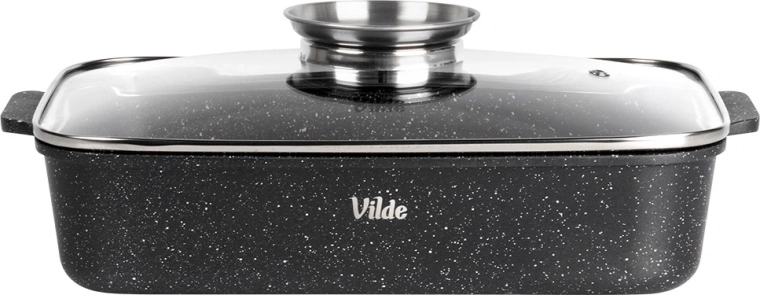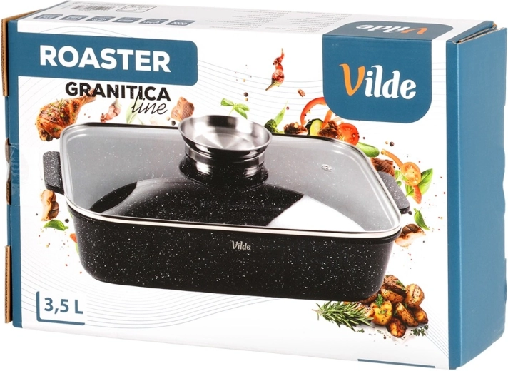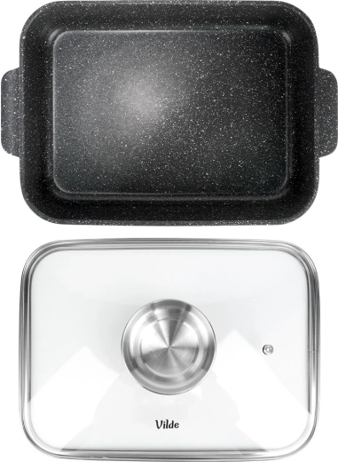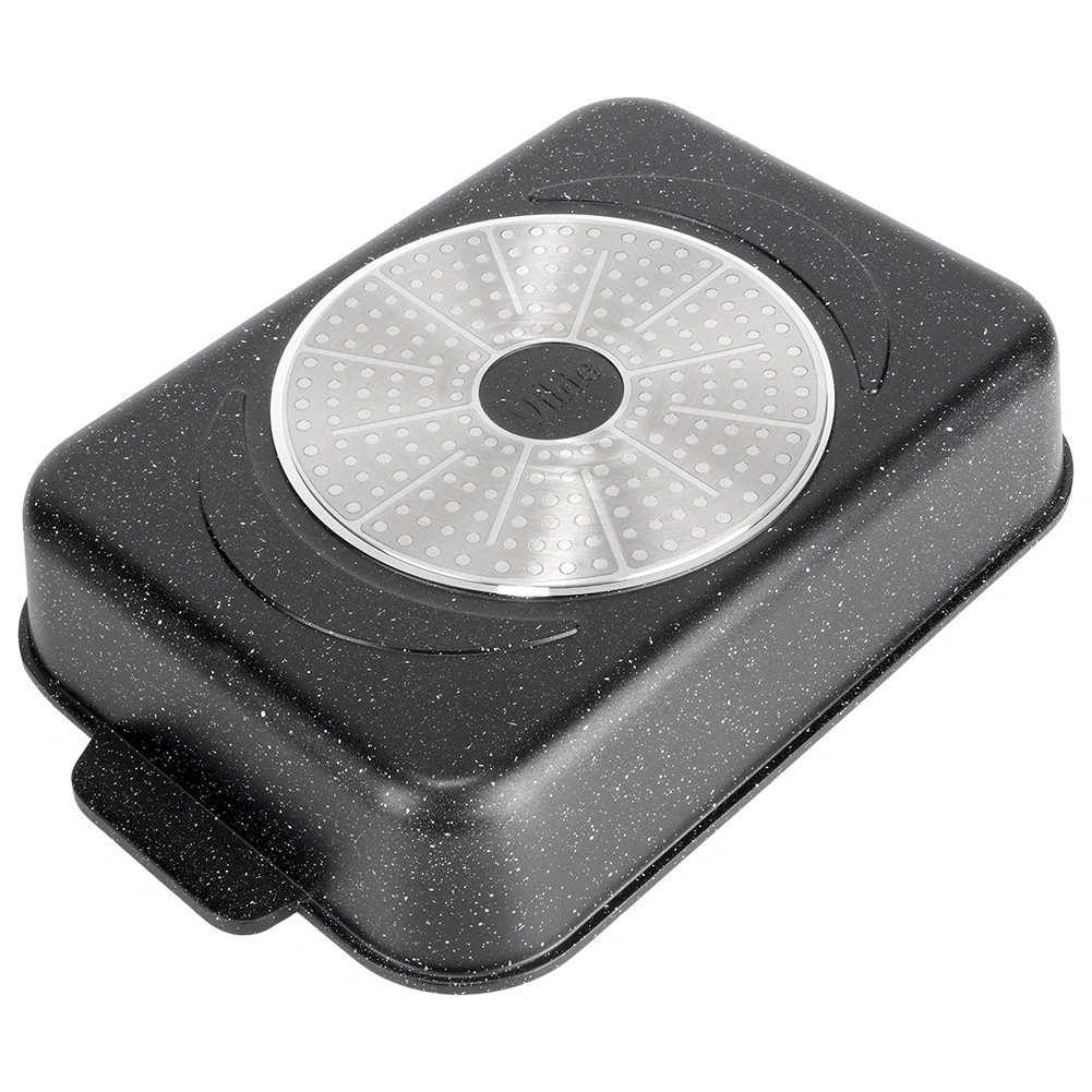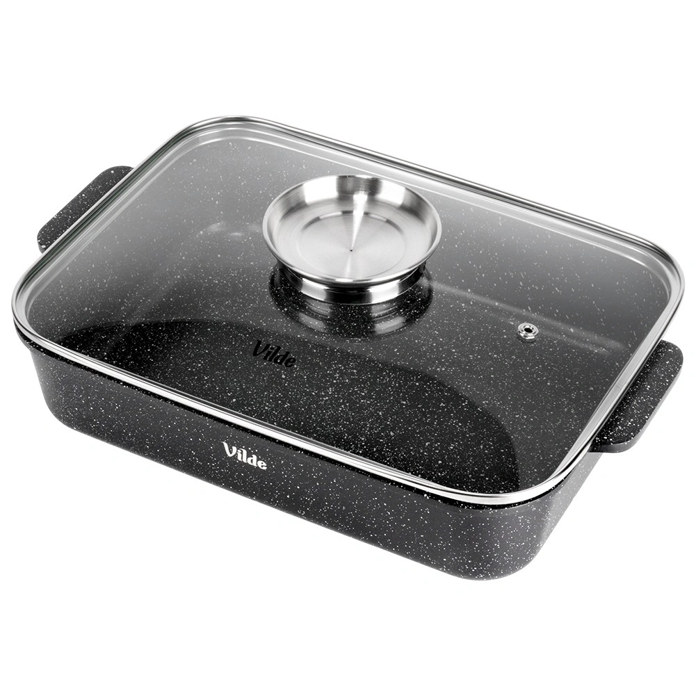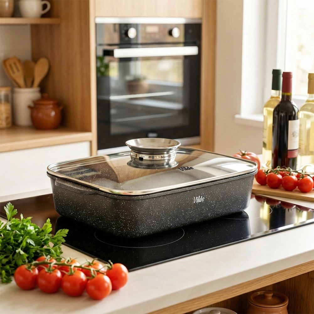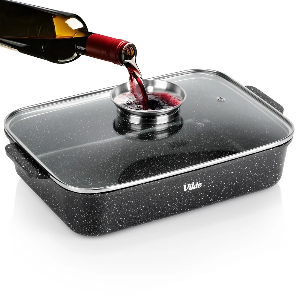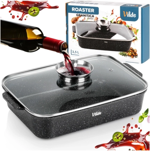 Rechteckiger Bräter aus Druckguss-Aluminium mit robuster Granit-Antihaftschicht verteilt die Wärme gleichmäßig und hält Speisen länger warm. Der Glasdeckel mit Dampfventil und integriertem Spender für flüssige Gewürze ermöglicht das Nachgießen von Wasser oder Wein ohne Öffnen – so bleiben Saftigkeit und Aroma erhalten.