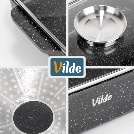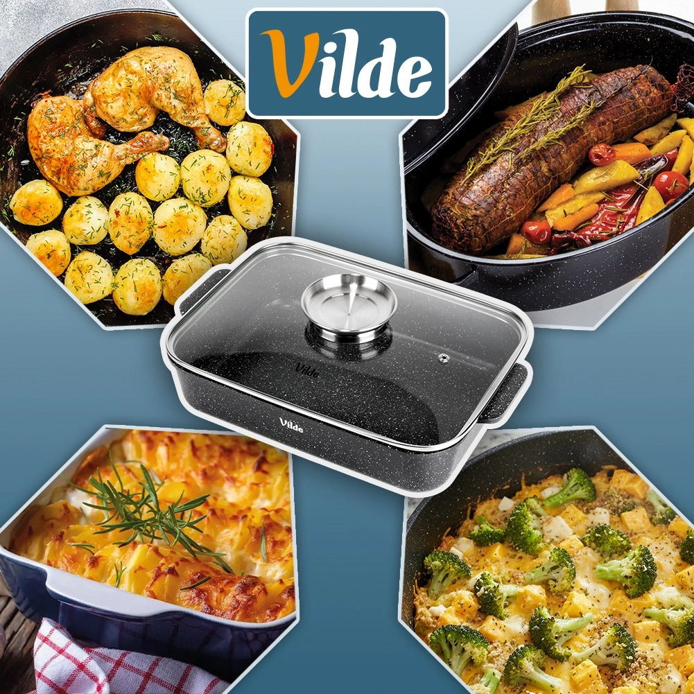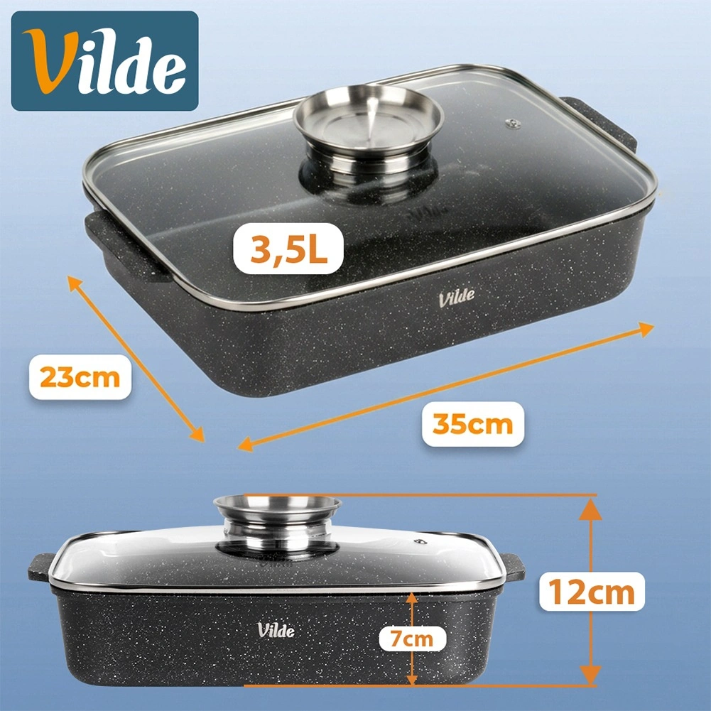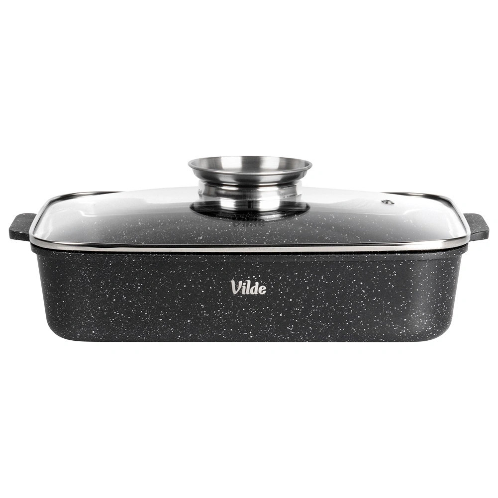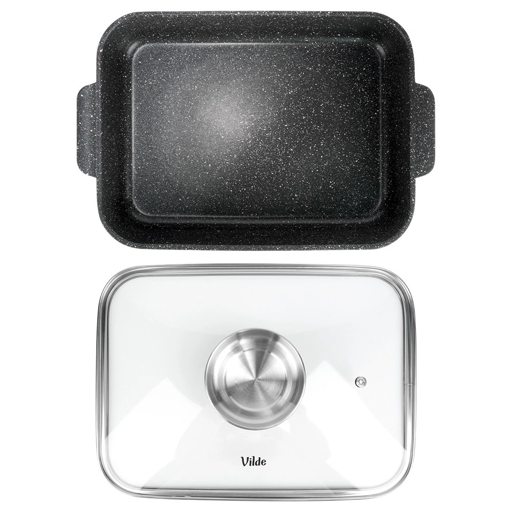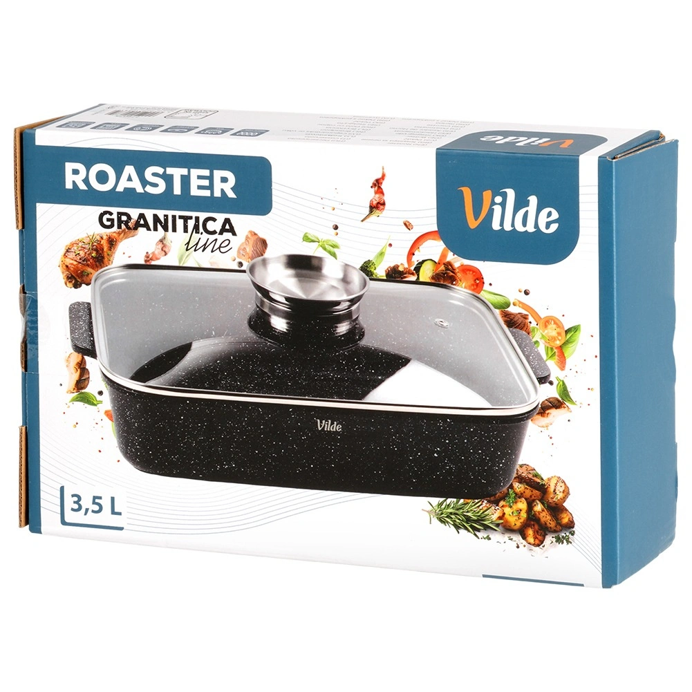 Rechteckiger Bräter aus Druckguss-Aluminium mit robuster Granit-Antihaftschicht verteilt die Wärme gleichmäßig und hält Speisen länger warm. Der Glasdeckel mit Dampfventil und integriertem Spender für flüssige Gewürze ermöglicht das Nachgießen von Wasser oder Wein ohne Öffnen – so bleiben Saftigkeit und Aroma erhalten.