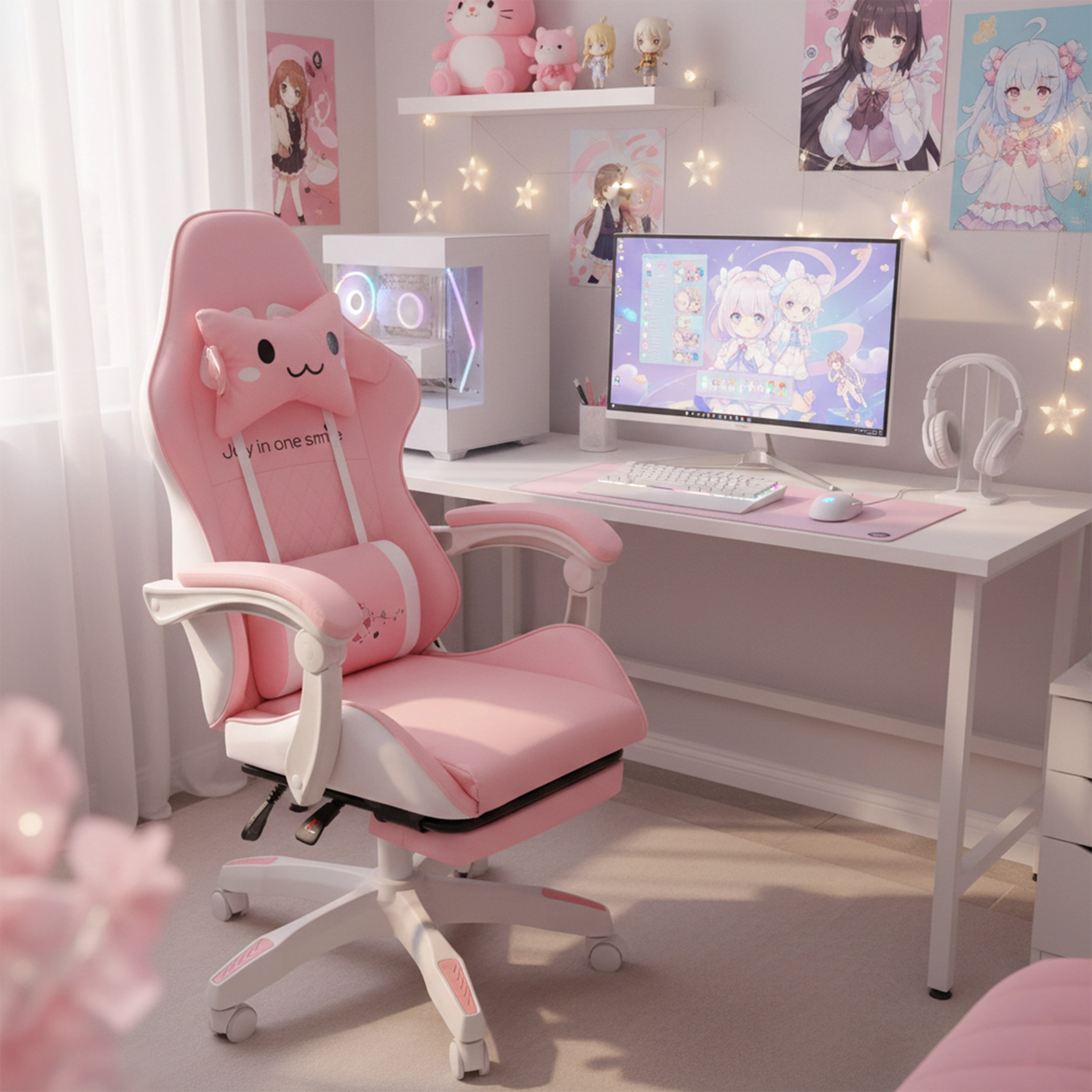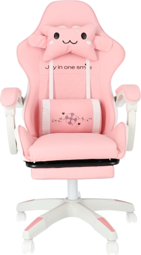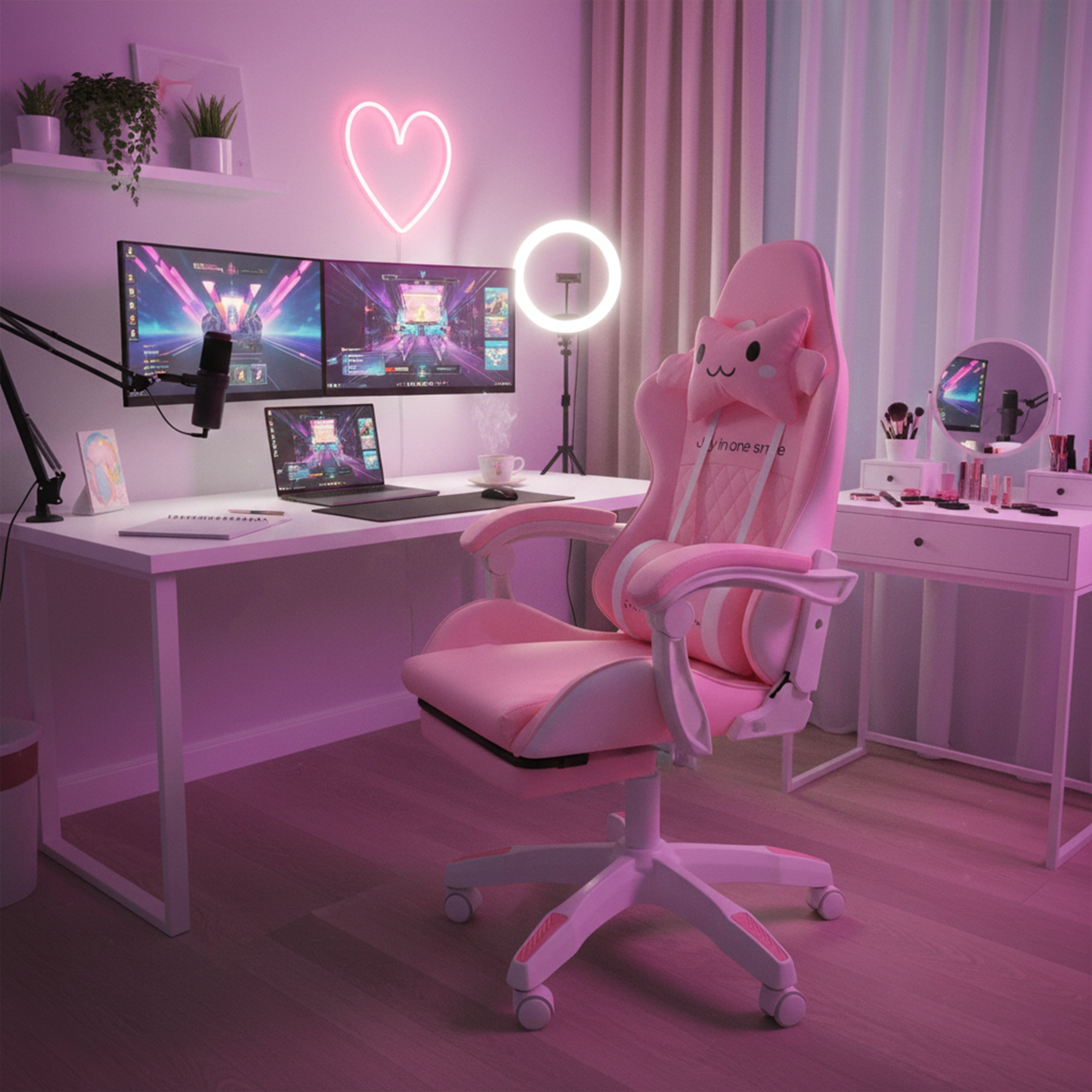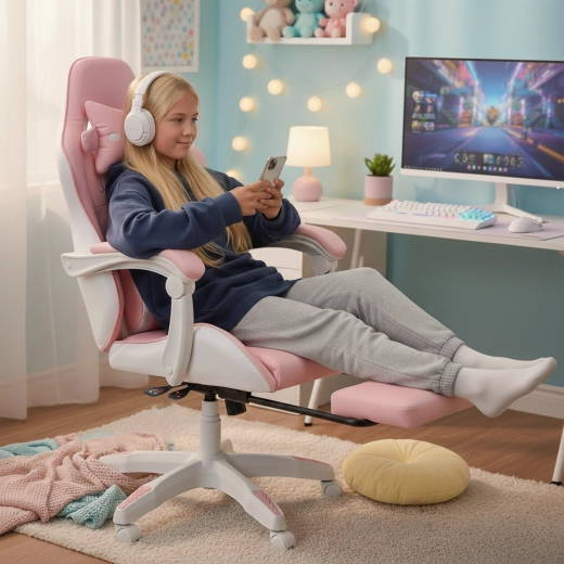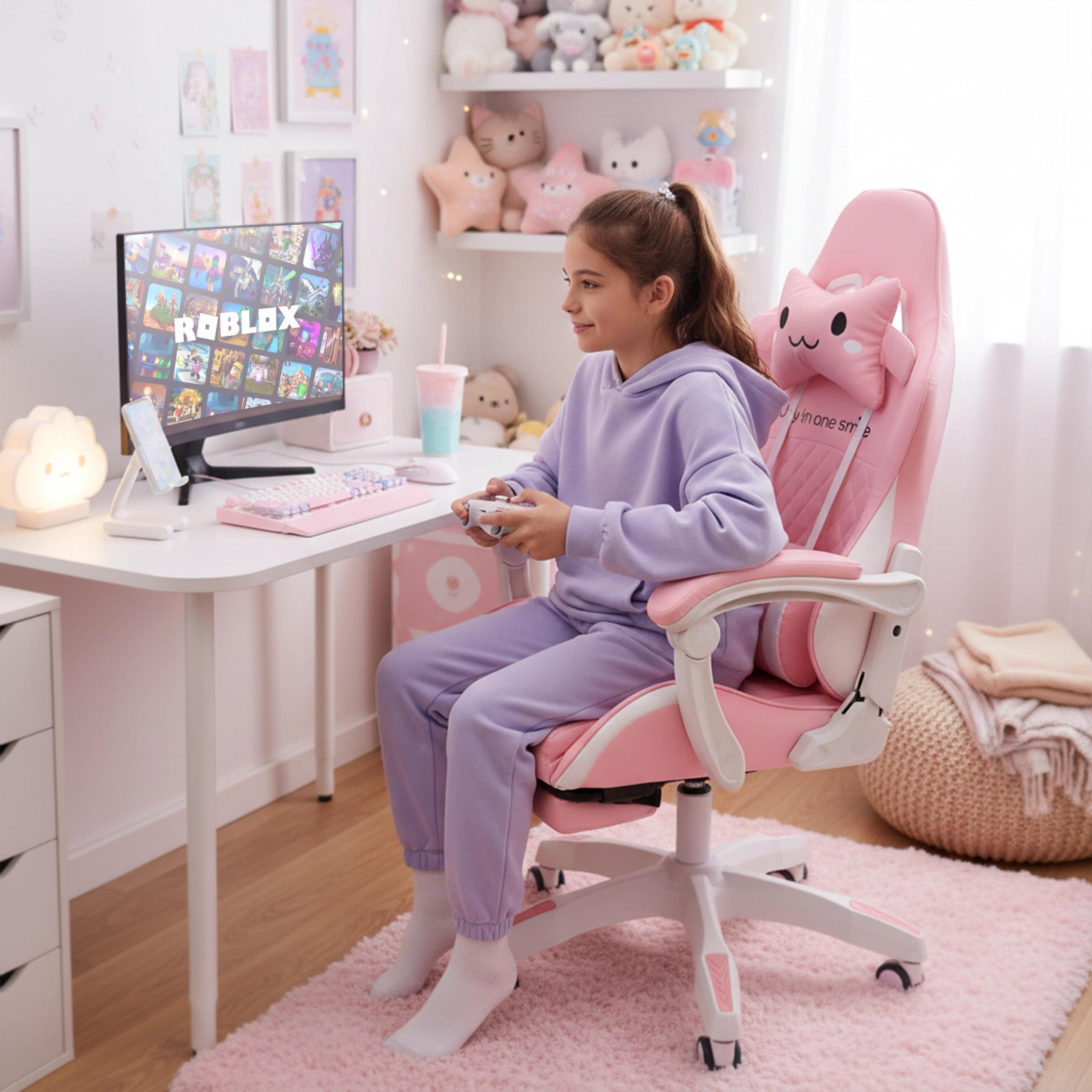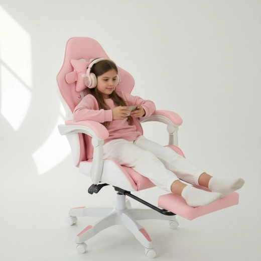 Der rosa Kinder-Gaming- und Schreibtischstuhl verbindet ergonomischen Komfort, höhenverstellbaren Sitz und eine ausziehbare Fußstütze für schnelle Erholung. Der Schalensitz mit stabiler Rückenunterstützung, weichen Armlehnen mit Schaumstoff und die sanfte 360°-Drehung mit Rollen erleichtern Lernen und Spielen. Inklusive Nacken- und Lendenkissen für gesünderes Sitzen im Kinderzimmer.