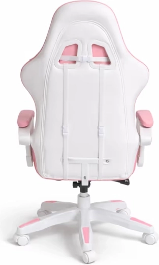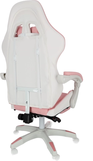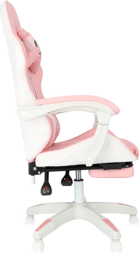 Zum Komfort tragen gepolsterte Armlehnen und eine ausziehbare Fußstütze bei, die die Arbeitsposition im Handumdrehen in eine Relaxposition verwandelt. Die robuste Basis mit 360°-Drehmechanismus und Rollen ermöglicht eine leichte Bewegung im Zimmer. Das stilvolle rosa-weiße Design passt in moderne Kinder- und Jugendzimmer.
