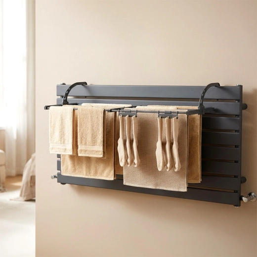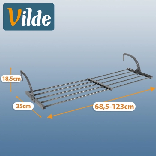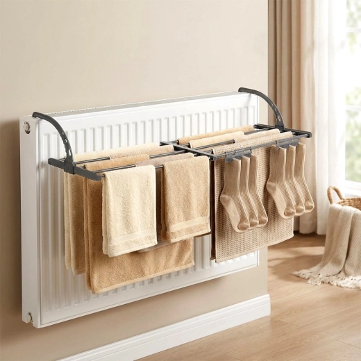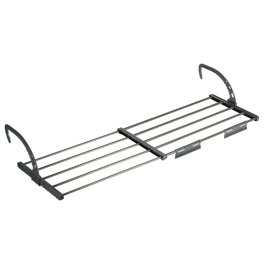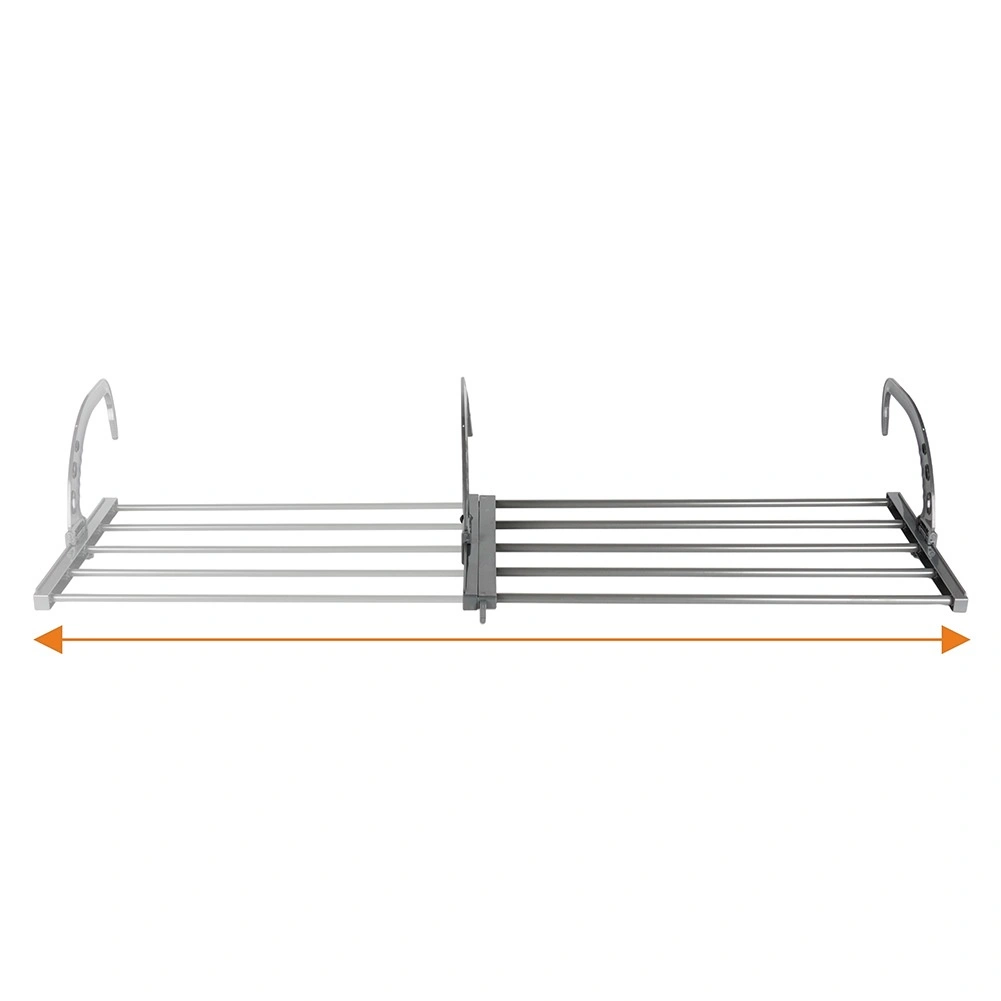 Verstellbare, klappbare Haken sitzen sicher auf Heizkörpern (max. 13 cm) oder am Balkongeländer. Schnelle Montage ohne Werkzeug.