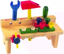 Das Set enthält alles Nötige für sicheres und unterhaltsames Spielen: Schraubendreher, Hammer, Schlüssel, Muttern und Schrauben. Alles ist aus hochwertigem Holz mit glatter Oberfläche gefertigt – angenehm und sicher in der Anwendung. Verpackt in einer Pappschachtel, auch als Geschenk geeignet.