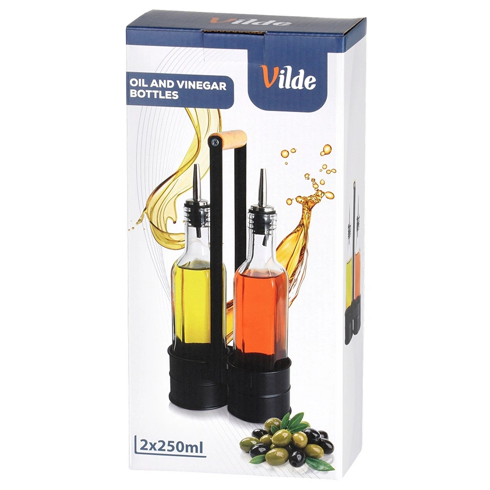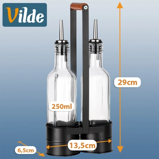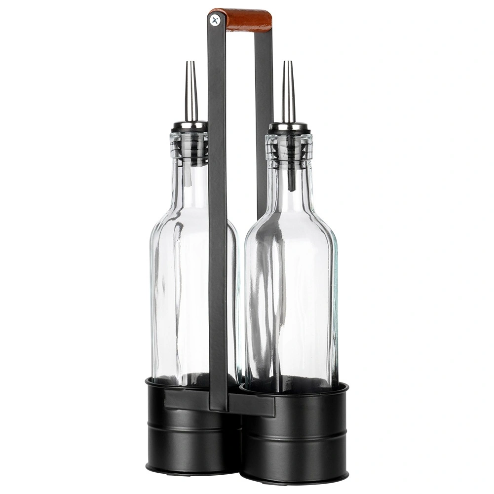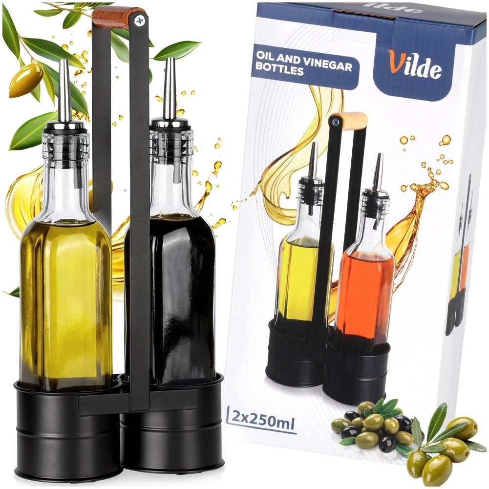 Elegantes Set aus zwei Glasflaschen für Öl und Essig in einem stabilen Metallständer mit praktischem Tragegriff. Jede Flasche hat ein Volumen von 250 ml und ist mit einem Ausgießer aus Edelstahl für präzises und sauberes Dosieren ausgestattet. Hochwertiges, klares Glas betont den Inhalt, während der moderne schwarze Ständer für Ordnung auf der Küchenarbeitsplatte und beim Servieren sorgt. Ideal für den Haushalt und die Gastronomie.