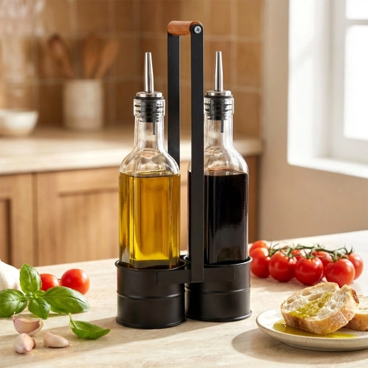 Ideal zum Aufbewahren und Servieren von Olivenöl sowie Wein- oder Balsamessig – zu Hause, in Bistros und Restaurants. Die effektvolle Präsentation aromatisierter Öle unterstreicht den Tischstil, während der Ständer die Flaschen stabil und übersichtlich an einem Ort hält.