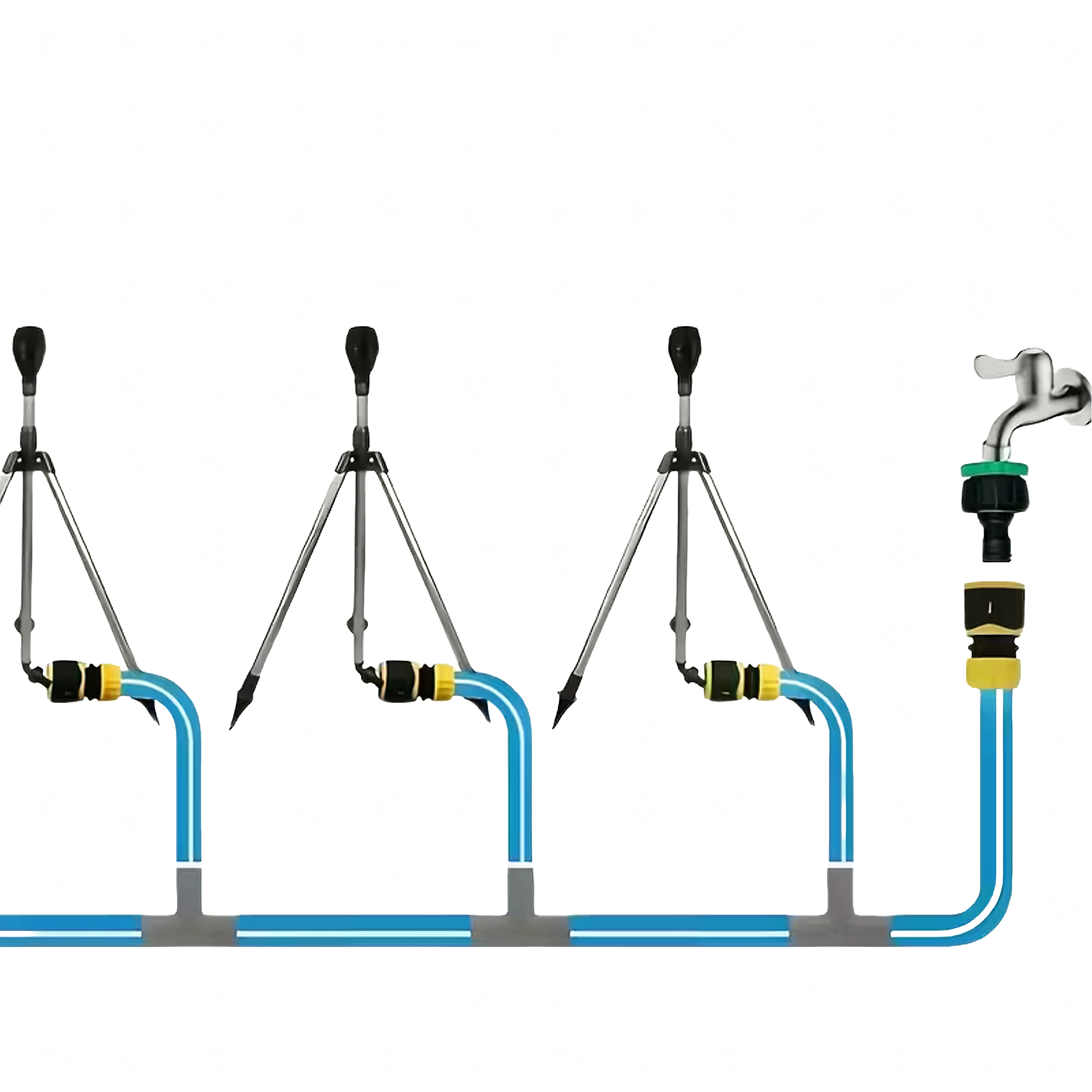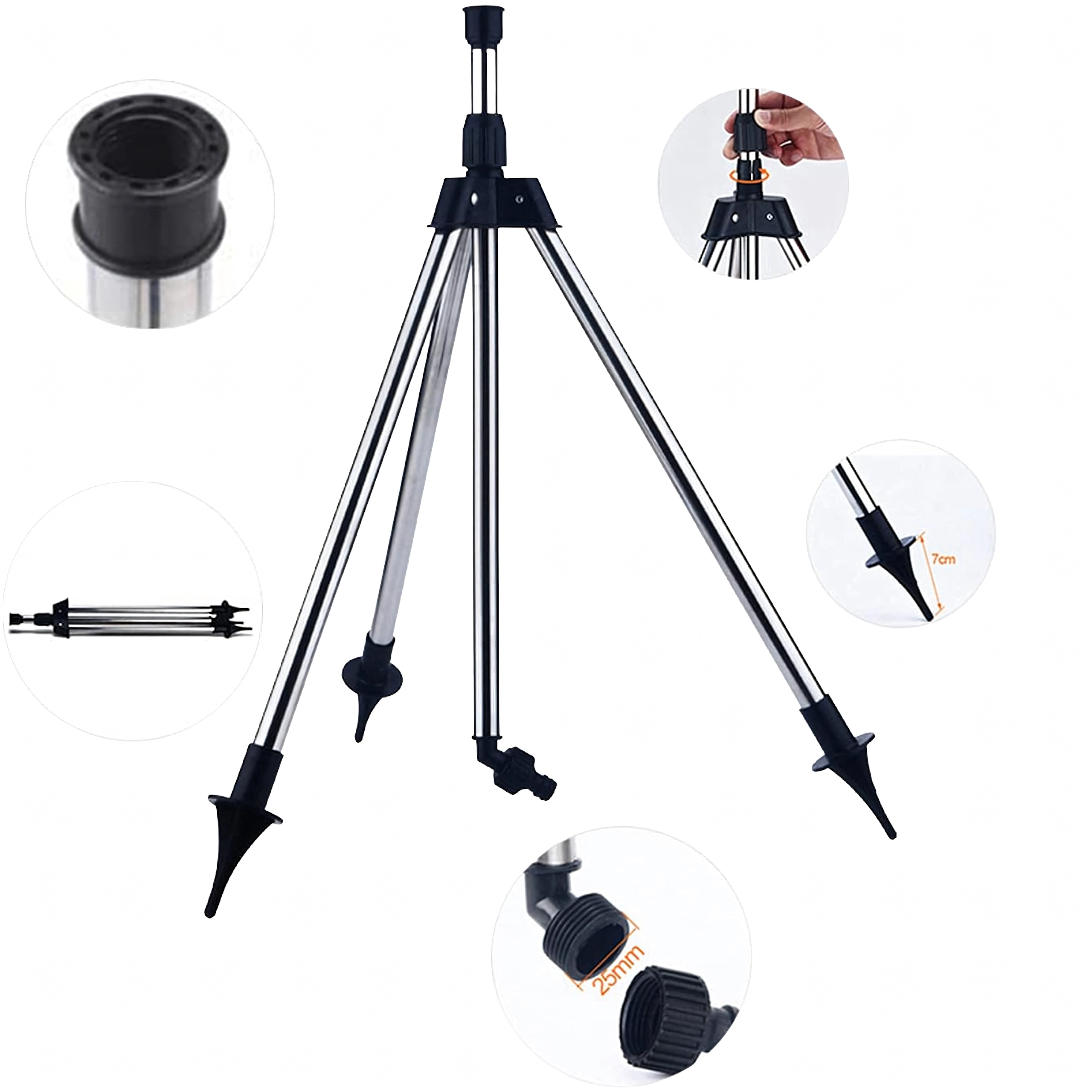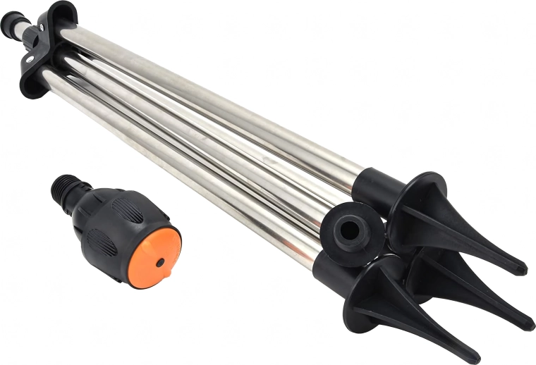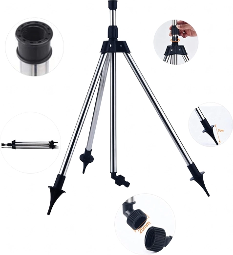 Teleskopische Metallbeine mit rutschfesten/spitzen Enden stehen sicher im Gelände und ermöglichen es, den Sprenger anzuheben, um eine bessere Wasserverteilung zu erreichen.