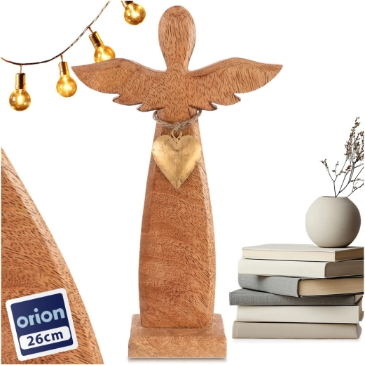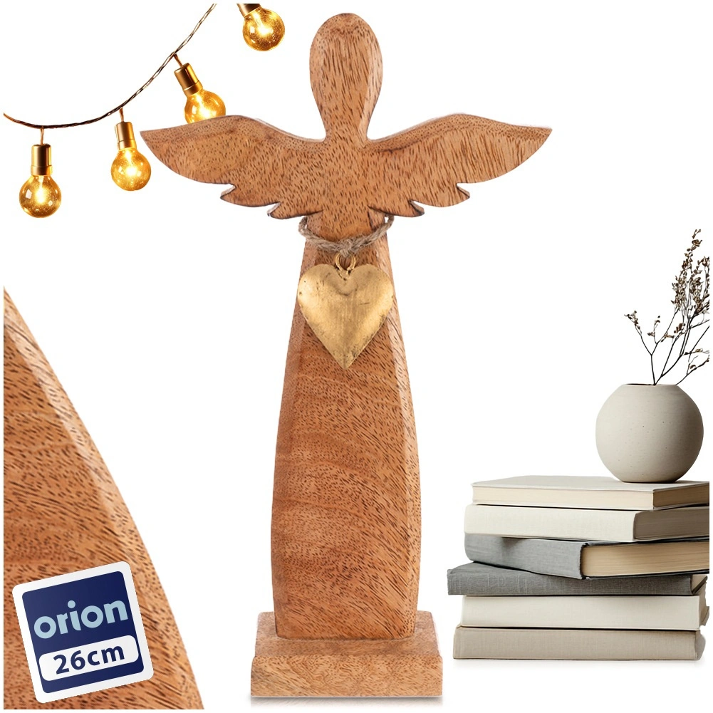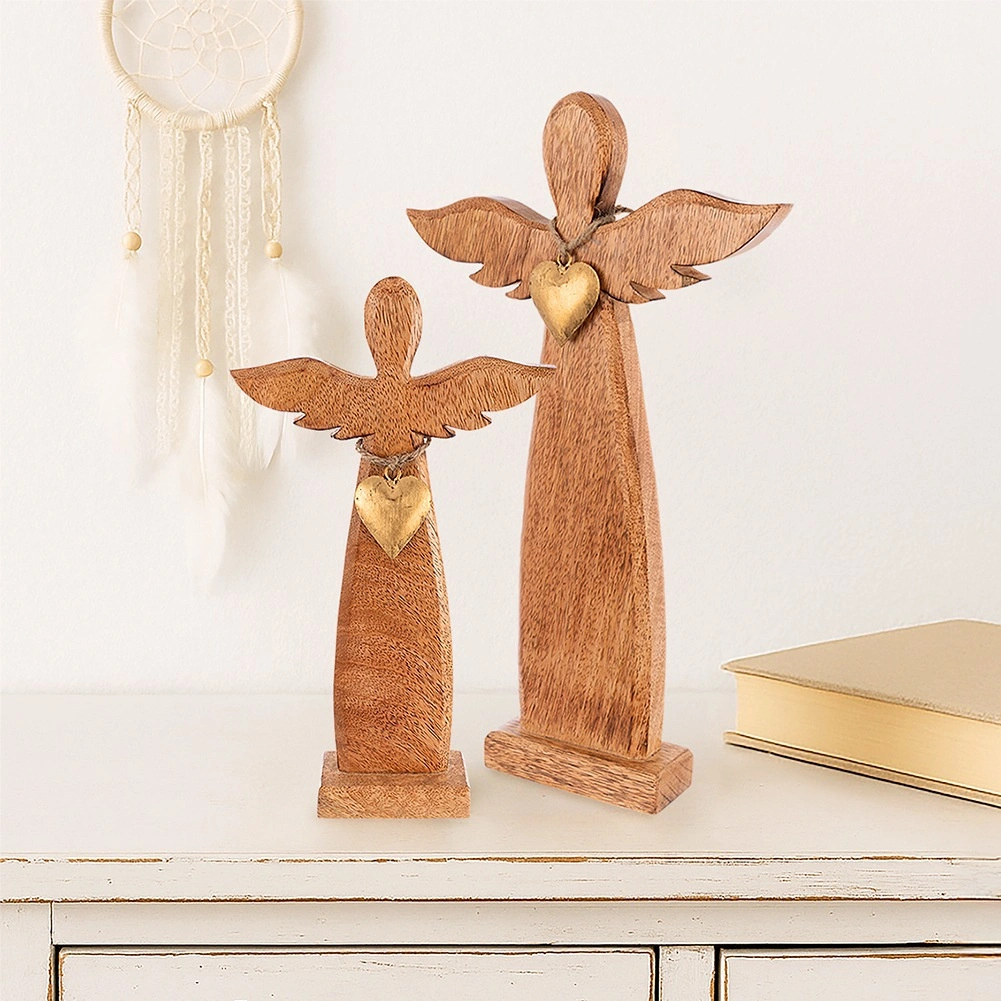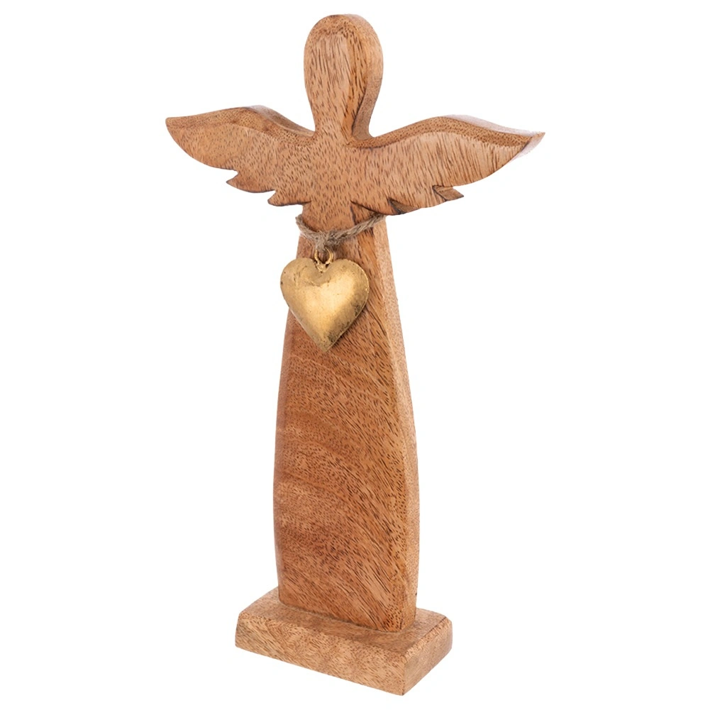 Die geschmackvolle Engelfigur ist aus hochwertigem Mangoholz in natürlichen Tönen gefertigt. Dank der minimalistischen Form, der glatten Oberfläche und dem goldenen Herz wirkt sie zugleich zart und ausdrucksstark – perfekt für moderne wie auch rustikale Interieurs.