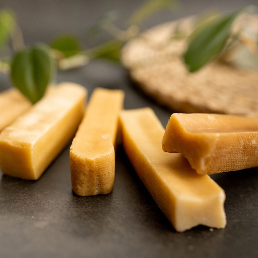 Traditionell getrockneter und geräucherter Himalaya-Käse zeichnet sich durch eine hohe Härte aus, die langanhaltenden Kauspaß und natürliche Zahnpflege bietet.
