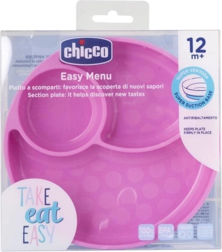Der Silikonteller CHICCO aus der Reihe Take Eat Easy ist für ein komfortables und sicheres Erlernen des selbstständigen Essens konzipiert. Drei getrennte Fächer halten die Speisen separiert, was Kindern das Entdecken neuer Geschmäcker und Texturen erleichtert. Der zuverlässige Saugnapf an der Unterseite hält den Teller fest auf dem Tisch und hilft, ein Umkippen zu verhindern.