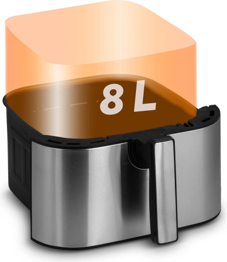 Dank fortschrittlicher Heißluftzirkulation erhalten Sie außen eine goldene, knusprige Kruste und innen Saftigkeit – ohne Ölgeruch und unnötige Kalorien. Das Volumen von 8 Litern reicht für ein Familienessen, eine große Portion Pommes für Freunde oder zum Backen eines ganzen Hähnchens. Die Innenteile mit antihaftender PTFE-Beschichtung sind spülmaschinengeeignet.