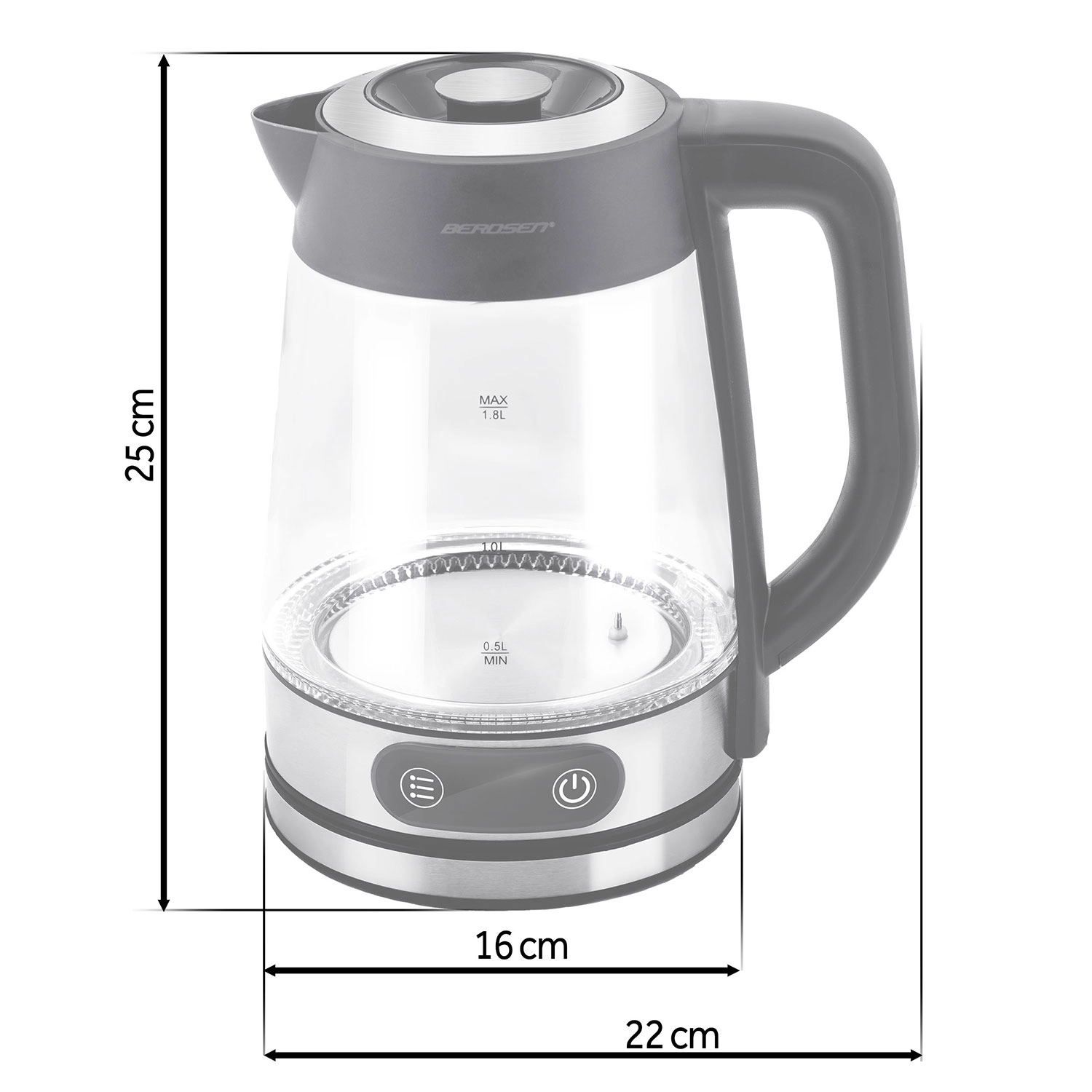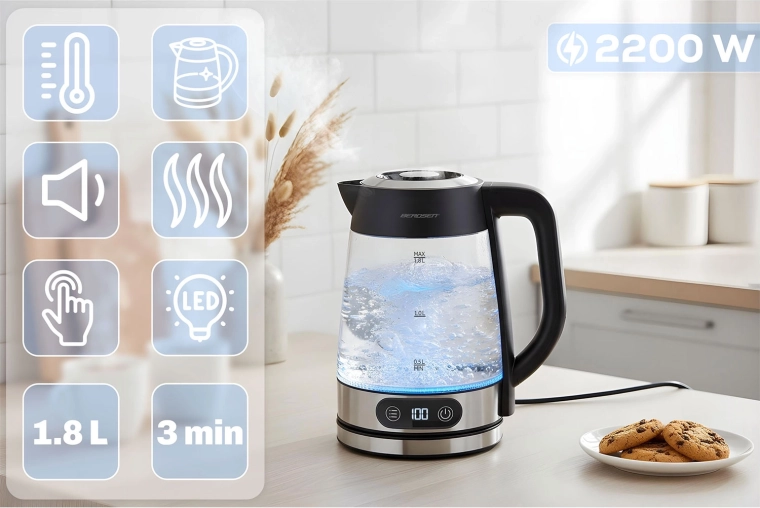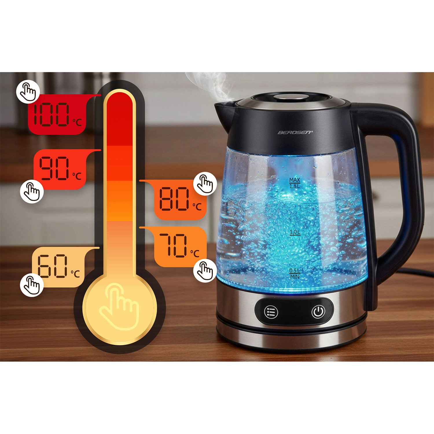 Bereichern Sie Ihre Küche mit einem modernen Accessoire, das Design und Funktionalität vereint. Der Glas-Wasserkocher von BERDSEN mit verchromten Elementen und ergonomischem Griff ermöglicht die präzise Temperatureinstellung für Tee, Kaffee und Getränke für Kinder. Intelligente Echtzeit-Temperaturmessung und ein übersichtliches Display geben Ihnen volle Kontrolle über den Erhitzungsvorgang.