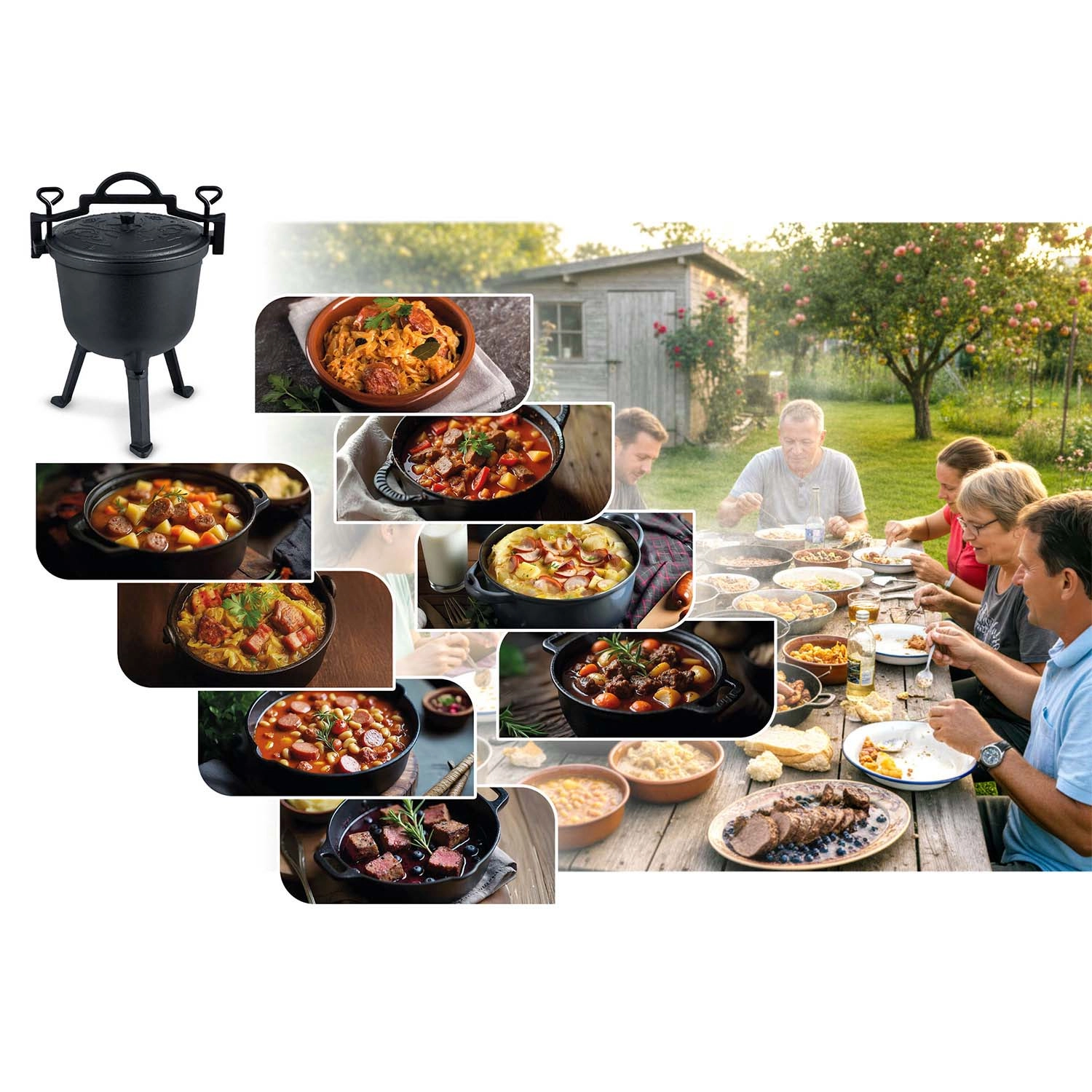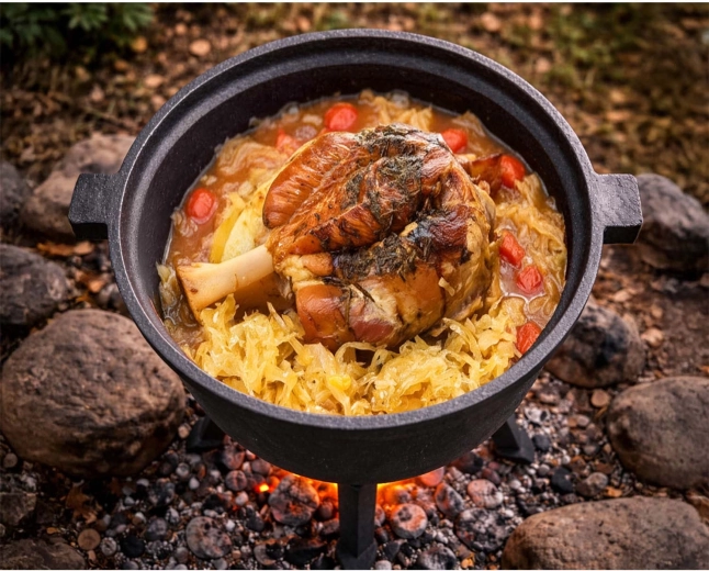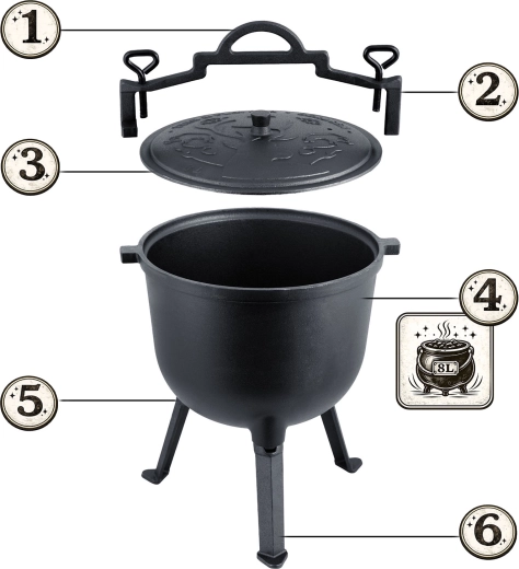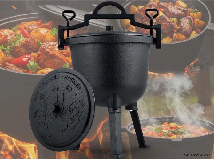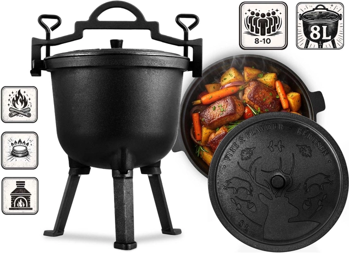 Das große Volumen von 8 l sättigt Familie und Freunde. Funktioniert hervorragend im Sommer am Grill und im Winter am Feuer – für Gulasch, Braten und herzhafte Suppen.