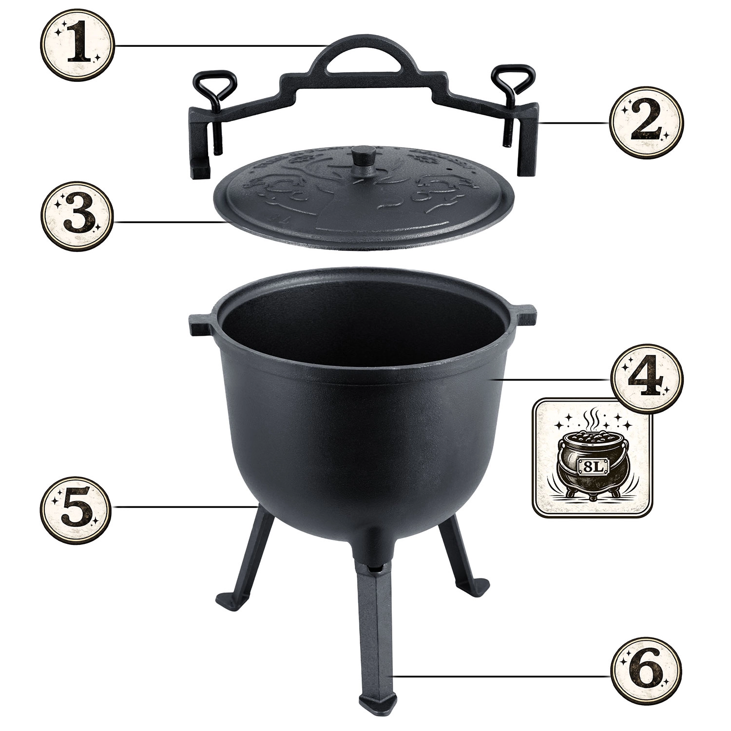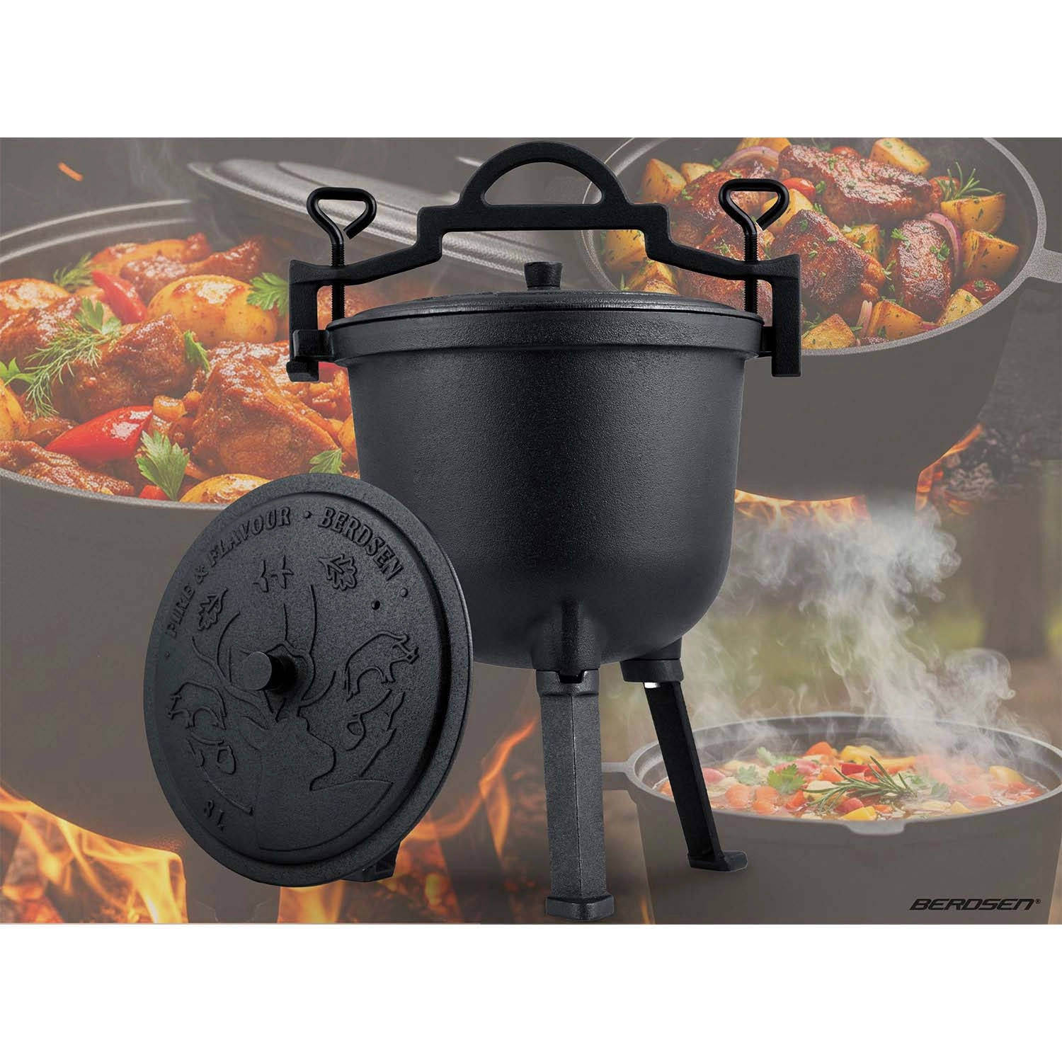 Die Konstruktion ist auf maximale Vielseitigkeit ausgelegt: Stellen Sie den Kessel auf das schraubbare Dreibein mit stabilen Füßen, hängen Sie ihn am stabilen Bügel über die Flamme oder verwenden Sie ihn ohne Beine auf dem Gasherd. Der schwere Deckel mit Entlüftung hält Dampf und Aroma im Inneren, damit alles saftig bleibt.