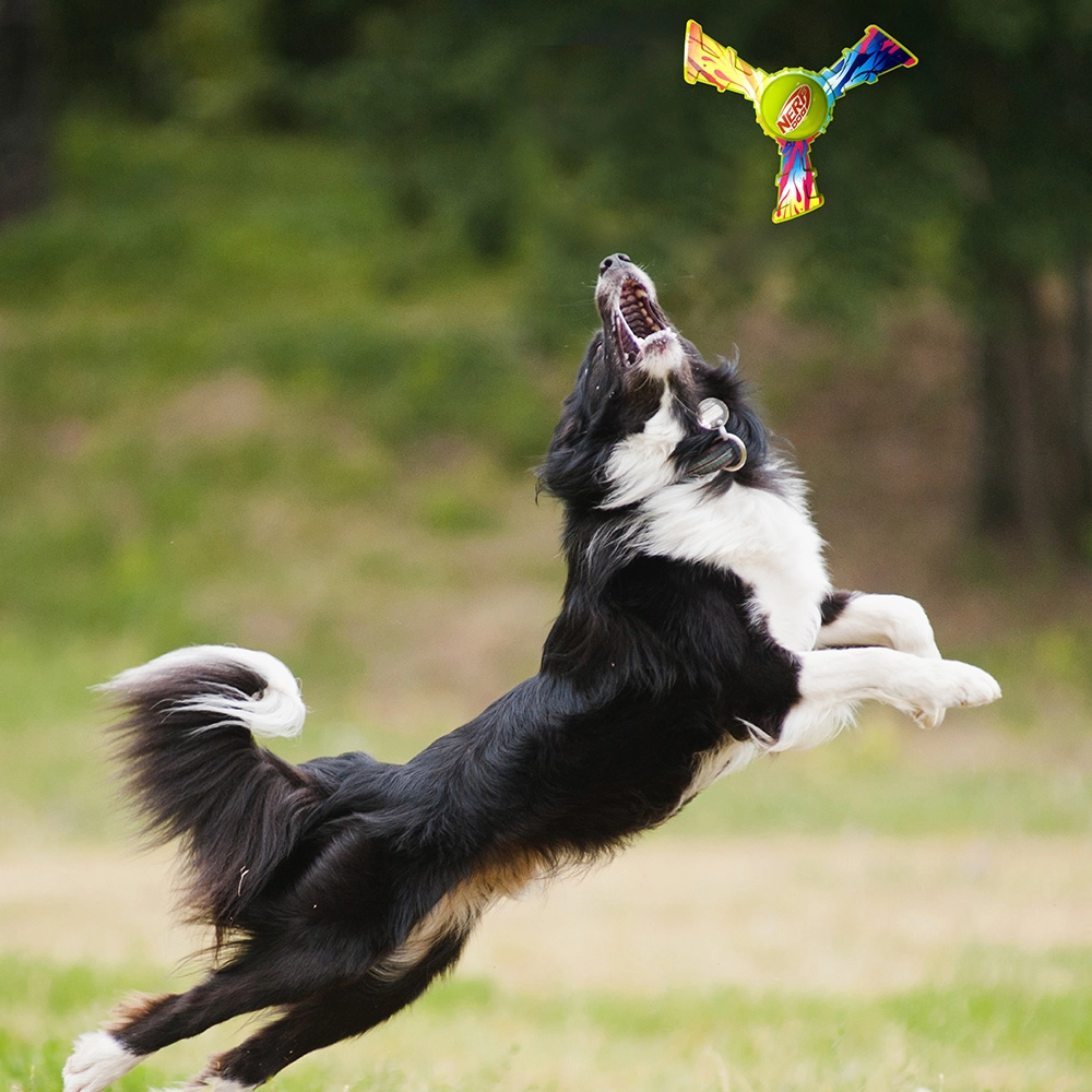 Die dreizackige Konstruktion mit zentralem Griff hilft dem Spielzeug, stabil durch die Luft zu gleiten, sodass Ihr Hund mehr Zeit zum Fangen hat.