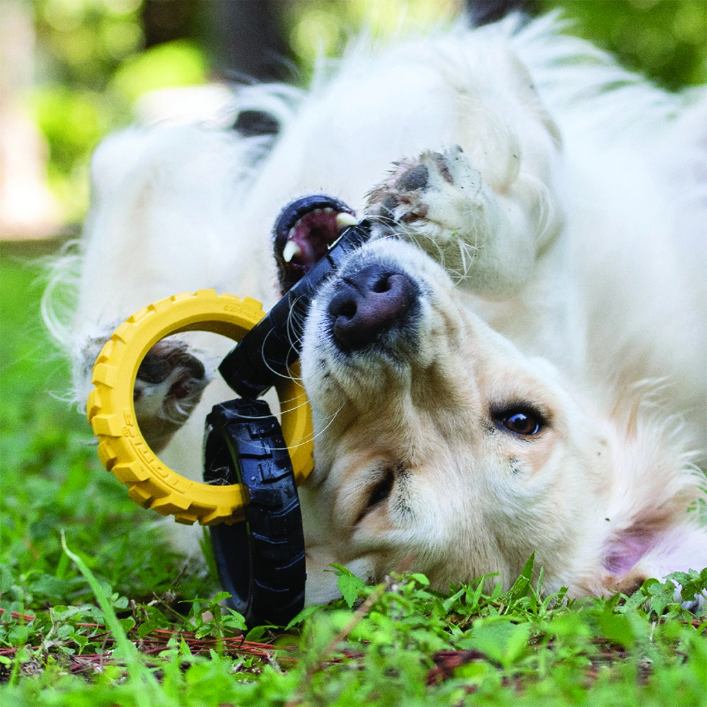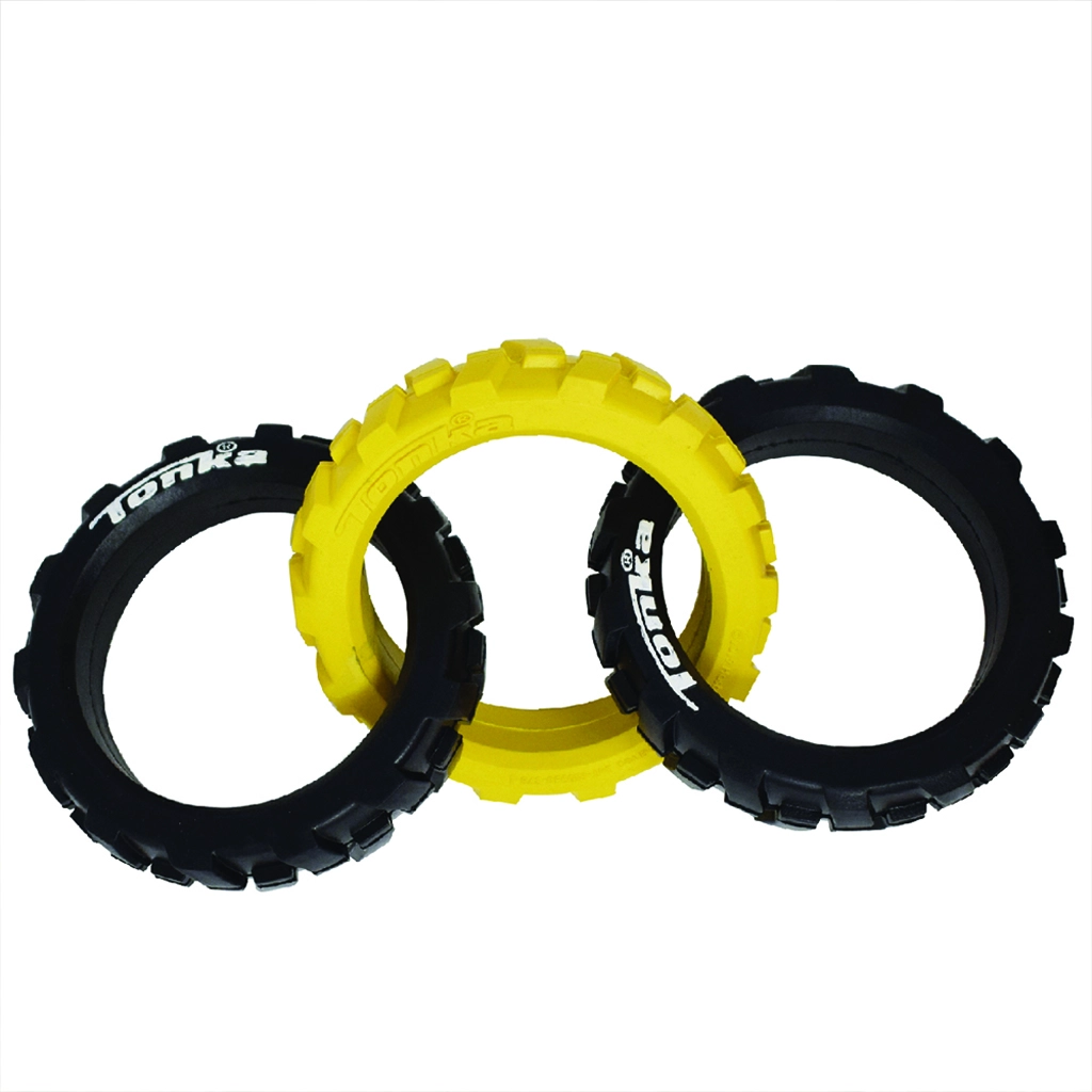 Das Tonka-Spielzeug besteht aus drei robusten Ringen mit einer flexiblen, reifenähnlichen Profilstruktur, die sowohl in Maul als auch Hand gut liegt. Dank der Kombination aus widerstandsfähigem Gummi und durchdachter Form hält es intensivem Ziehen stand und ist zugleich sicher für den täglichen Spielspaß.