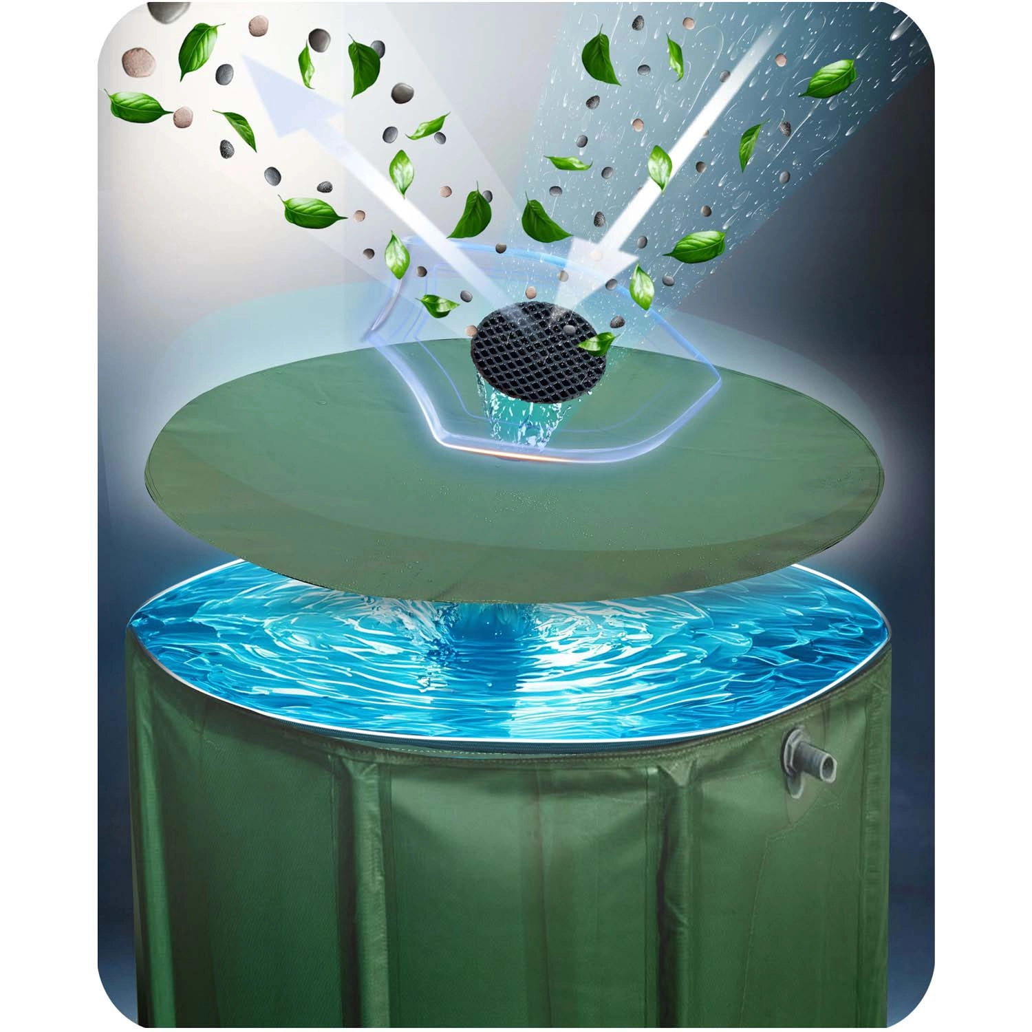 UV-beständige PVC-Hülle, verstärkter, korrosionsbeständiger Rahmen und Stabilisierungsfüße. Nach der Saison lässt sich das Fass einfach zusammenfalten und verstauen – es benötigt nur minimalen Platz.