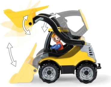 Die Frontschaufel lässt sich leicht anheben und abkippen, sodass Kinder Sand oder Bausteine wie mit einem echten Lader aufnehmen und umschütten können.