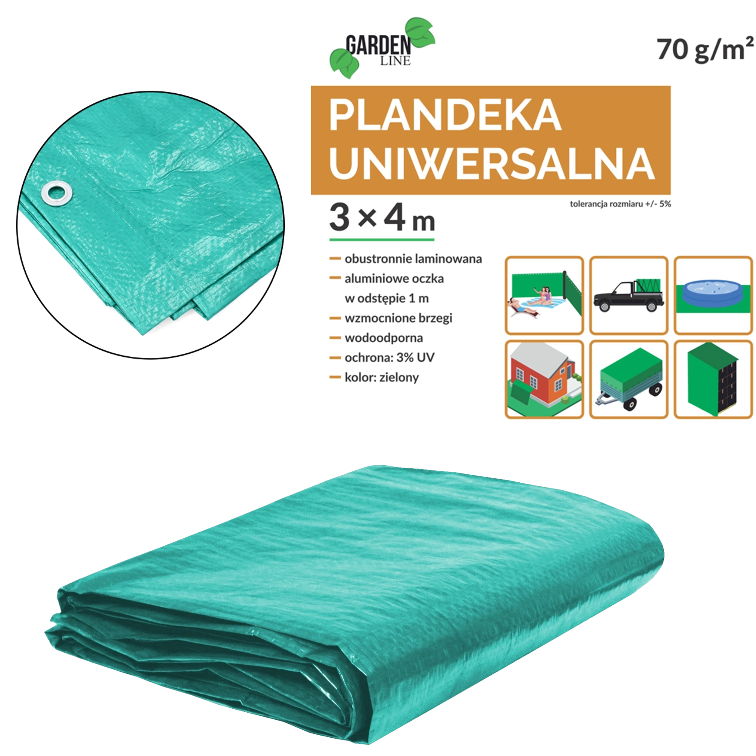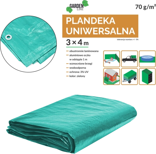Universelle grüne Plane 3 × 4 m aus hochwertigem Polyethylen mit einem Flächengewicht von 70 g/m², beidseitig laminiert und mit UV-Filter 3 % geschützt. Am Rand befinden sich Aluminiumösen in Abständen von ca. 1 m und alle vier Kanten sind für höhere Festigkeit mit einer Polypropylen-Kordel verstärkt.