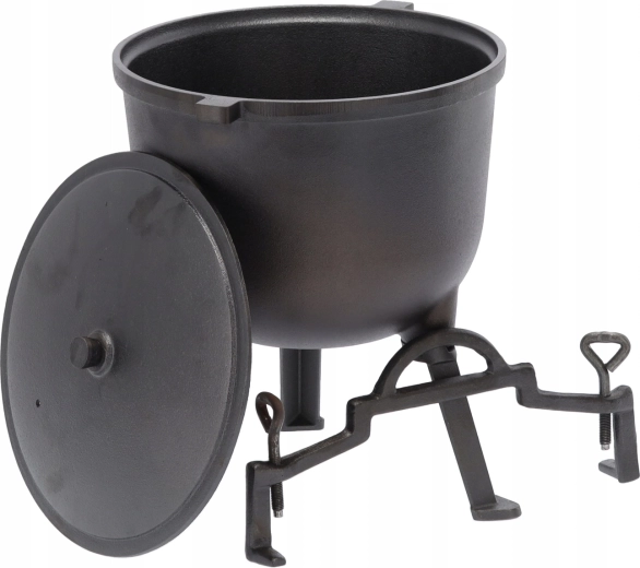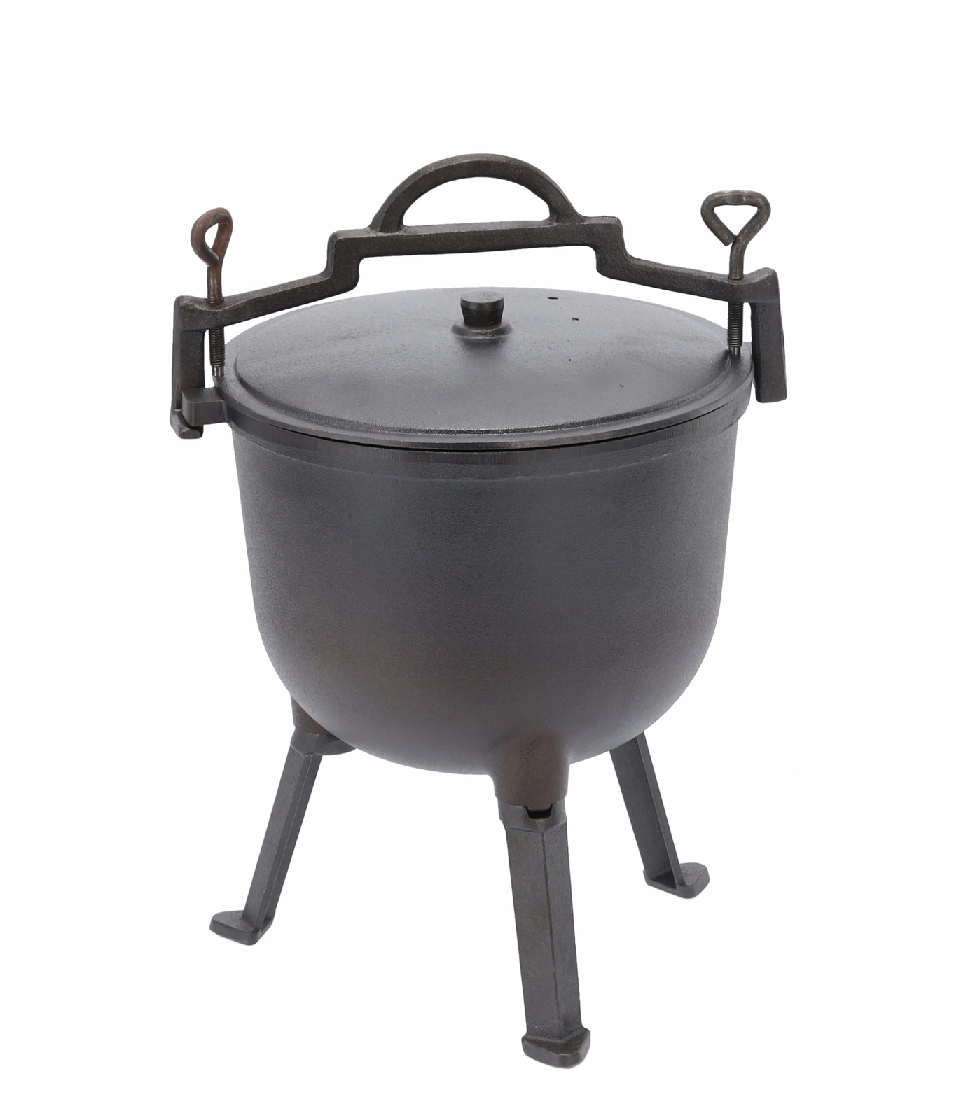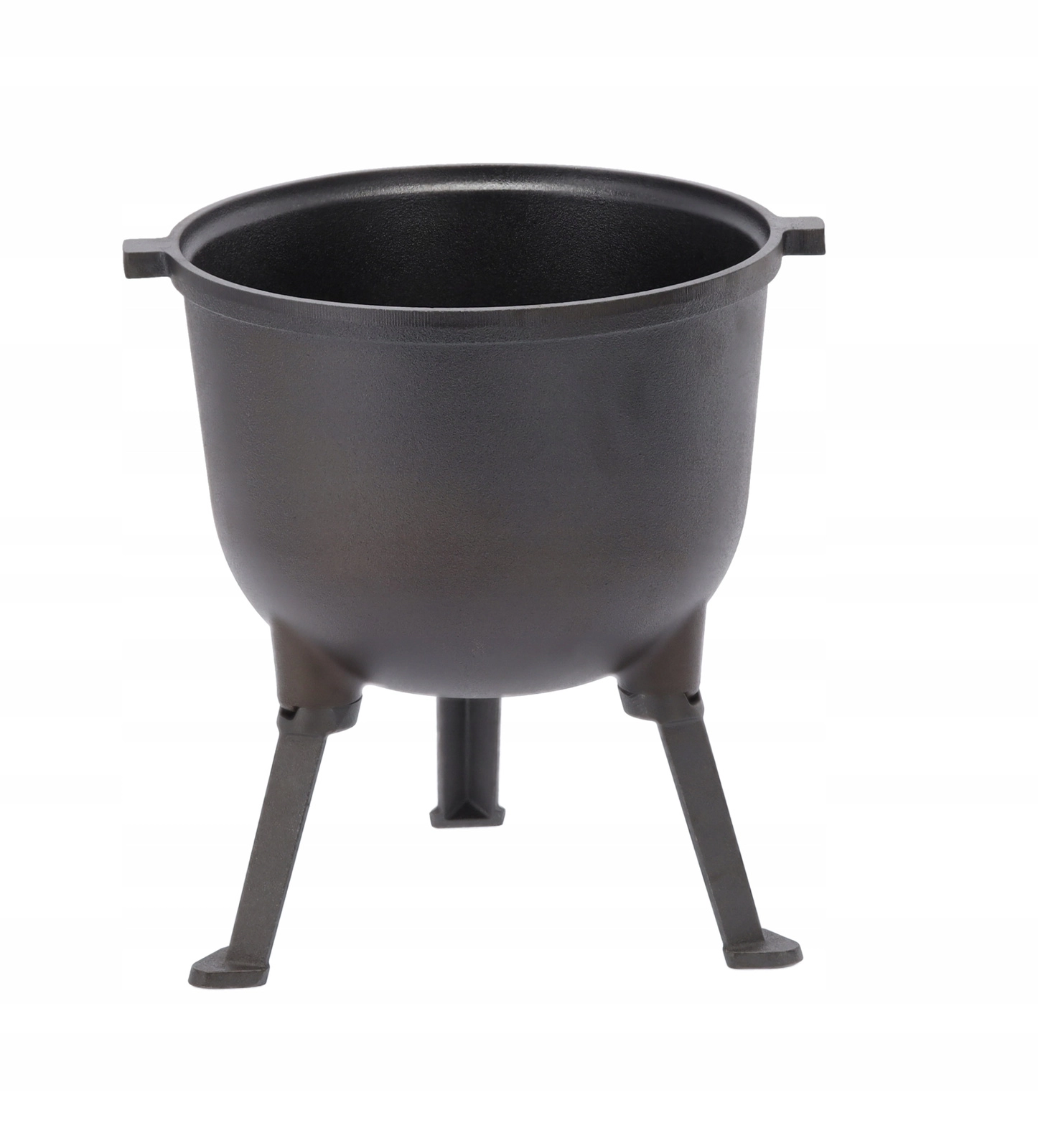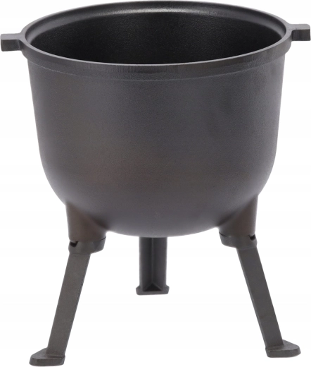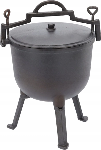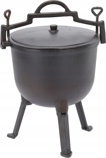 Dieser großvolumige Gusseisenkessel ist perfekt für Gulasch, Suppen und langsames Schmoren über offenem Feuer. Die stabile Konstruktion bewältigt hohe Temperaturen und wechselhafte Außenbedingungen, während der Deckel Feuchtigkeit und Geschmack im Inneren bewahrt. Dank des Henkels lässt sich der Kessel leicht tragen und über dem Feuer aufhängen.