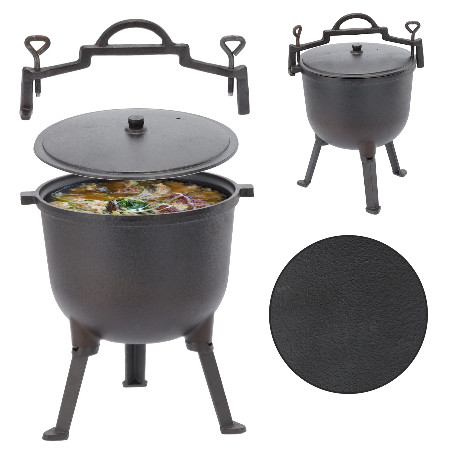 Der schwere Deckel hilft, Feuchtigkeit und Aroma im Inneren zu halten, während der robuste Henkel ein sicheres Tragen oder Aufhängen des Kessels über dem Feuer ermöglicht.