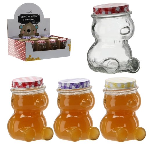 Ein niedliches Glas in Bärenform mit einem Fassungsvermögen von 300 ml – ideal für Honig, Marmeladen, Gewürze oder andere Kleinigkeiten. Dank des dicht schließenden Schraubdeckels bleibt der Inhalt länger frisch. Die praktische Verpackung im Display mit 12 Stück erleichtert Präsentation und Verkauf. Eine hervorragende Wahl zum Aufbewahren und Dekorieren, erhältlich mit Deckeln in mehreren Farben.