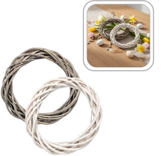 Dieser vielseitige Kranz aus natürlicher Weide eignet sich hervorragend als eigenständige Dekoration oder als Basis für originelle Arrangements. Die neutrale Farbgebung in Weiß oder Grau lässt sich mühelos mit Blumen, Bändern und saisonalen Accessoires kombinieren – so gestalten Sie einzigartige Frühlings-, Oster-, Hochzeits- und Weihnachts-Kompositionen.