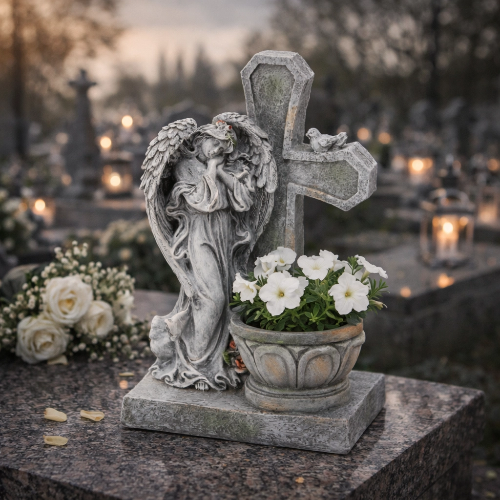 Die Figur ist ideal für die Platzierung auf Grabstätten, Gedenksteinen oder in Gartenecken. Der Blumenhalter ermöglicht das Einsetzen von frischen oder künstlichen Blumen und unterstreicht damit die persönliche Erinnerung und das Symbol des Glaubens.