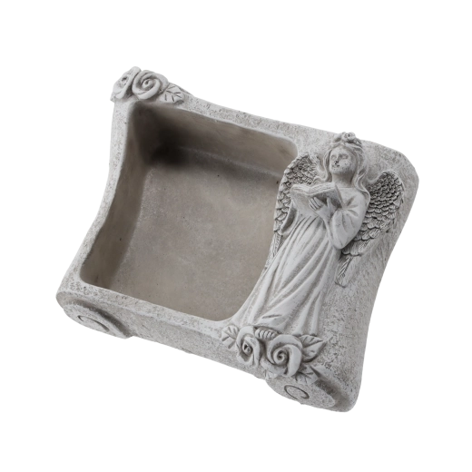 Elegante dekorative Schale in Buchform mit einer Engelfigur – ideal für Grabarrangements und Wohnraumdeko. Hergestellt aus widerstandsfähigem Zement in Grau, ohne Abflussloch. Perfekt für kleine Pflanzen, Kerzen sowie Schlüssel und Schmuck. Unterstreicht die Erinnerung an geliebte Menschen und verleiht dem Raum klassischen Charme, feine Rosendetails und eine zeitlose Steinoptik.