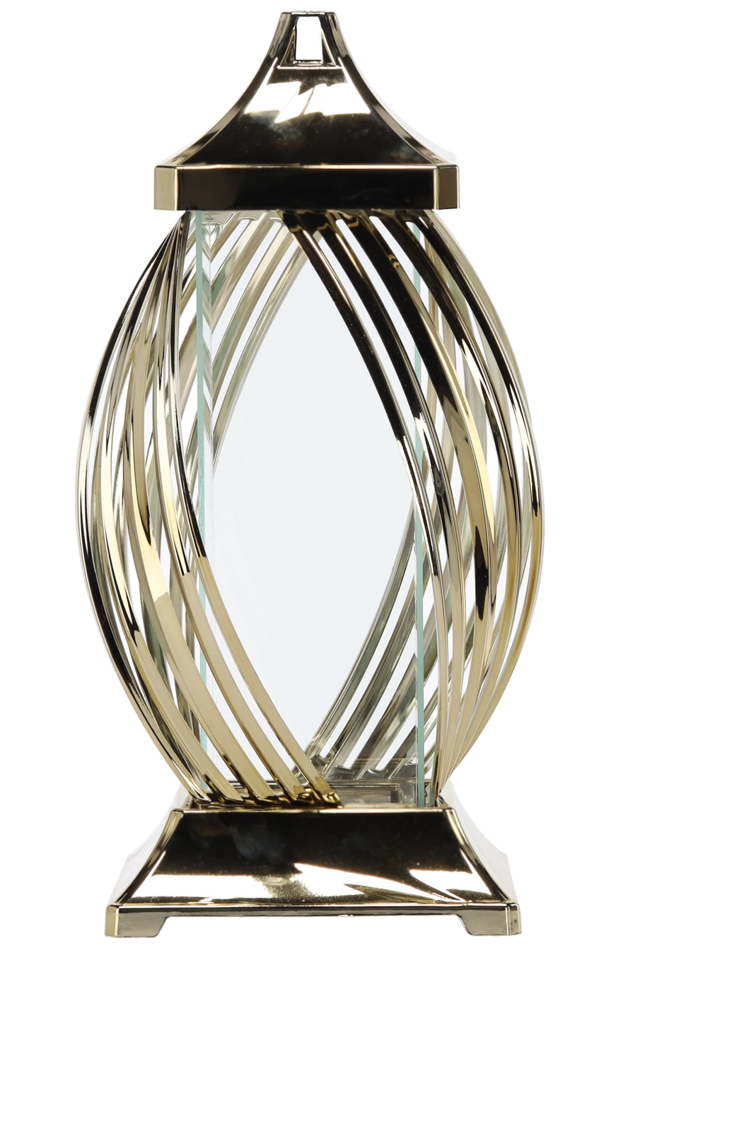 Diese dekorative Metalllaterne besticht durch ihr modernes Bandmotiv und die glänzende metallische Oberfläche. Transparente Wände lassen das Licht von Kerze oder LED-Licht hindurch und schaffen eine gemütliche und elegante Beleuchtung. Die robuste Konstruktion mit quadratischer Basis sorgt für Stabilität, der obere Griff ermöglicht zudem ein einfaches Tragen oder Aufhängen.
