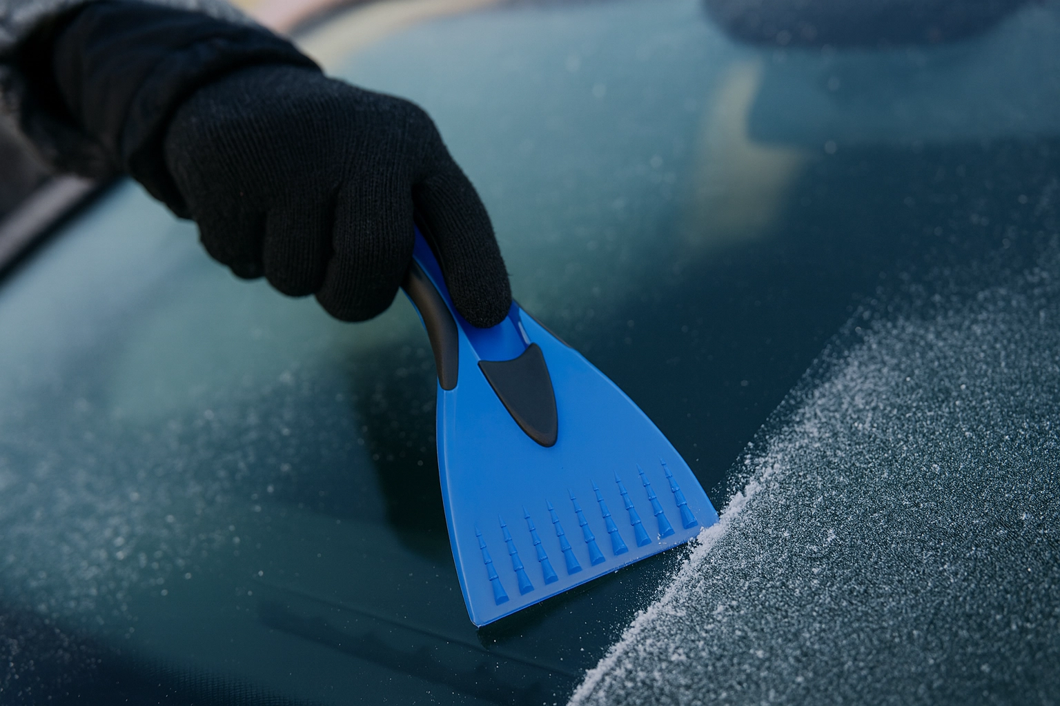Gezahnte Zähne brechen schnell dicke Eisschichten auf, während die breite, glatte Kante die Scheibe in kurzer Zeit streifenfrei nachreinigt.