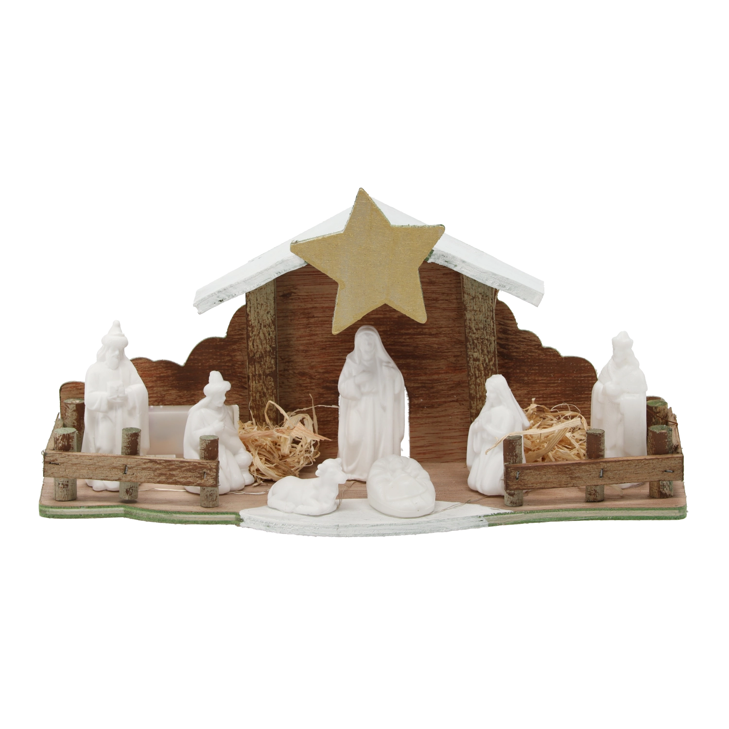 Ein Stall aus naturbelassenem Holz mit Zaun, Stern und Strohakzenten wirkt authentisch und passt hervorragend zur Weihnachtsdekoration.