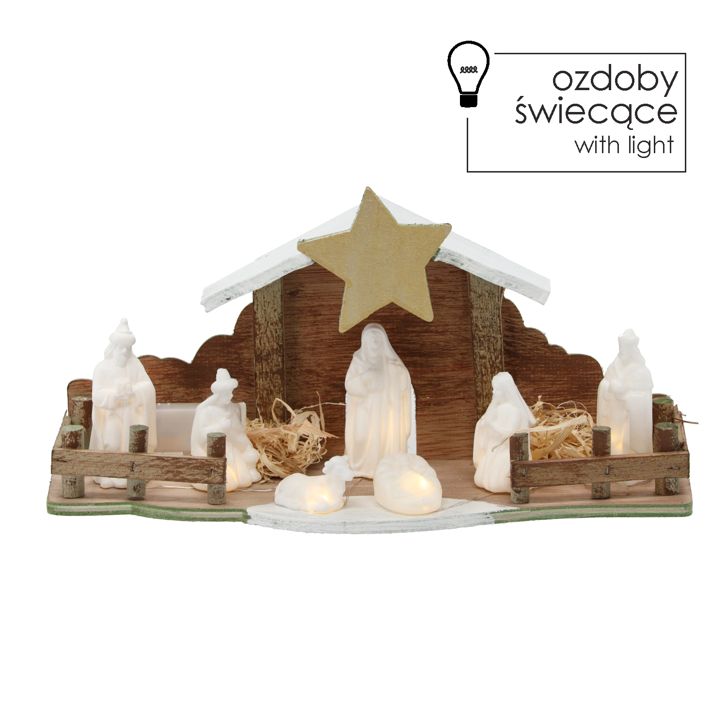 Holz, dekoratives Stroh; weiße Figuren