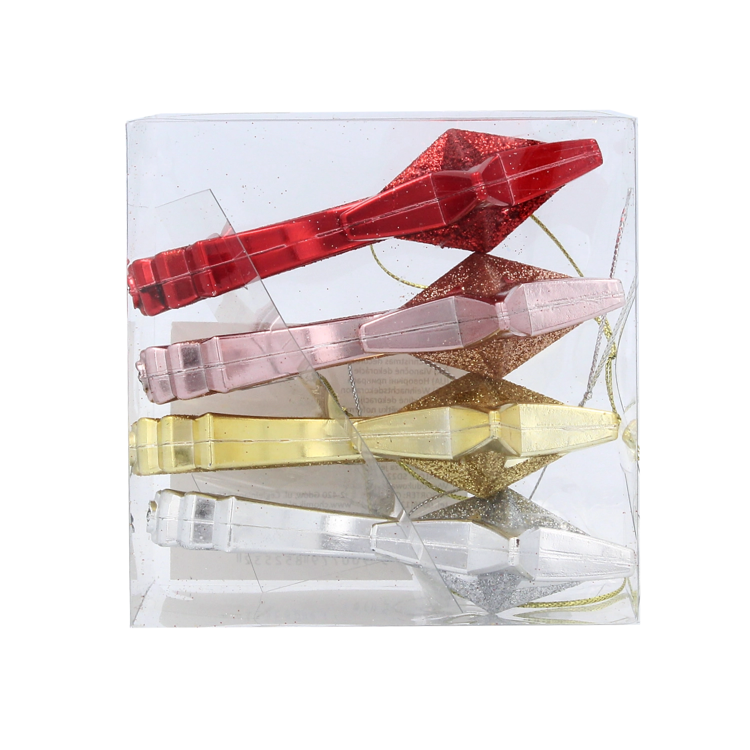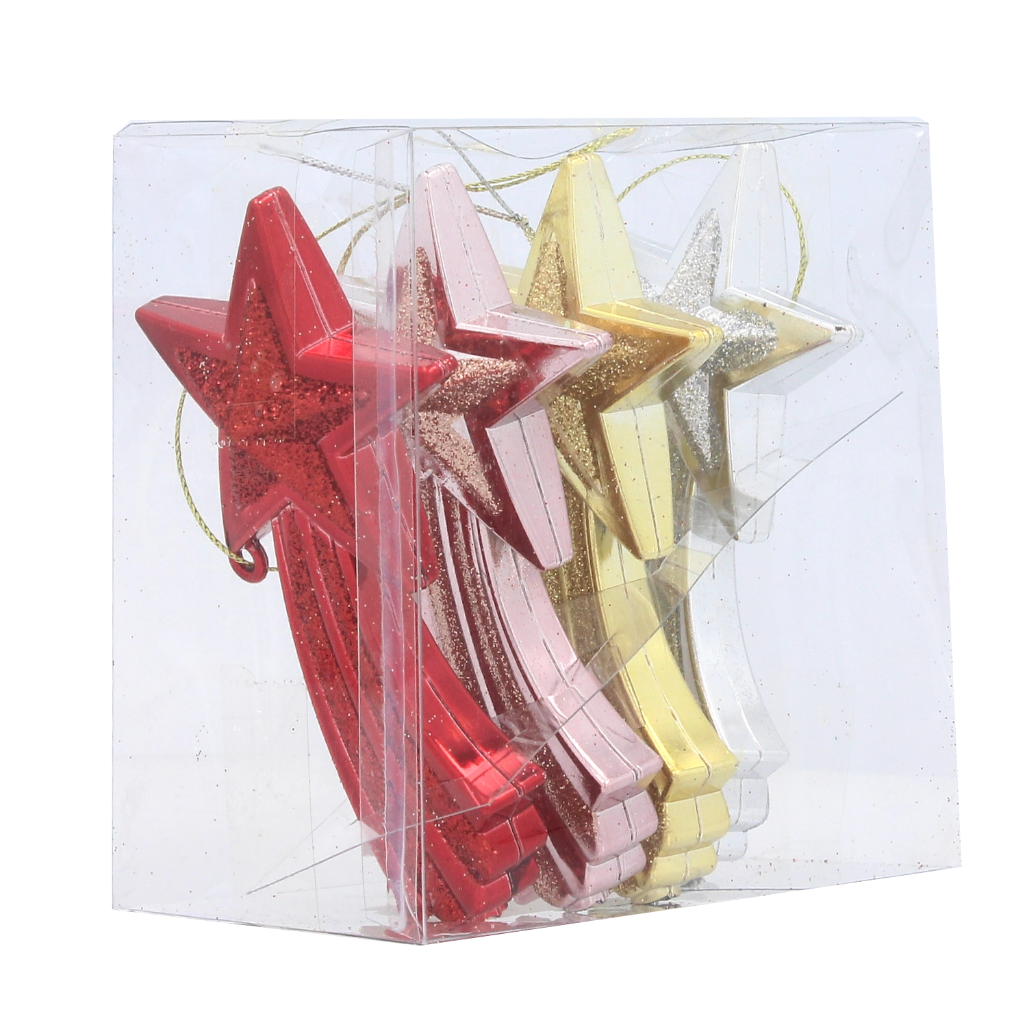 Verleihen Sie Ihrem Baum und dem ganzen Zuhause festlichen Glanz mit einem Set aus vier Ornamenten in Form einer Sternschnuppe mit 11 cm Größe. Die Schmuckstücke aus robustem Kunststoff sind leicht, sicher und verfügen über eine praktische Aufhängeschnur. Die vier eleganten Farben – rot, gold, silber und rosa – lassen sich mühelos mit Ihrer Dekoration kombinieren und schaffen eine harmonische Weihnachtsatmosphäre.