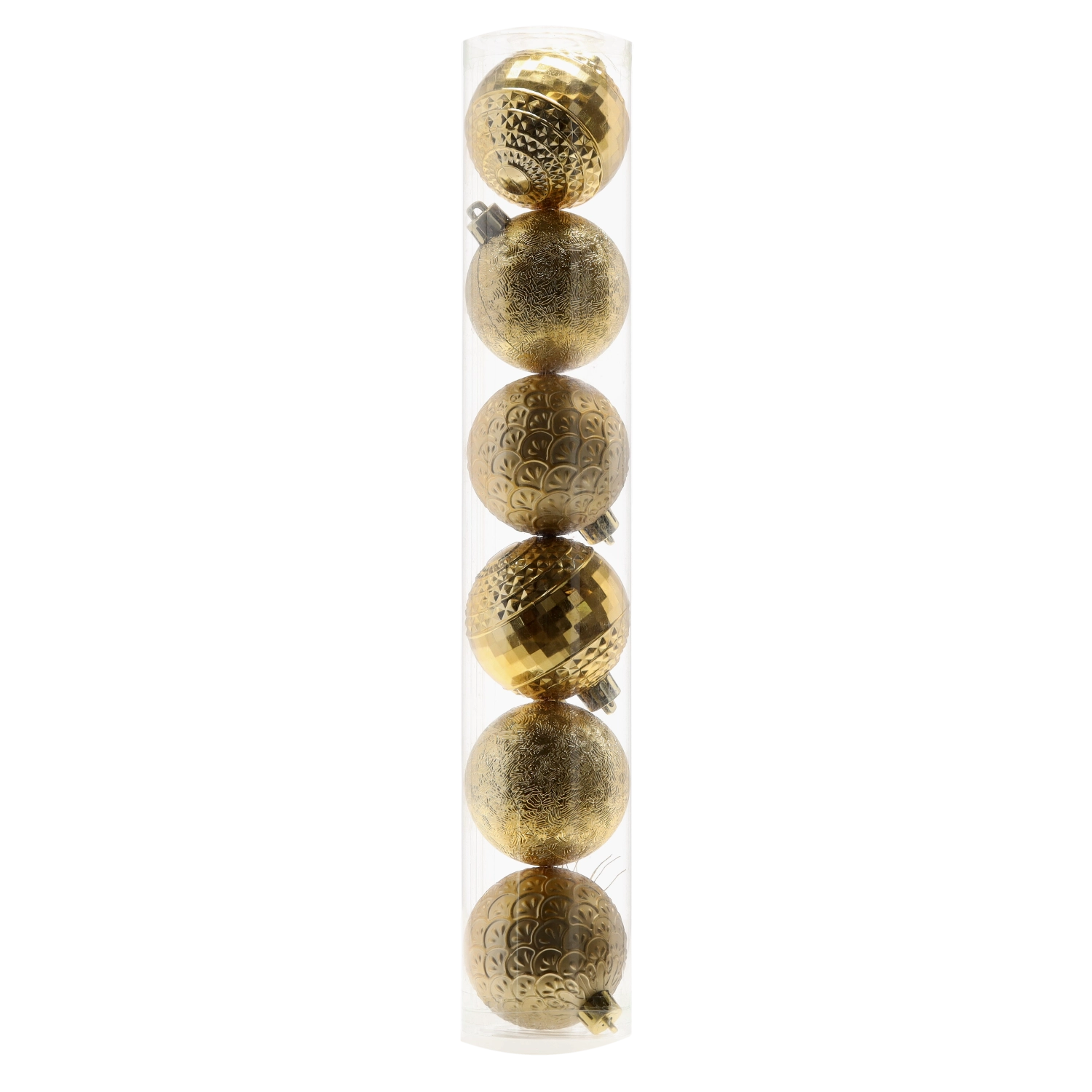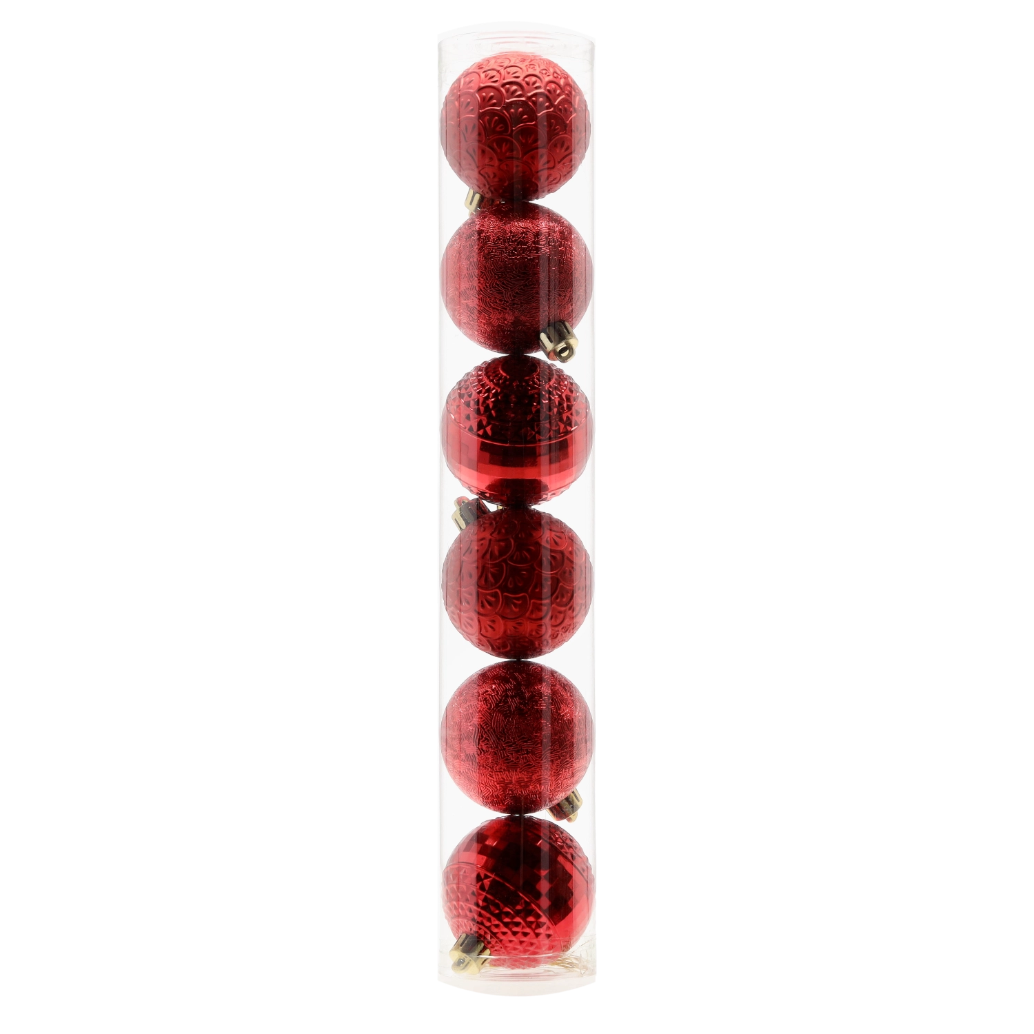 Schaffen Sie eine harmonische Festtagsatmosphäre mit einem Set aus sechs Weihnachtskugeln mit 6 cm Durchmesser in Rot, Gold und Silber. Bruchsicherer Kunststoff sorgt für Sicherheit und Langlebigkeit, verschiedene dekorative Texturen und Muster verleihen Baum und Deko Eleganz und Glanz. Die praktische transparente Röhre erleichtert die Aufbewahrung, und metallisch schimmernde Aufhängeschnüre ermöglichen ein einfaches Aufhängen.