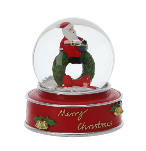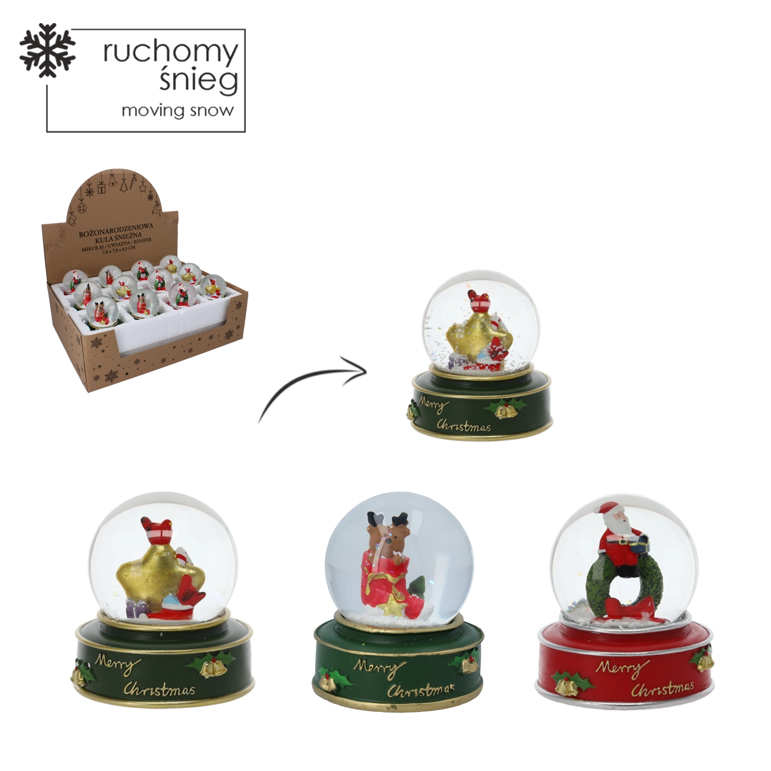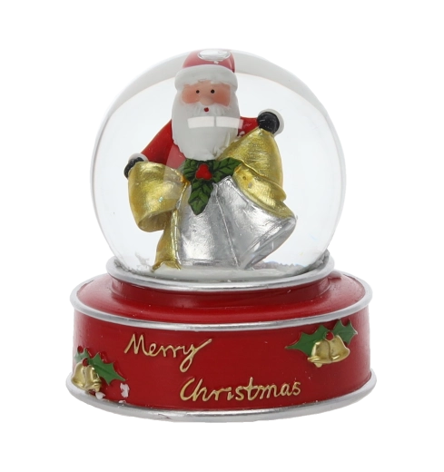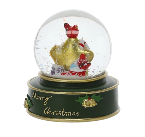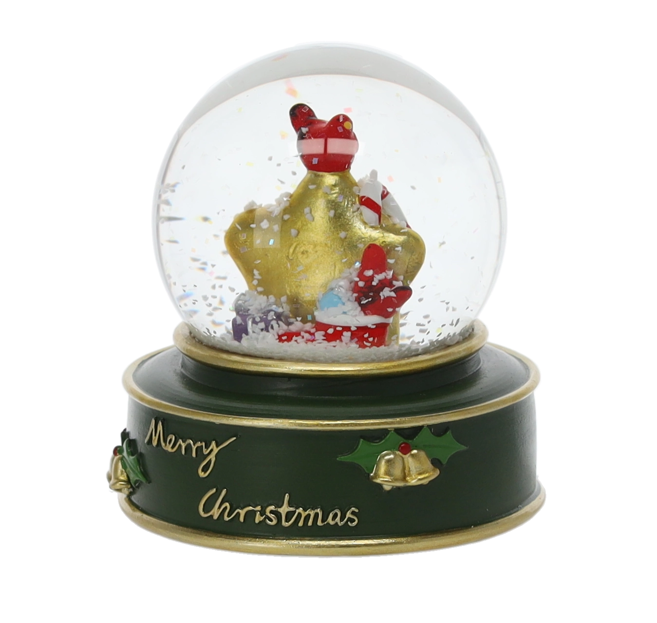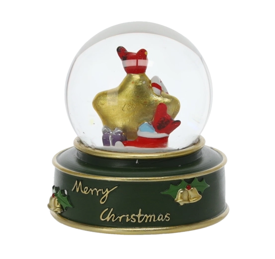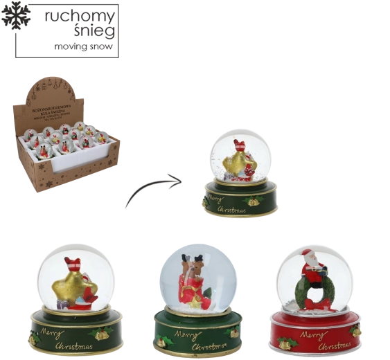 Stilvolle weihnachtliche Schneekugel mit Glaskuppel und stabilem, farbigem Sockel mit der Aufschrift „Merry Christmas“ verleiht Ihrem Interieur sofort festliche Atmosphäre. Nach dem Schütteln entsteht der Effekt fallenden Schnees, der die detaillierten Figuren vom Weihnachtsmann, Stern oder Rentier hervorhebt.