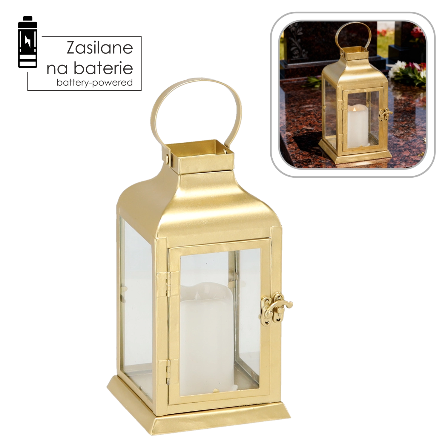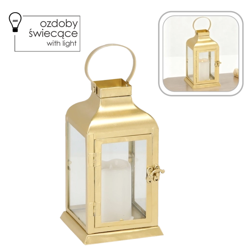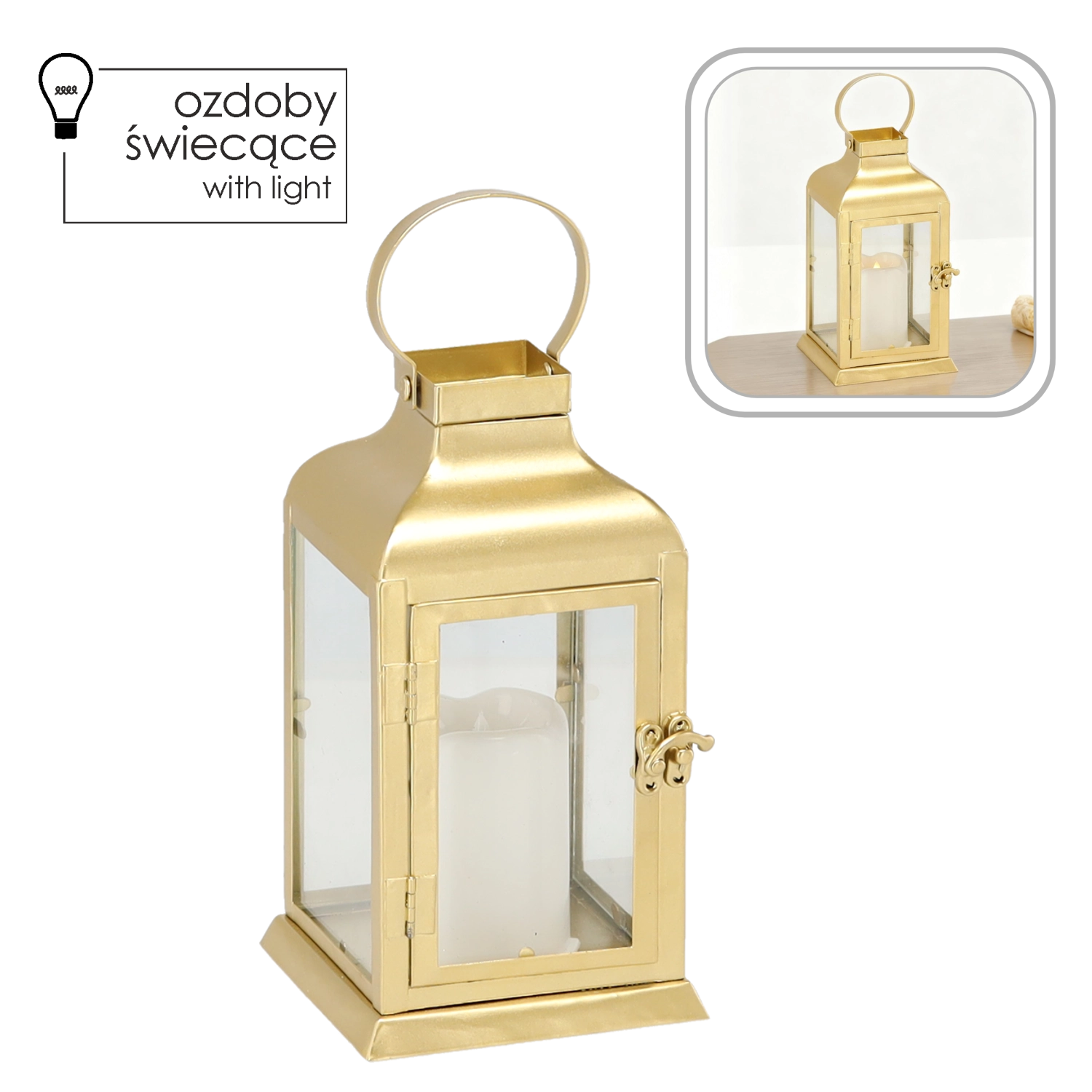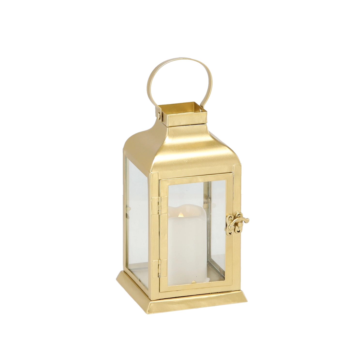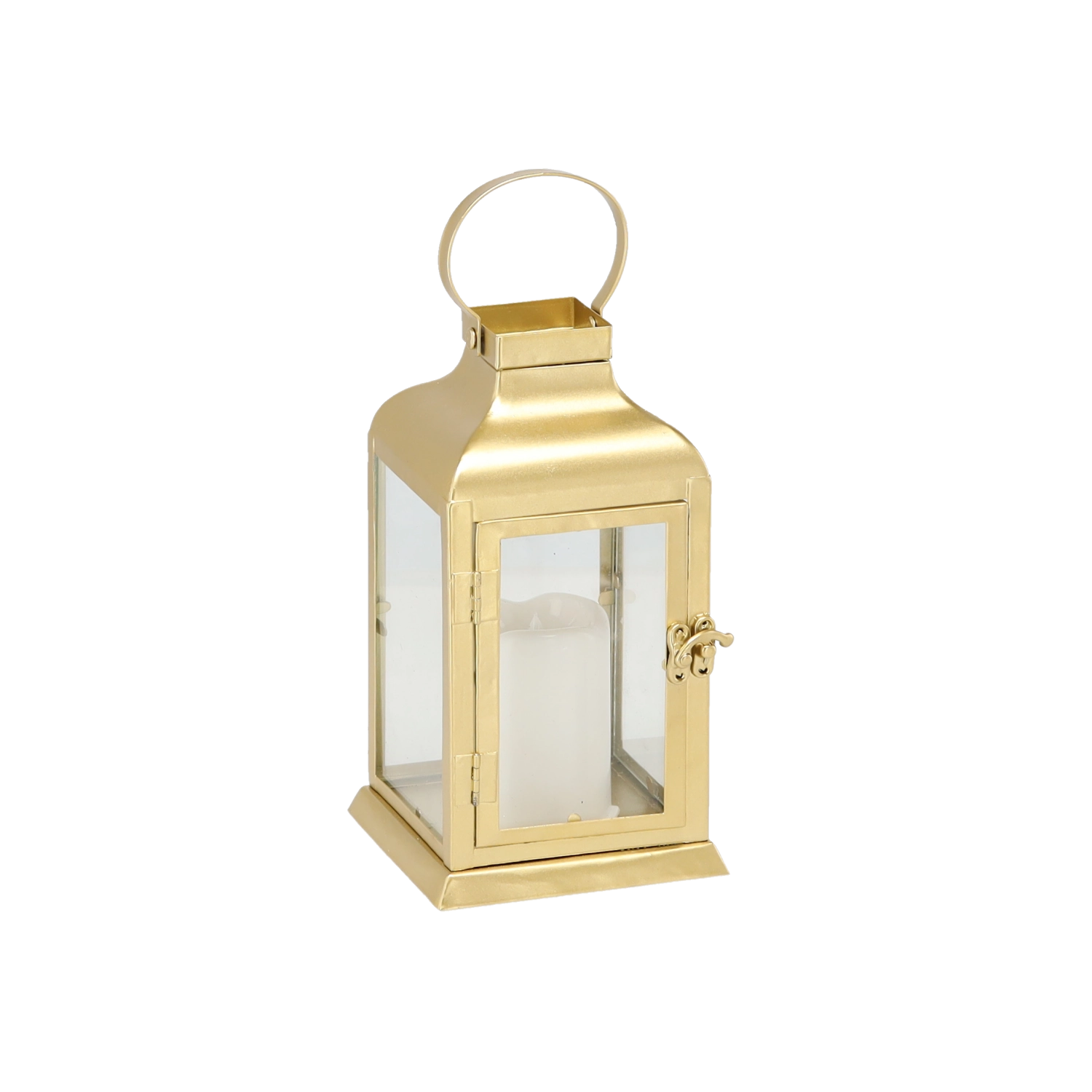Stilvolle goldene Metall-Laterne mit integrierter LED-Kerze, die eine gemütliche Atmosphäre ohne Rauch und Wachs schafft. Dank des Batteriebetriebs ideal für Innenräume und geschützte Außenbereiche; die Glaswände betonen das warme Licht für festliche und ganzjährige Deko.