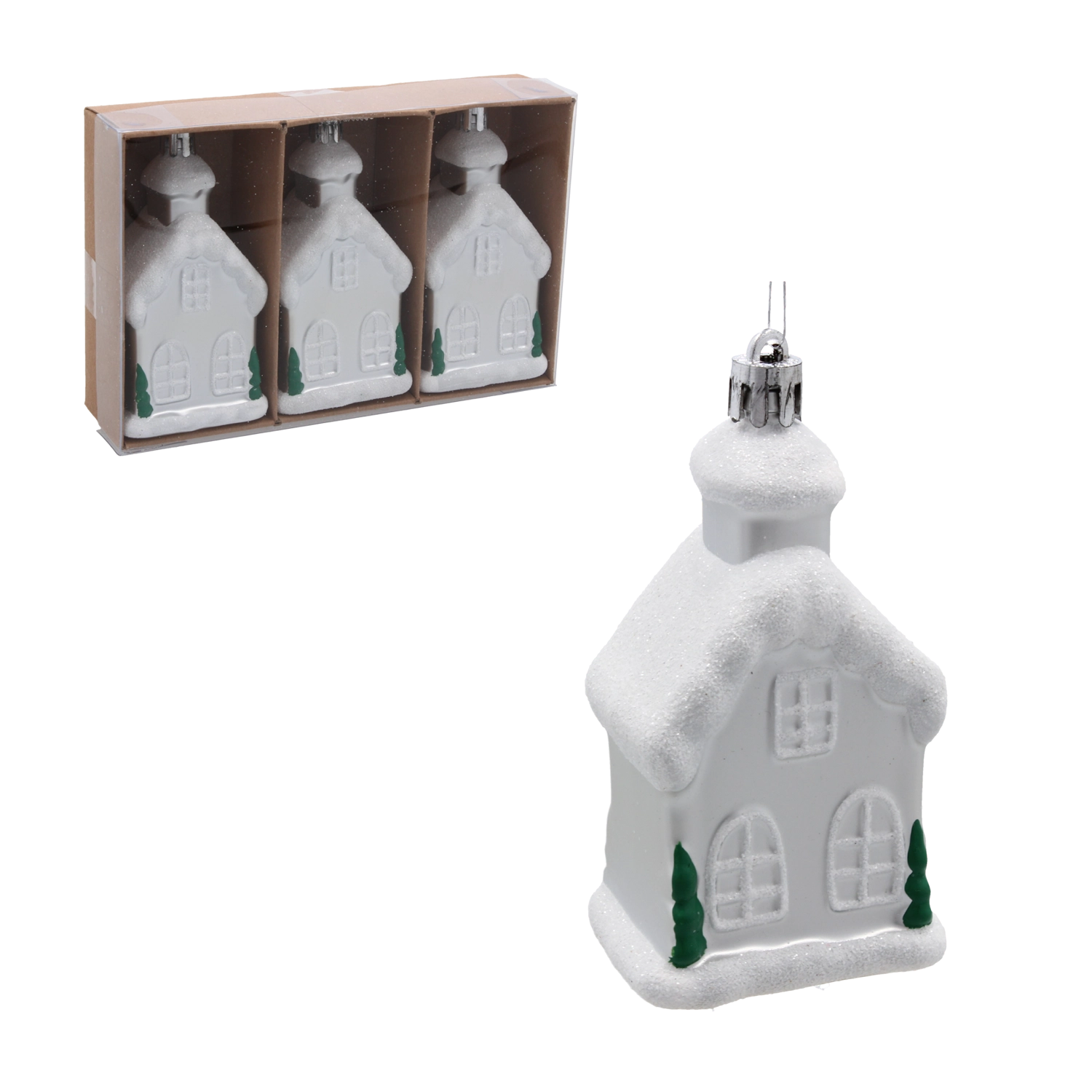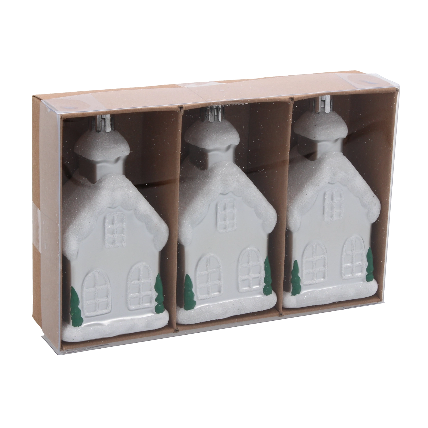 Die glitzernden Elemente auf der Oberfläche der Häuschen fangen das Licht wunderschön ein und unterstreichen die festliche Stimmung. Die Ornamente sind in einer praktischen Kunststoffverpackung untergebracht, die sie beim Transport schützt und ein saisonales Aufbewahren erleichtert.
