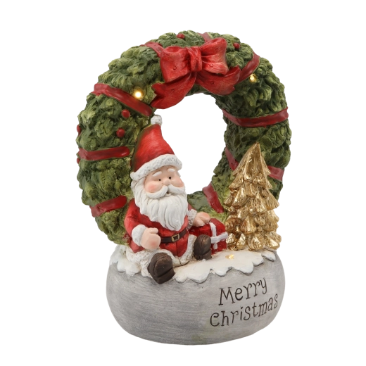 Diese elegante Weihnachtsfigur bringt eine warme Atmosphäre in Ihr Interieur. Der dekorative Kranz mit SANTA und der Aufschrift „Merry Christmas“ wird durch ein sanftes LED-Licht ergänzt, das Details hervorhebt und ein gemütliches Licht auf dem Regal, der Kommode oder der Fensterbank schafft. Das hochwertige Magnesia-Material gewährleistet Widerstandsfähigkeit und Langlebigkeit.