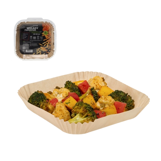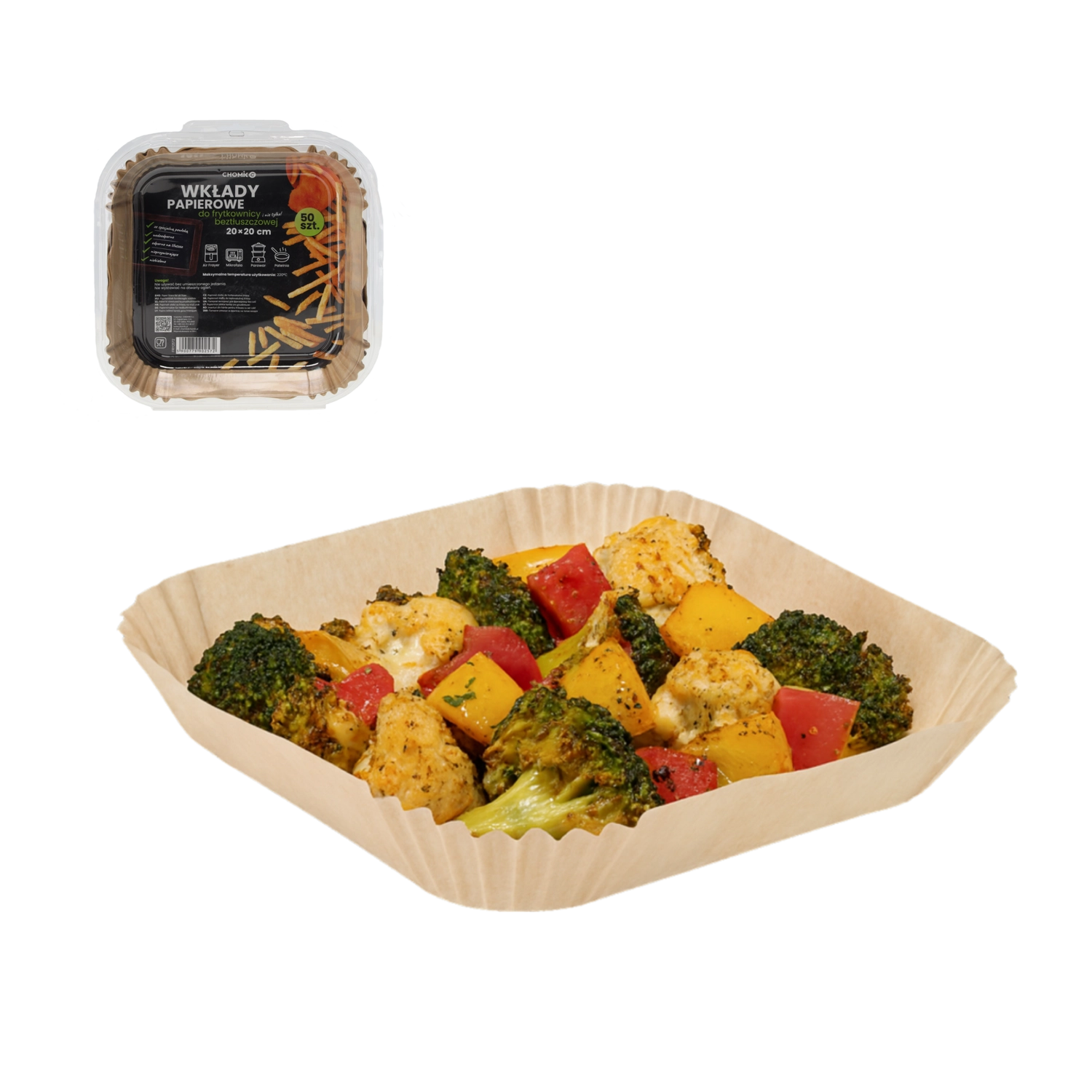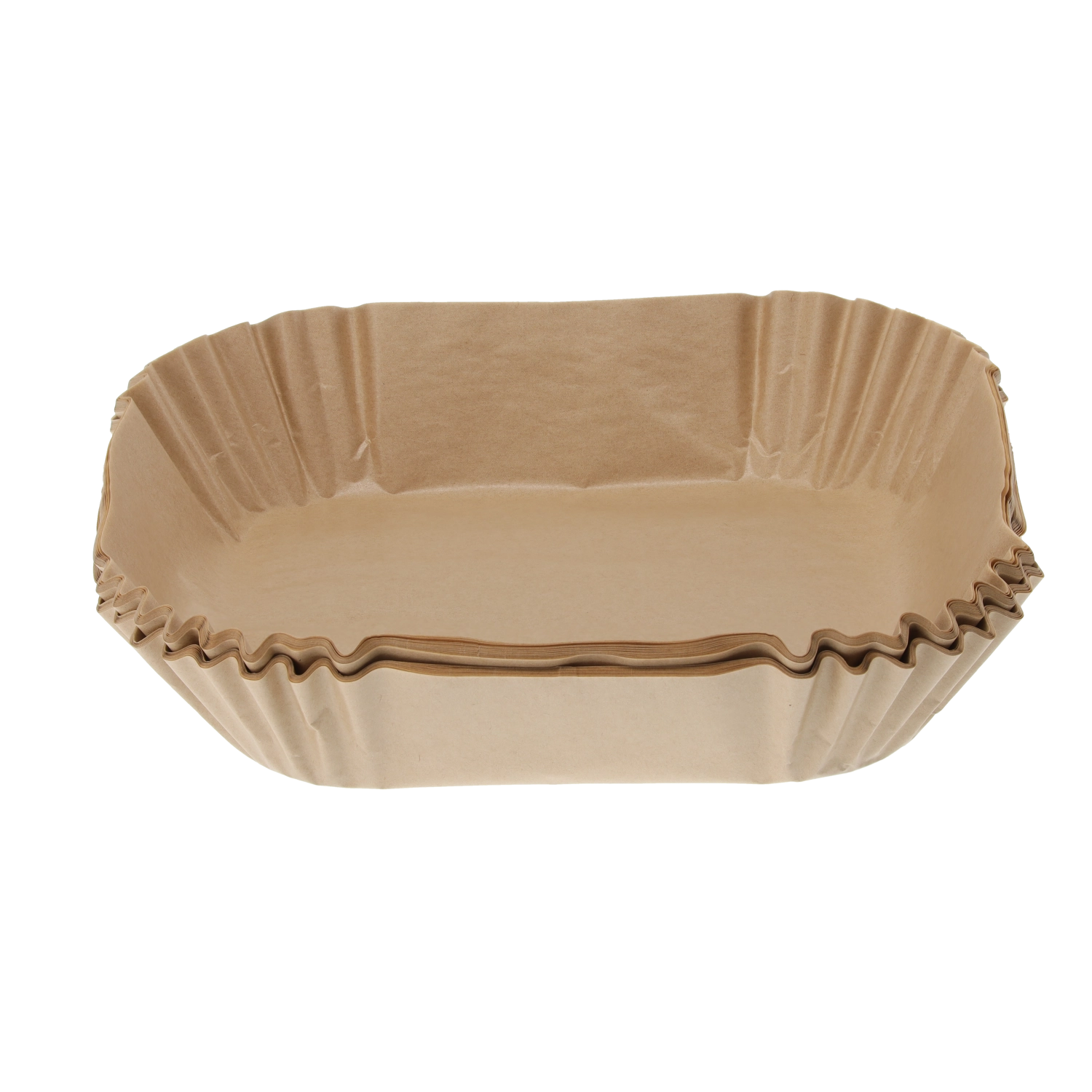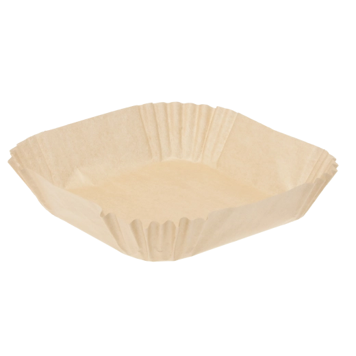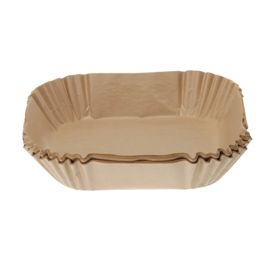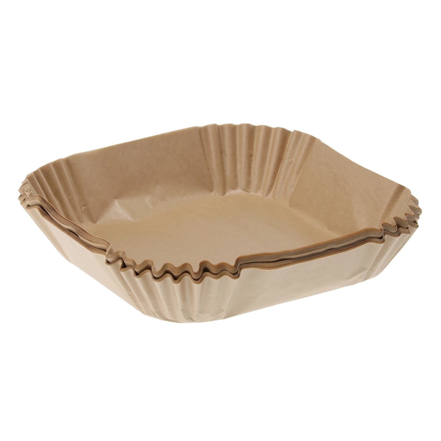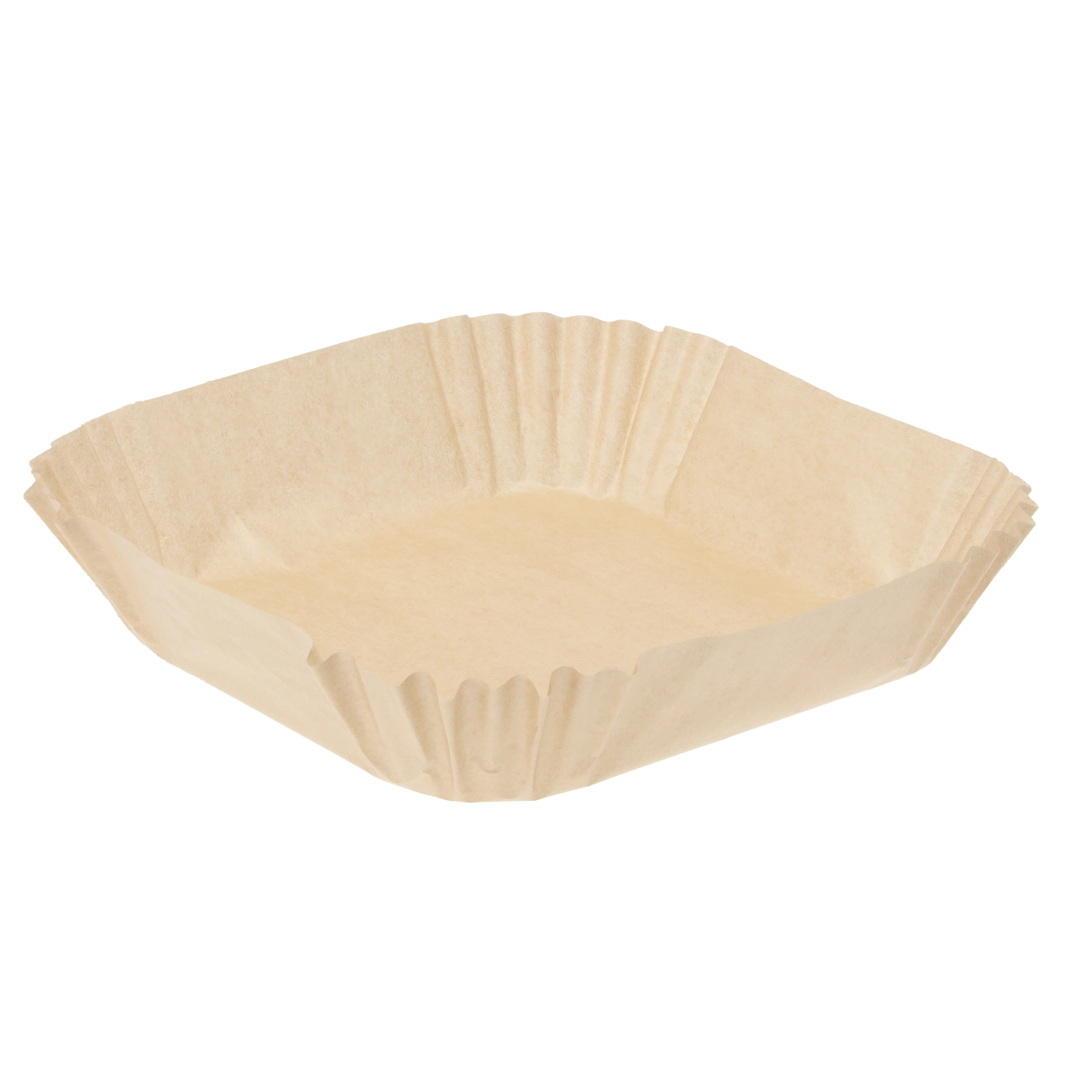 Die Einlagen bestehen aus ungebleichtem Papier in natürlichem Braun, sind lebensmittelecht (Zertifizierungen: FDA, LFGB, FSC) und für vielseitige Anwendungen geeignet: Heißluftfritteuse, Mikrowelle, Dampfgaren und Braten in der Pfanne.