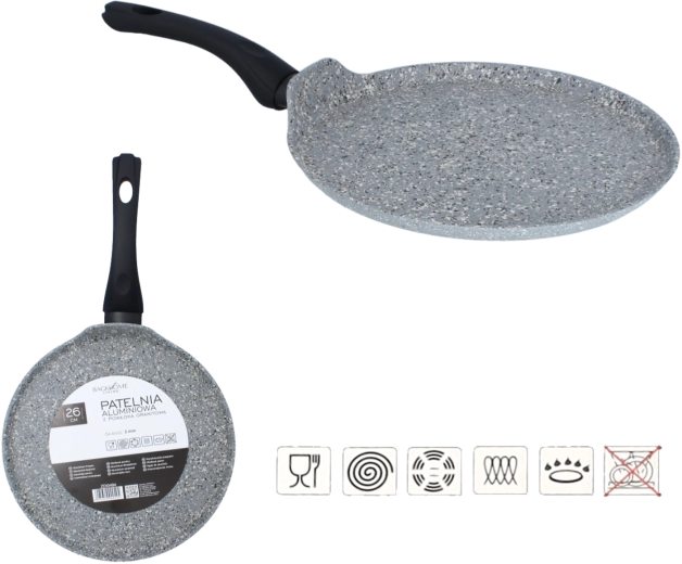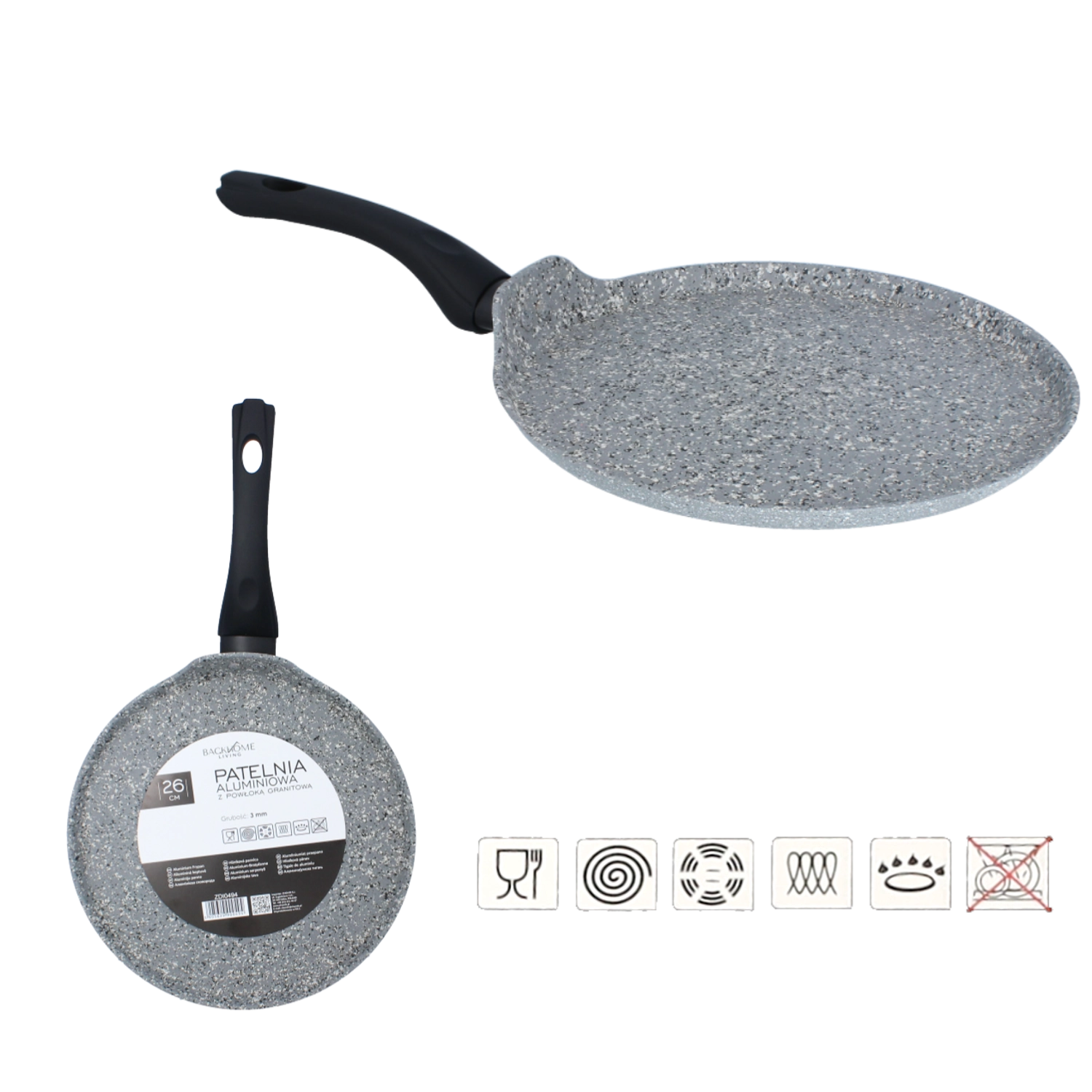 Diese Pfanne mit niedrigen Rändern ist für perfekt dünne Crêpes und schnelle Frühstücksrezepte konzipiert. Geschmiedetes Aluminium mit 4,0 mm Wand- und 3,0 mm Bodenstärke bietet hohe Stabilität, hervorragende Wärmeleitung und Formbeständigkeit. Die beidseitige granitierte Beschichtung ist hitzebeständig und kratzfest, sodass die Pfanne langfristig hervorragend aussieht und funktioniert.
