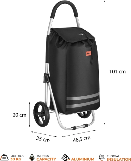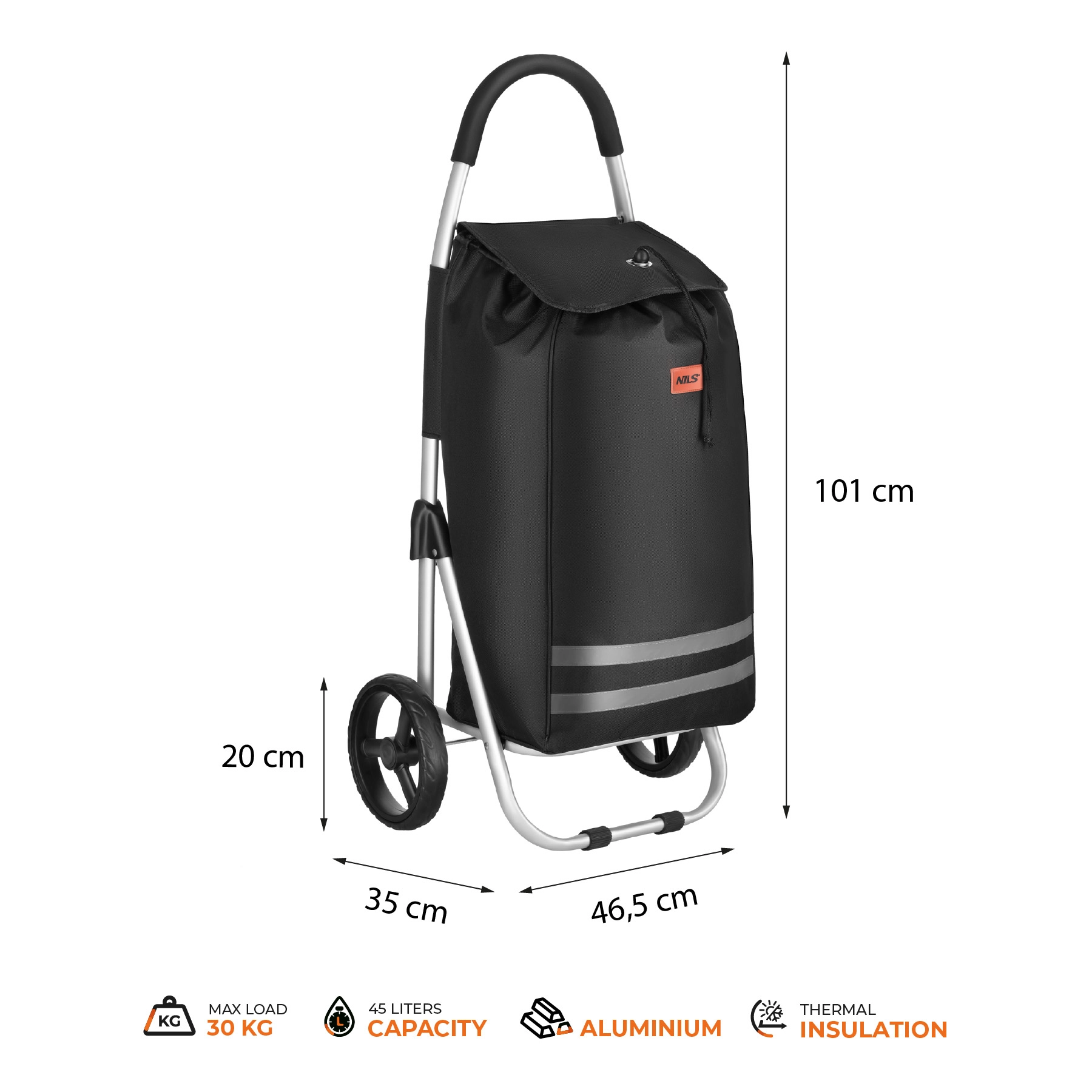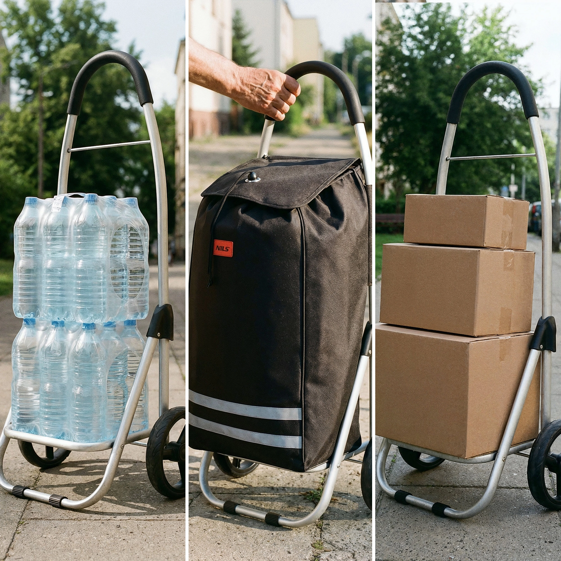 Der praktische klappbare Einkaufswagen NILS mit einem Volumen von 45 l kombiniert einen leichten Aluminiumrahmen, eine thermoisolierte Kammer und eine Tragfähigkeit bis zu 30 kg. Große Räder 20 × 3,5 cm sorgen für eine ruhige Fahrt, reflektierende Elemente erhöhen die Sicherheit und der Kordelzug mit Klappe schützt den Inhalt. Ideal für größere Einkäufe in der Stadt, auf dem Markt oder für den Wochenendausflug.
