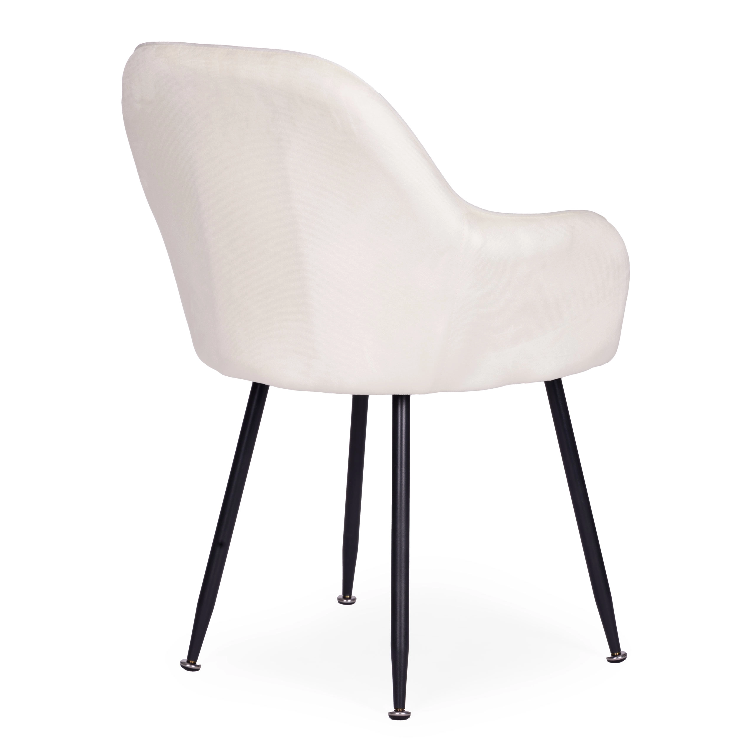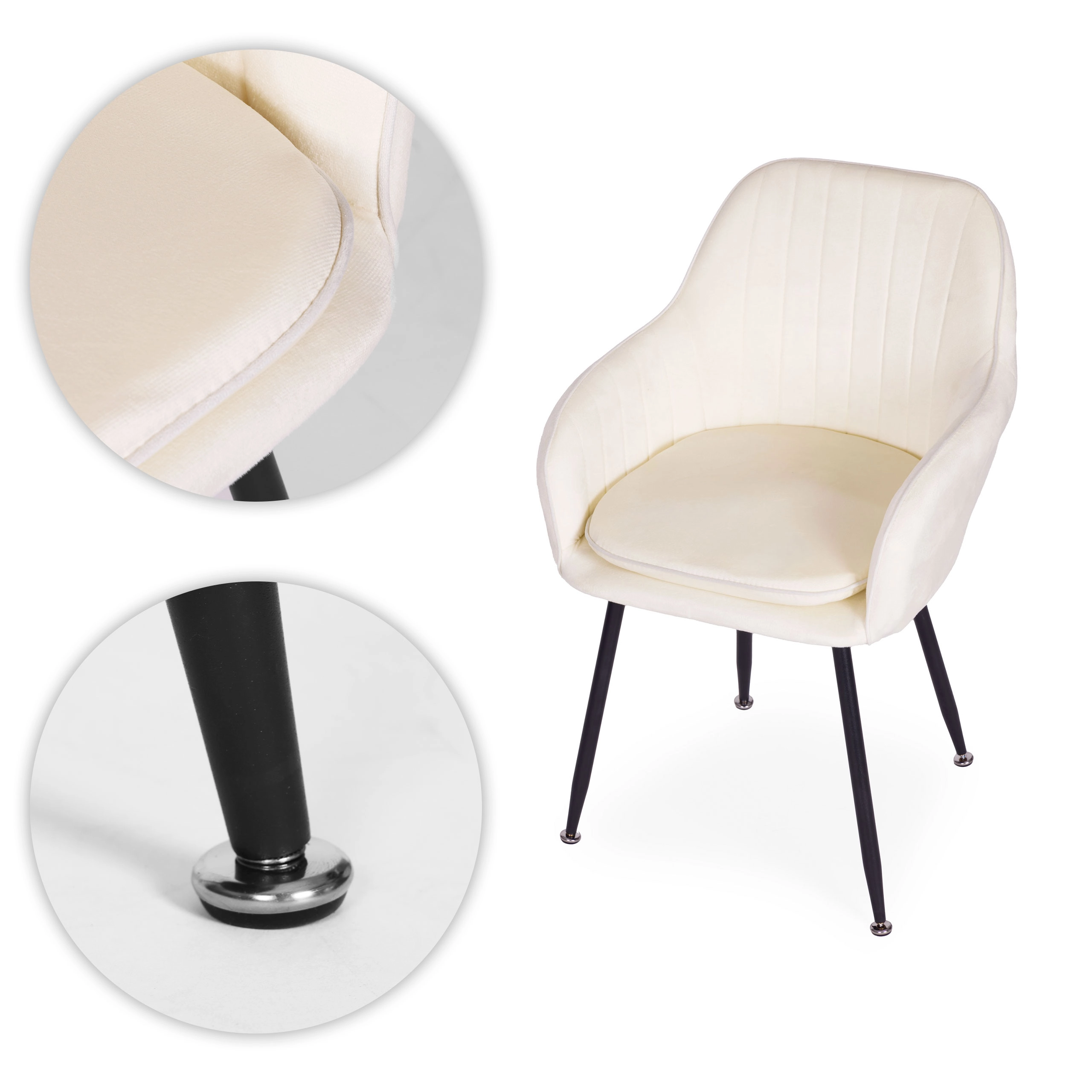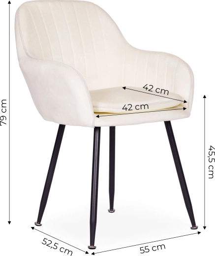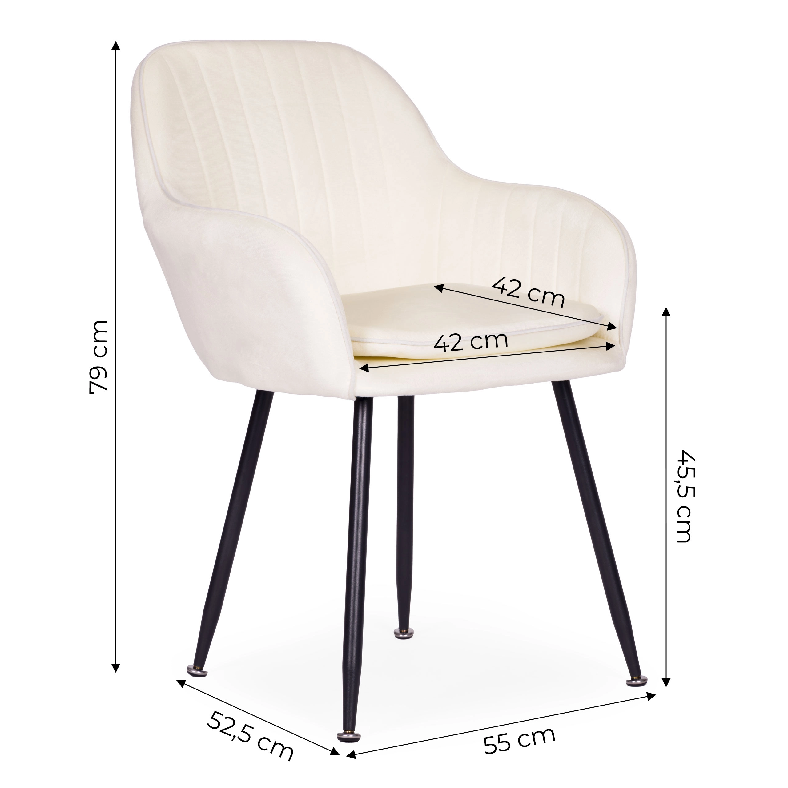 Der stilvolle cremefarbene Stuhl ModernHome mit zartem Samtbezug, bequemer Rückenlehne mit Armlehnen und schlanken Stahlbeinen bietet elegantes Design und täglichen Komfort. Ideal für Esszimmer und Wohnzimmer, fügt er sich mühelos in moderne und Glamour-Interieurs ein. Tragfähigkeit 120 kg, stabile Konstruktion und Schutzkappen gegen Kratzer auf dem Boden.