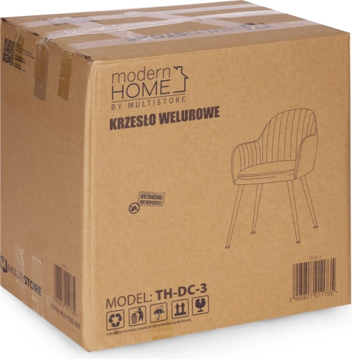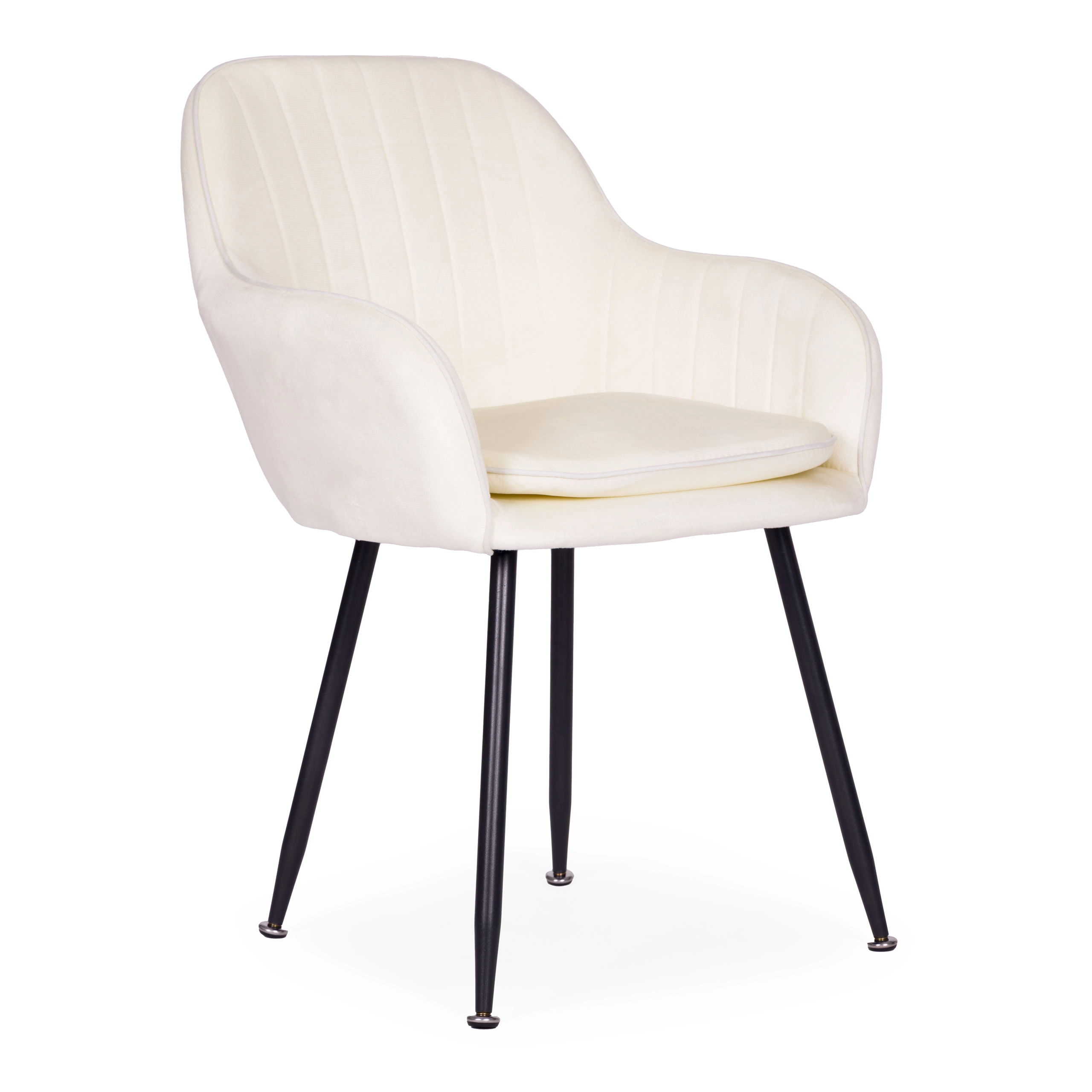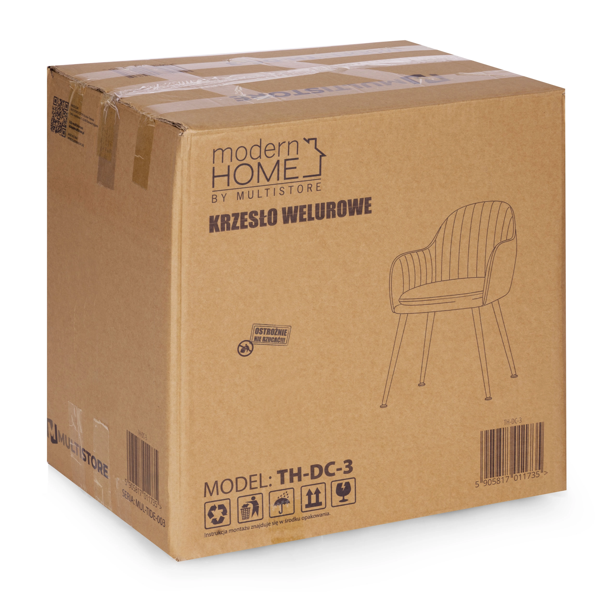 Der stilvolle cremefarbene Stuhl ModernHome mit zartem Samtbezug, bequemer Rückenlehne mit Armlehnen und schlanken Stahlbeinen bietet elegantes Design und täglichen Komfort. Ideal für Esszimmer und Wohnzimmer, fügt er sich mühelos in moderne und Glamour-Interieurs ein. Tragfähigkeit 120 kg, stabile Konstruktion und Schutzkappen gegen Kratzer auf dem Boden.