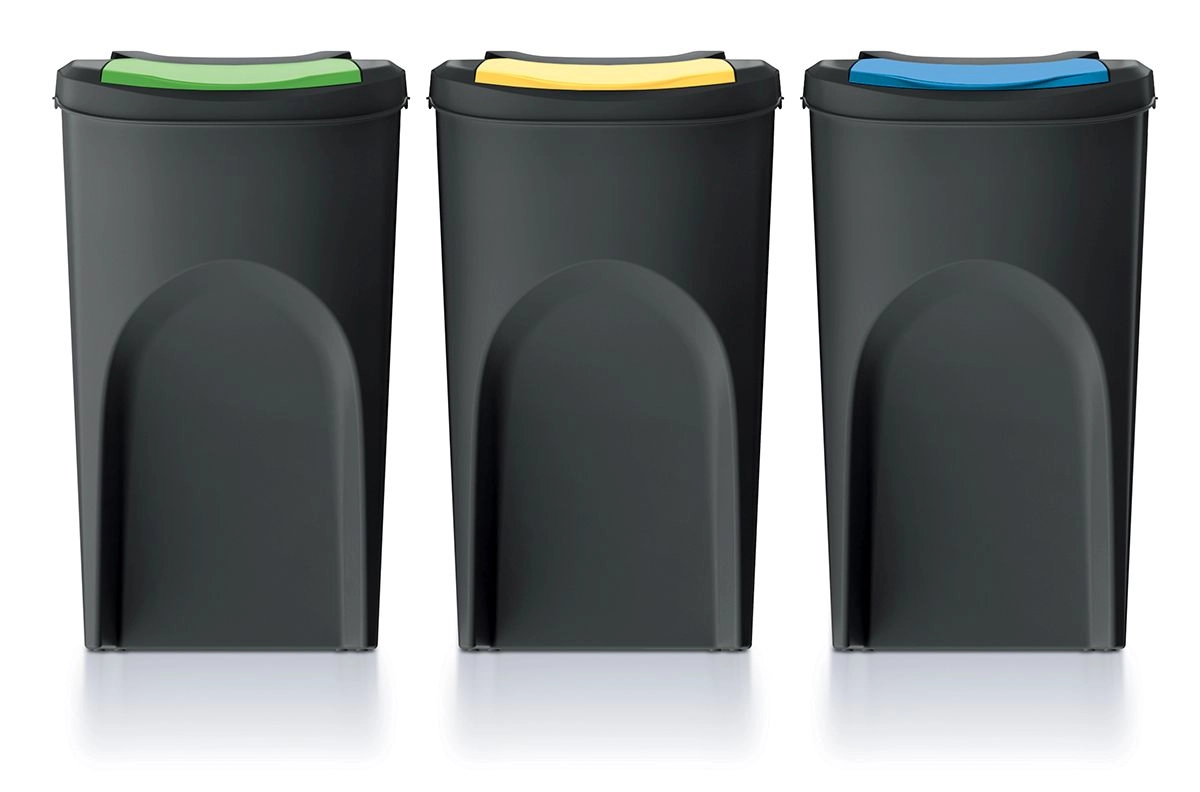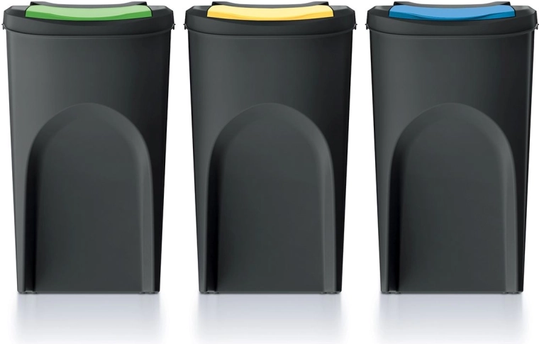 Jeder Behälter hat ein Volumen von 35 Litern und fasst problemlos Papier, Kunststoffe, Glas sowie Restmüll. Der praktische Frontdeckel erleichtert das Einwerfen, ohne die oberen Teile abnehmen zu müssen. Die Mülltrennung wird so schnell, sauber und übersichtlich.