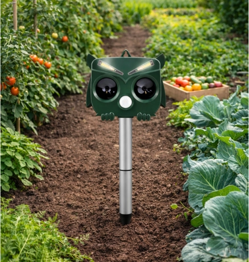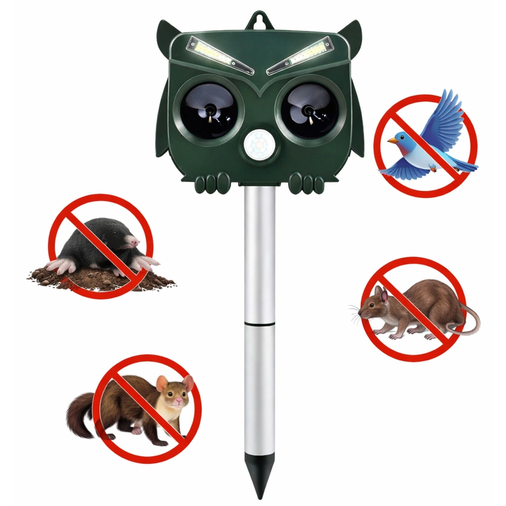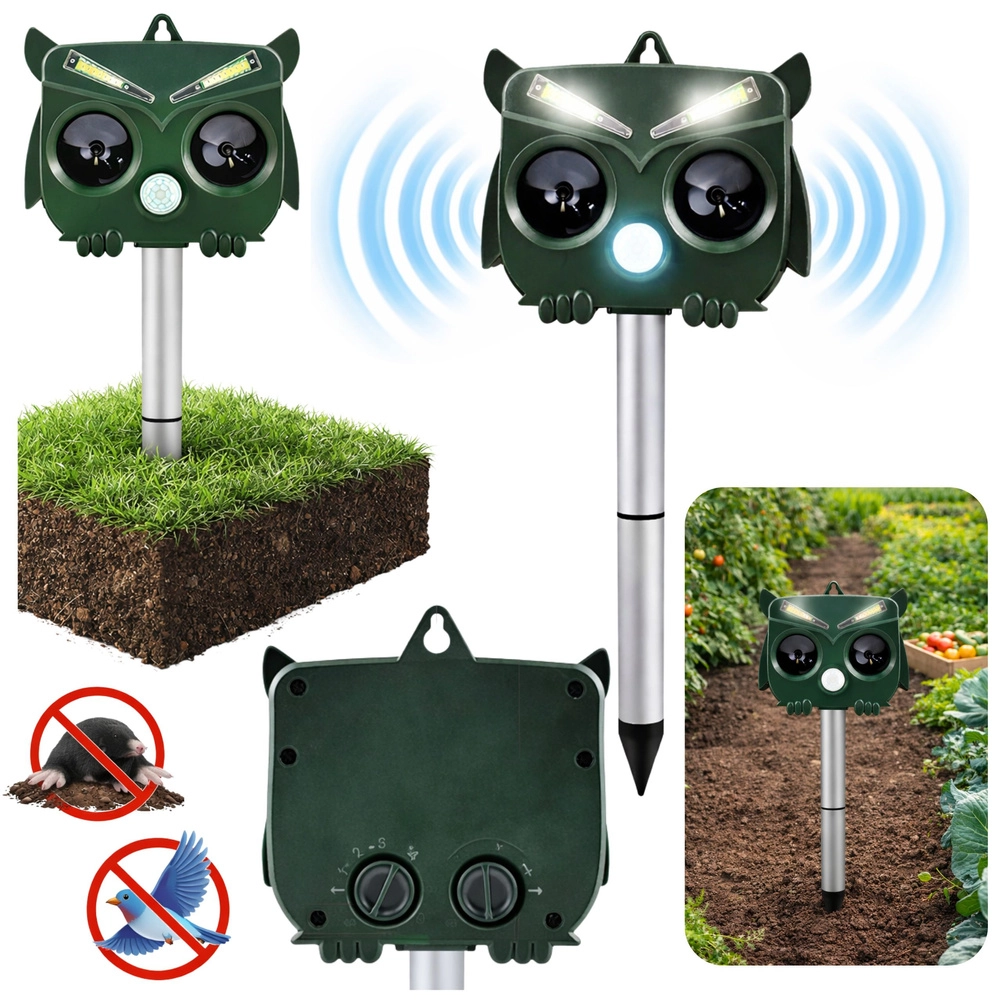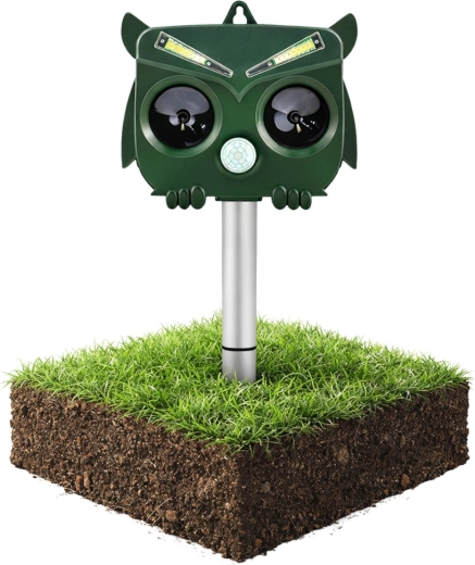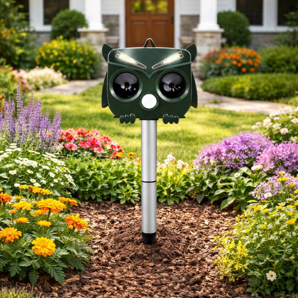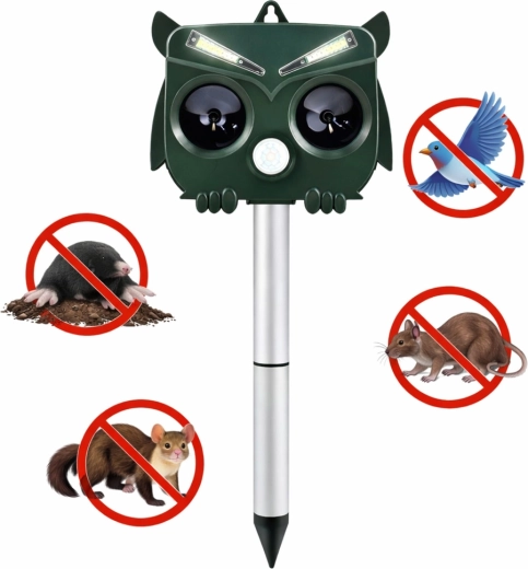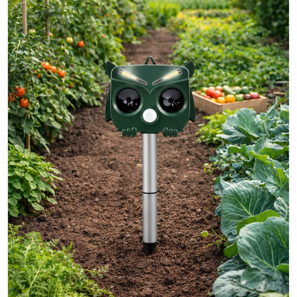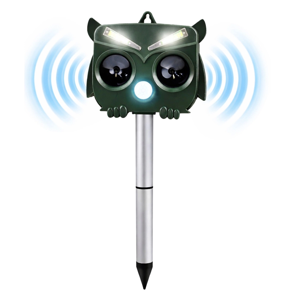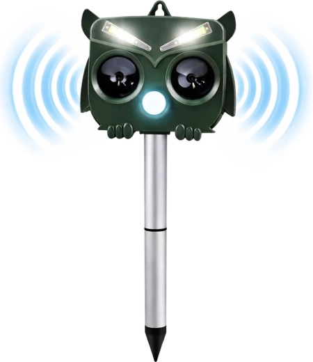 Das Eulen-Design wirkt natürlich und schreckt in Kombination mit Ultraschall, Schall und LED-Blitzen unerwünschte Tiere zuverlässig ab – ohne deren Gesundheit zu beeinträchtigen. Der PIR-Sensor aktiviert das Gerät nur bei Bewegung, spart dadurch Energie und verlängert die Betriebszeit.