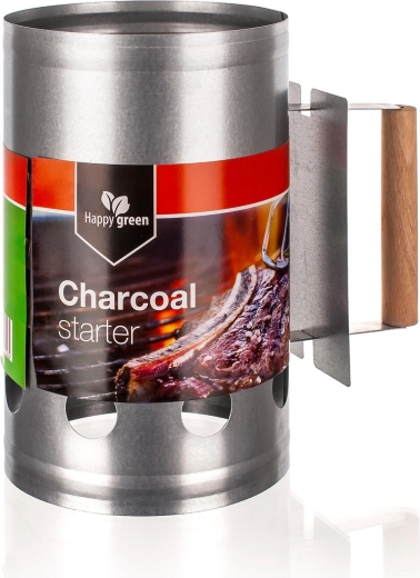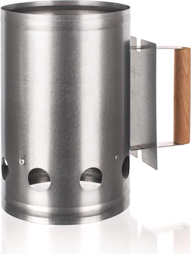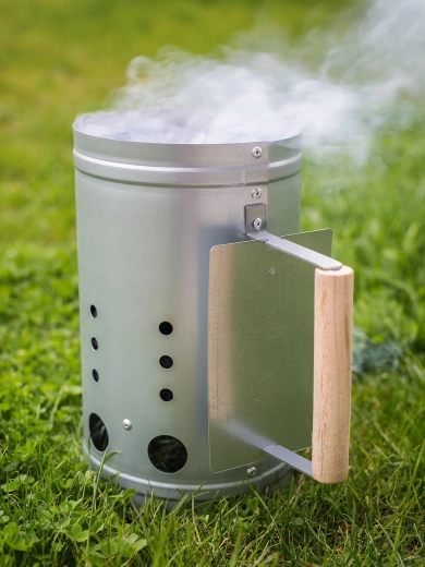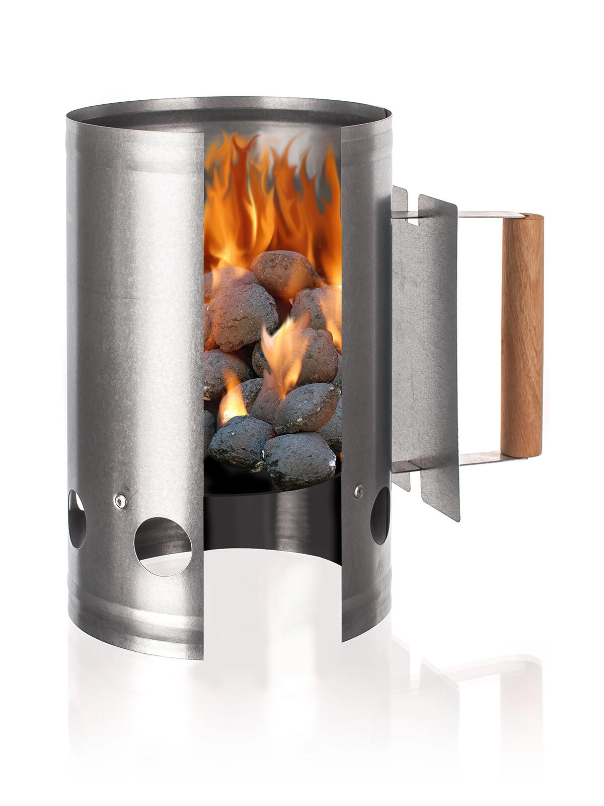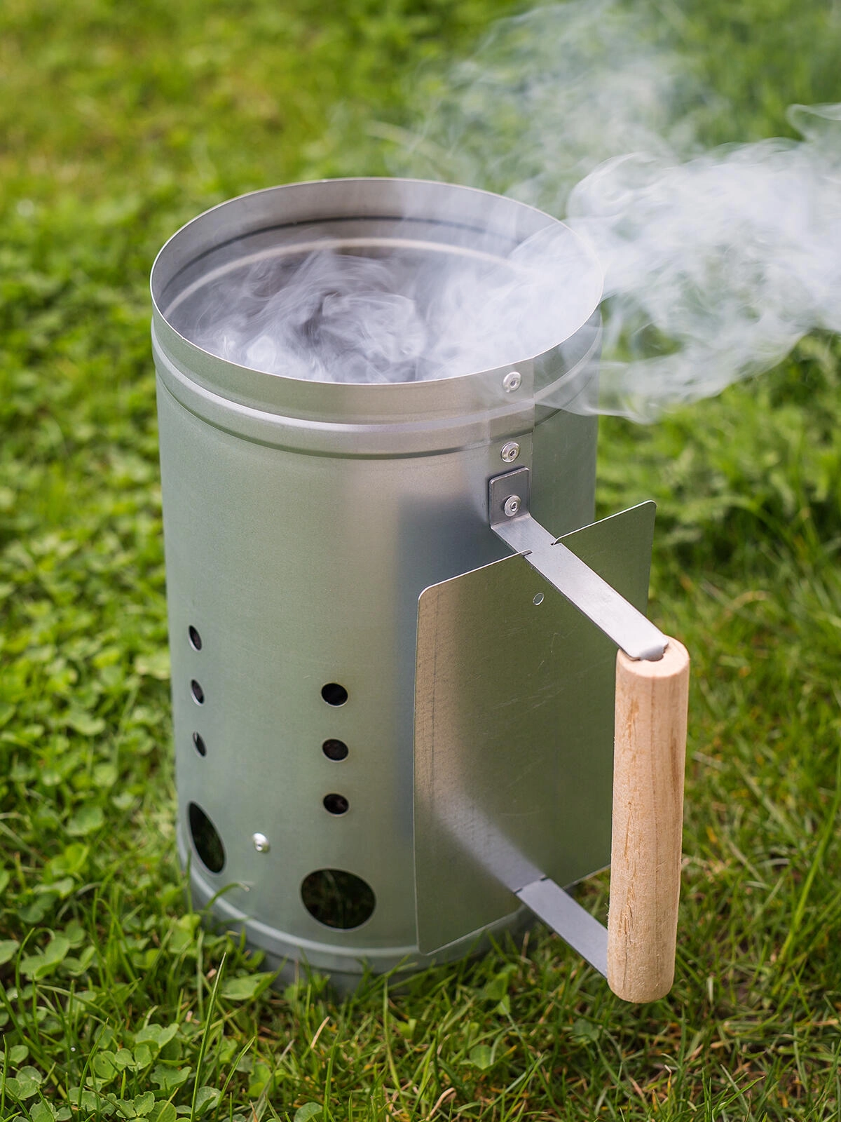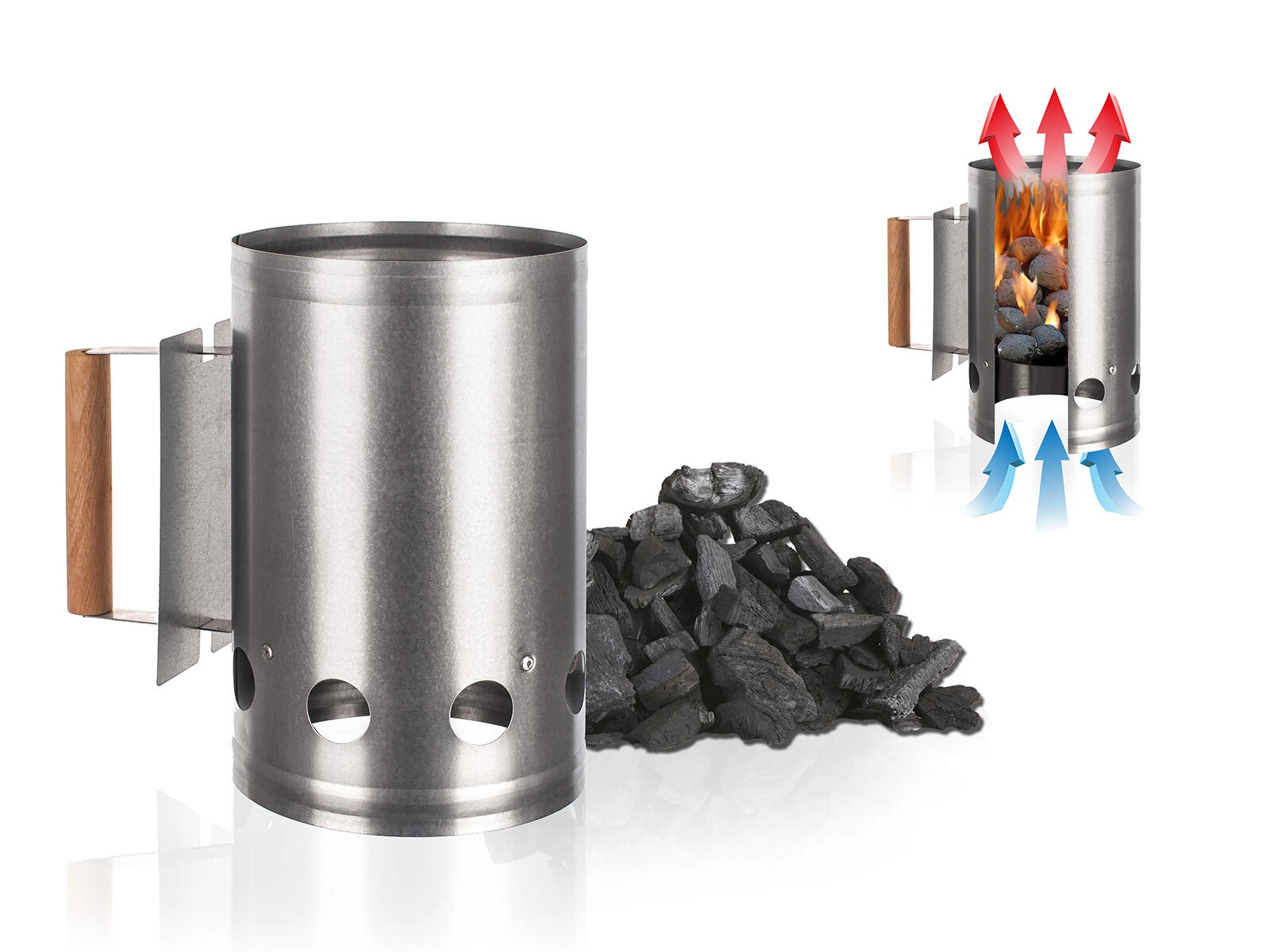 Praktischer Kohleanzünder, der für schnelles, sicheres und gleichmäßiges Durchglühen von Holzkohle oder Briketts in wenigen Minuten sorgt. Robuster, verzinkter Stahl, wärmeisolierter Holzgriff und clevere Lüftungsöffnungen für einen effizienten Kamineffekt.