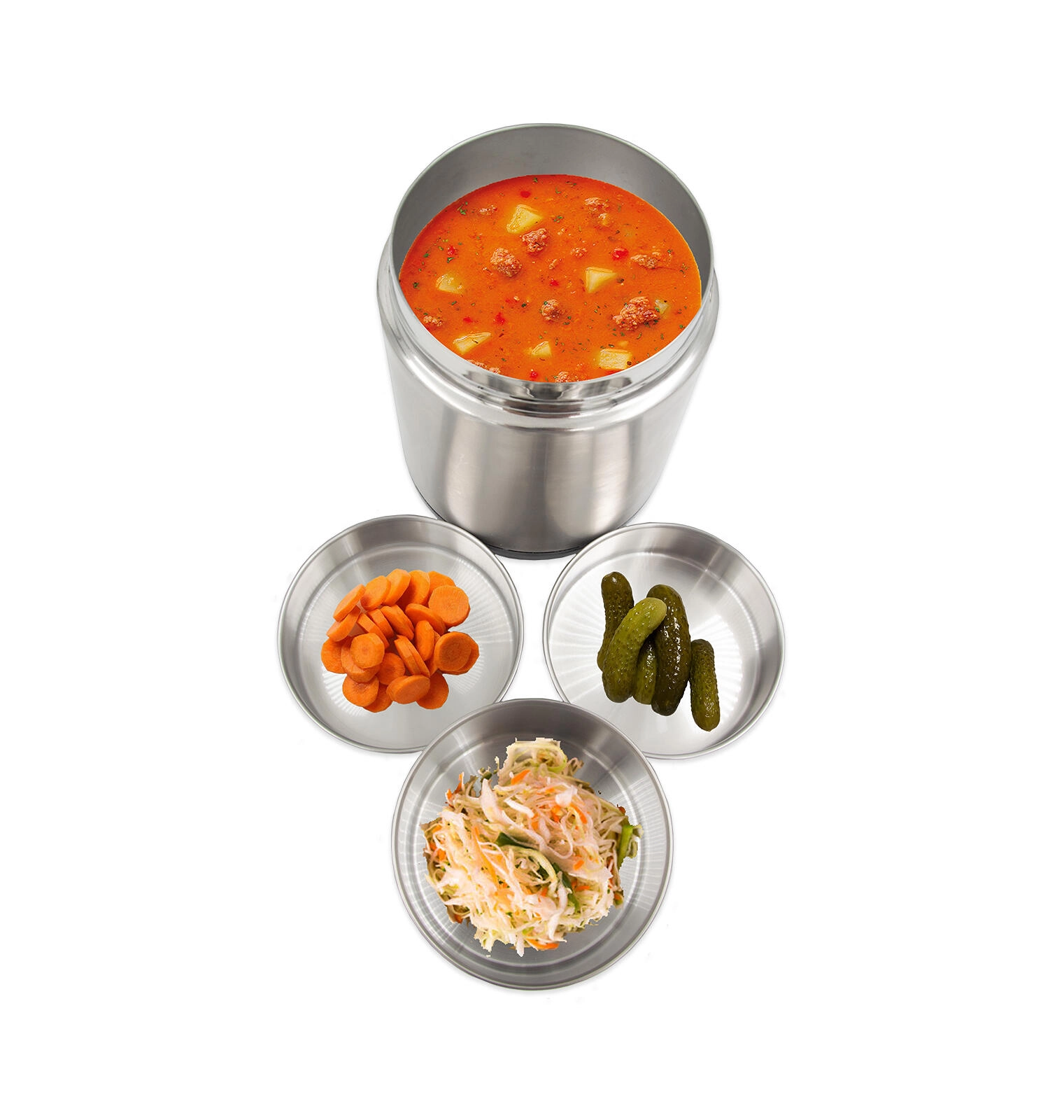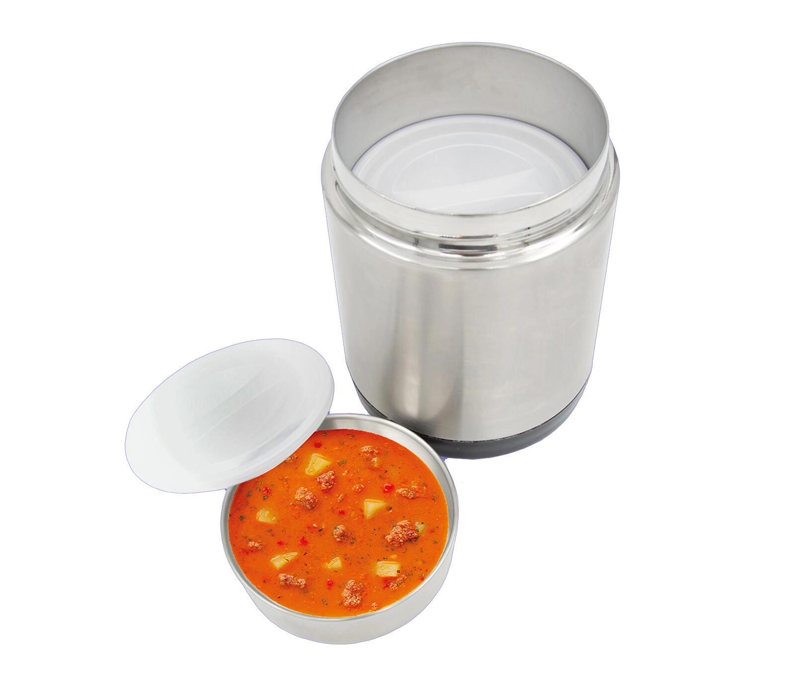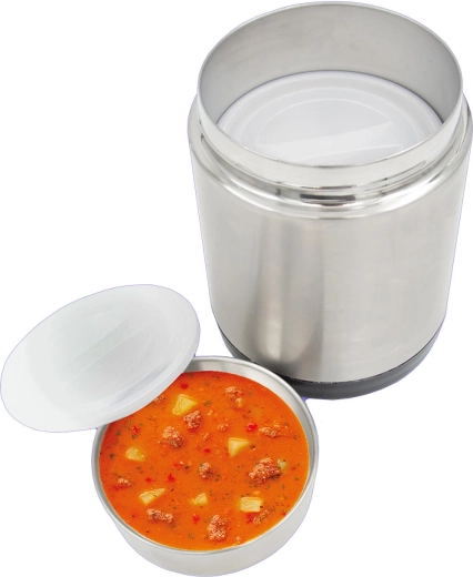 Nach dem Herausnehmen der Schalen kann der Behälter als geräumiger Speisenträger für Suppen, Risotto oder Saucen verwendet werden. Die weite Öffnung erleichtert das Befüllen und Reinigen, und der hochwertige Edelstahl sorgt für Langlebigkeit. Hervorragend geeignet für den täglichen Einsatz bei der Arbeit, auf Reisen, beim Sport sowie für Personen, die nicht im Restaurant essen. Der Thermobehälter ist auch für kalte Desserts geeignet, zum Beispiel für Eiscreme.