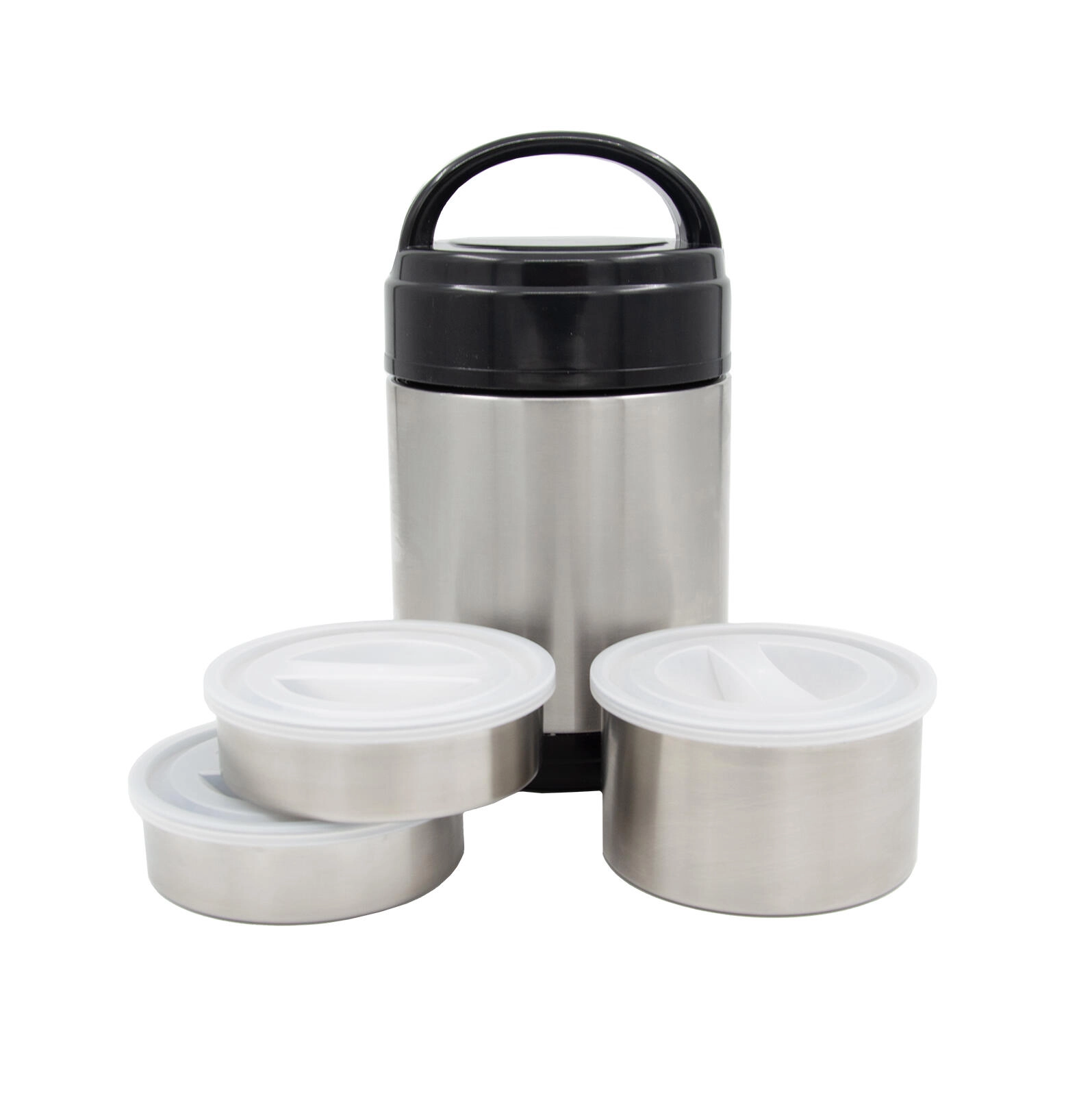 Der Lebensmittel-Thermobehälter mit einem Durchmesser von 11 cm kombiniert robusten Edelstahl mit praktischen Kunststoffelementen. Innen befinden sich drei separate Schalen – zwei mit 0,25 l und eine mit 0,5 l – jeweils mit einem dicht schließenden Kunststoffdeckel. So lassen sich verschiedene Gänge sicher trennen, Frische bewahren und bequem servieren. Der äußere Kunststoffboden reduziert Geräusche beim Abstellen und der robuste Griff erleichtert den Transport.