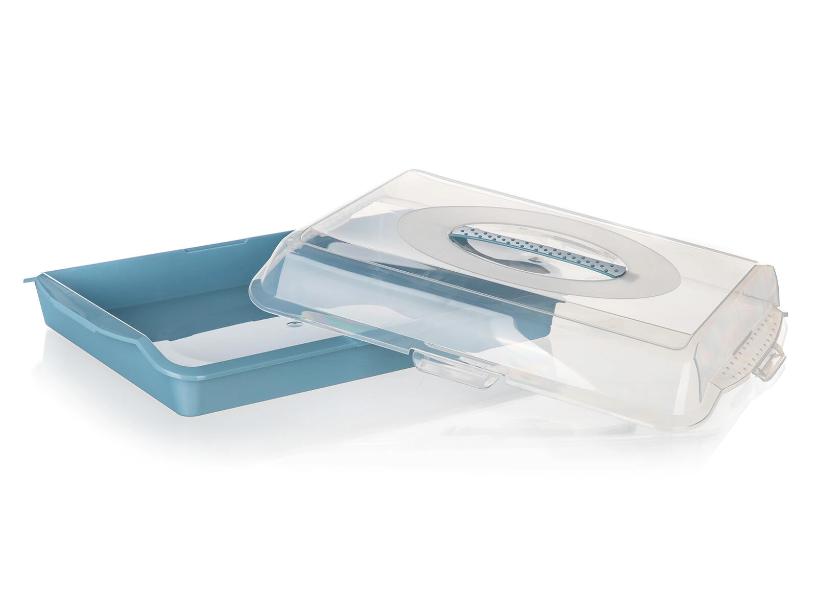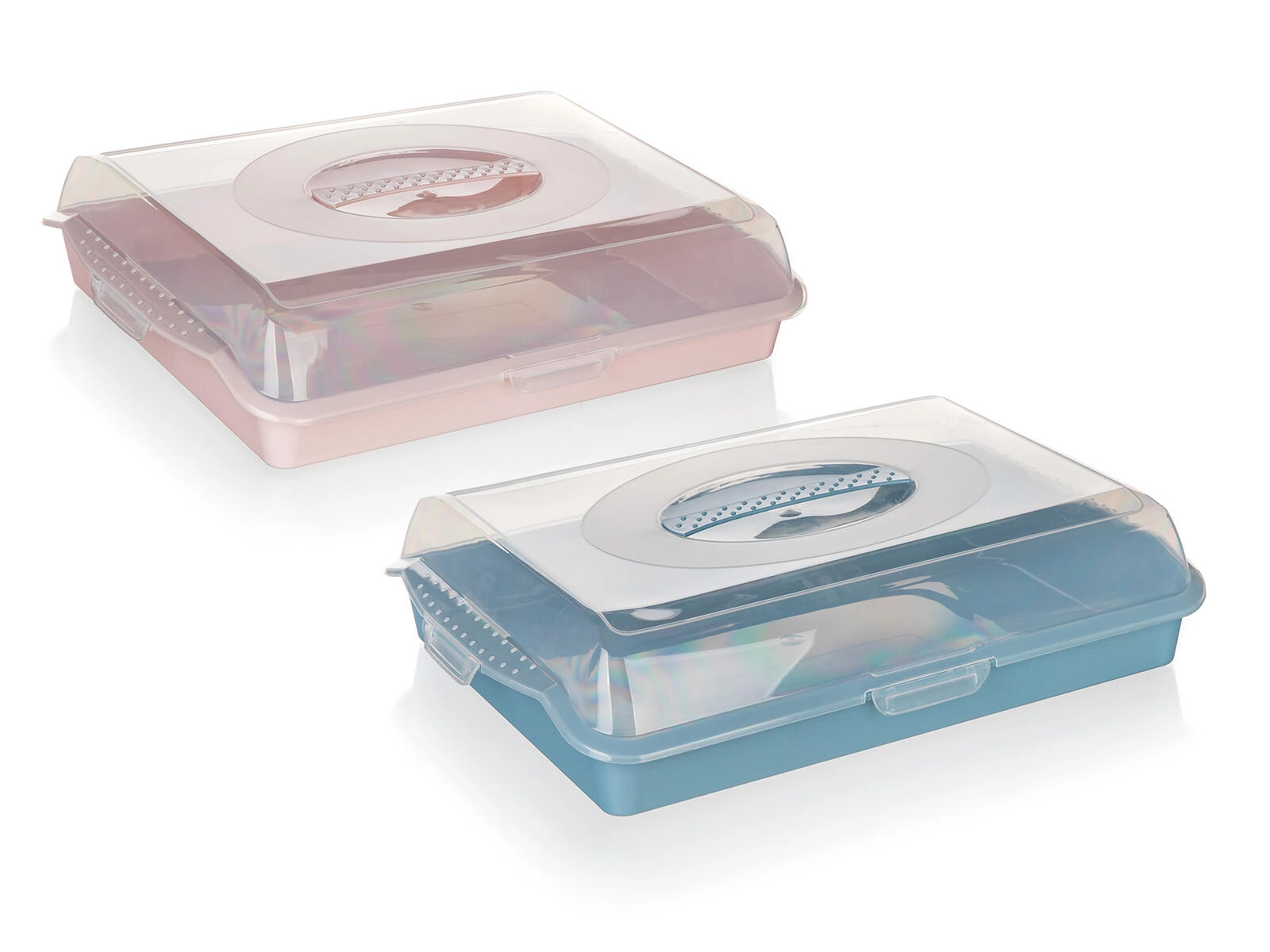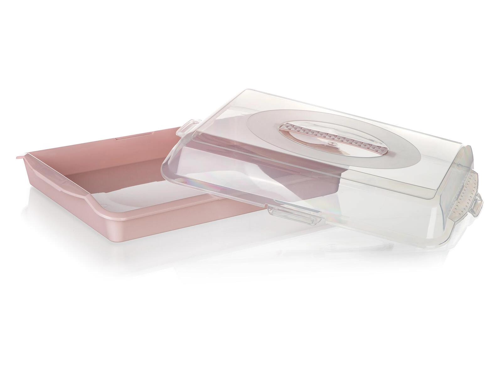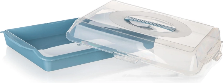Praktisches Kunststofftablett mit Deckel Culinaria mit den Maßen 45 × 35 × 10,5 cm ist ideal für die Mitnahme und Aufbewahrung von Kuchen, Torten und Gebäck. Der transparente Deckel mit sicheren Clips schützt den Inhalt vor Staub und Beschädigung, während das niedrige Profil ein komfortables Stapeln ermöglicht. Erhältlich im Farbmix – rosa und blau.