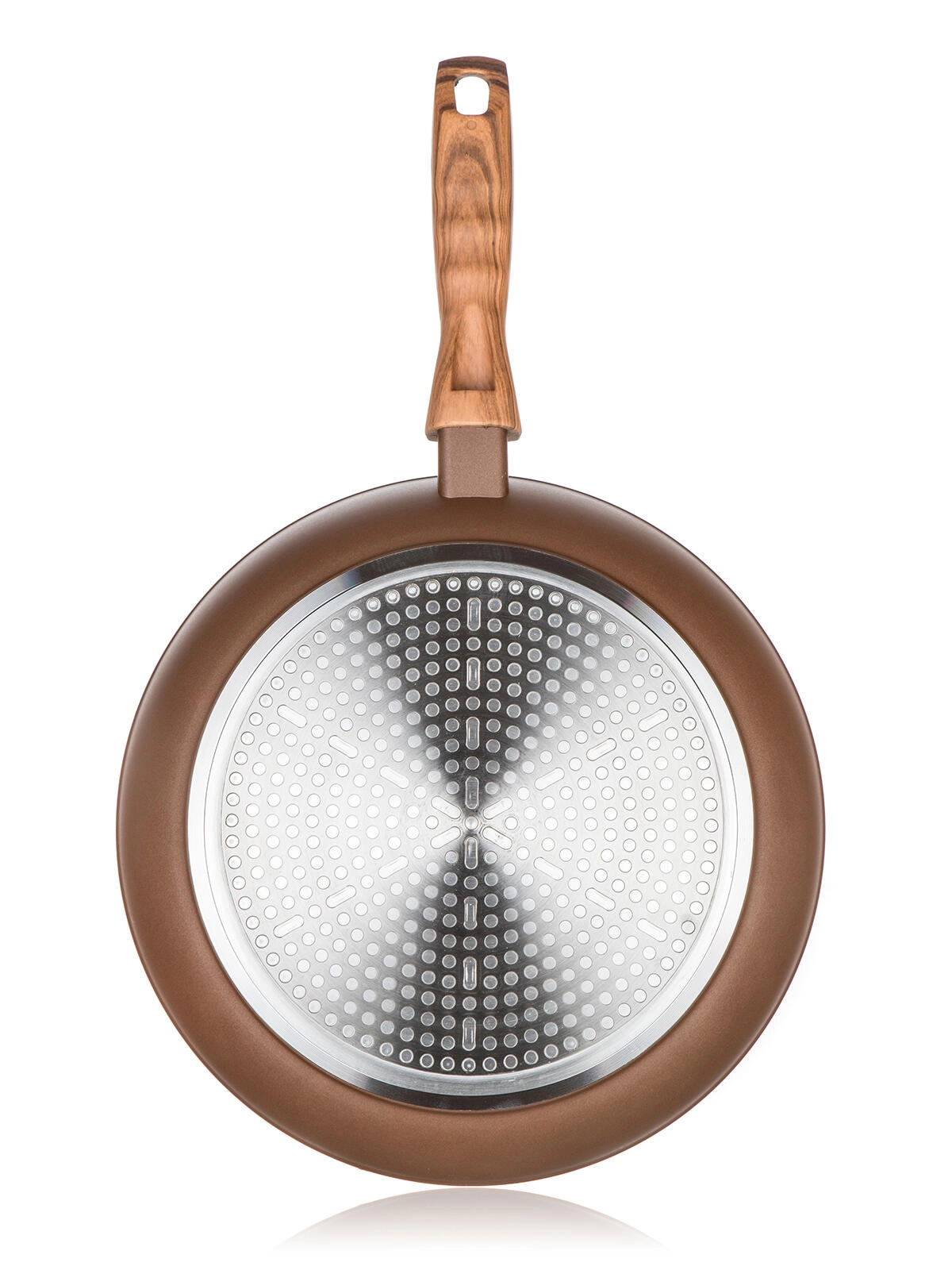 Universelle Pfanne mit 28 cm Durchmesser und zweilagiger Antihaftbeschichtung in Steinstruktur für gesundes Kochen mit minimalem Fett. Der geschmiedete Aluminiumkörper sorgt für eine schnelle und gleichmäßige Wärmeverteilung, der Induktionsboden bietet breite Kompatibilität und der ergonomische Soft-Touch-Griff in Holzdekor liegt angenehm und sicher in der Hand.