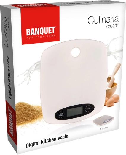 Die praktische und stilvolle digitale Waage BANQUET Culinaria Cream ist der ideale Helfer für tägliches Kochen und Backen. Dank des schlanken, flachen Designs lässt sie sich leicht verstauen, die cremefarbene Ausführung passt in jede Küche und das übersichtliche LCD-Display gewährleistet ein bequemes Ablesen.
